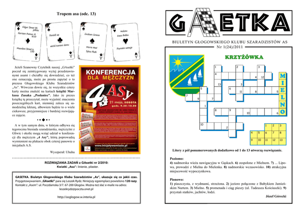 Tropem asa (odc. 13) ETKA G BIULETYN GŁOGOWSKIEGO KLUBU SZARADZISTÓW AS Nr 1(24)/2011 KRZYŻÓWKA Jeżeli Szanowny Czytelnik naszej „GAsetki” poczuł się zaintrygowany wyżej przedstawionymi asami i chciałby się dowiedzieć, co też one oznaczają, może po prostu zapytać o to prezesa Głogowskiego Klubu Szaradzistów „As”. Wówczas dowie się, że wszystkie cztery karty można znaleźć na kartach książki Markusa Zusaka „Posłaniec”. Jako że prezes książkę tę przeczytał, może wyjaśnić znaczenia poszczególnych kart, niemniej zaleca się samodzielną lekturę, albowiem będzie to o wiele ciekawsze, przyjemniejsze i bardziej rozwijające zajęcie. A w tym samym dniu, w którym odbywa się tegoroczna biesiada szaradziarska, mężczyźni z Gliwic i okolic mogą wziąć udział w konferencji dla mężczyzn „4 Asy”, którą poprowadzą wymienieni na plakacie obok czterej panowie o inicjałach A.S. Wyszperał: Uhuhu ROZWIĄZANIA ZADAŃ z GAsetki nr 2/2010: Kwiatki „Asa”: linienie, pilaster. GASETKA. Biuletyn Głogowskiego Klubu Szaradzistów „As”, ukazuje się co jakiś czas. Przygotowywaniem „GAsetki” para się Leszek Rydz. Niniejszy egzemplarz powielono 120 razy. Kontakt z „Asem”: ul. Poczdamska 3/7. 67-200 Głogów. Można też słać e-maile na adres: [email protected] http://asglogow.w.interia.pl 1 3 2 4 4 13 3 5 7 6 9 12 11 5 8 7 1 9 8 10 10 6 2 1 2 3 4 5 6 7 8 9 10 11 12 13 Litery z pól ponumerowanych dodatkowo od 1 do 13 utworzą rozwiązanie. Poziomo: 4) nadmorska wieża nawigacyjna w Gąskach. 6) zespolone z Mielnem. 7) ... Lipowa, prowadzi z Mielna do Mielenka. 8) nadmorskie wczasowisko. 10) atrakcyjna miejscowość wypoczynkowa. Pionowo: 1) piaszczysta, z wydmami, strzeżona. 2) jezioro połączone z Bałtykiem Jamieńskim Nurtem. 3) Mielno. 5) promenada i ciąg pieszy (ul. Tadeusza Kościuszki). 9) przystań statków, jachtów, łodzi. Józef Górecki Starty „Asa” w II połowie 2010 r. „As” w Łęknicy Poprzedni numer „GAsetki” ukazał się tuż przed VIII Szaradziarskimi Mistrzostwami Głogowa. Pora na wyniki. Turniej „tradycyjnie” wygrał Norbert Stawik z Poznania, wyprzedzając Marcina Zielińskiego z Warszawy i Rafała Tałaja z Częstochowy. Zwycięzca otrzymał Puchar Starosty Głogowskiego oraz nagrodę główną ufundowaną przez Prezydenta Miasta Głogowa – urządzenie wielofunkcyjne do komputera. Natomiast najlepszy głogowianin Franciszek Kamiński odebrał Puchar Dyrektora Miejskiego Ośrodka Kultury w Głogowie. Miejsca zajęte przez startujących członków naszego klubu: 25. Józef Jachowicz, 28. Hanna Świder, 31. Katarzyna Rozmus, 33. Józef Błażejewski. Wystartowało 41 osób. Pełną listę wyników można znaleźć na stronie internetowej naszego klubu. Podniosłe hasło „Niech się święci 1 maja!” po szaradziarsku wcielało w czyn 19 uczestników VIII Szaradziarskich Mistrzostw Łęknicy. Z zadaniami Leszka Rydza najlepiej poradził sobie Piotr Łojewski z Poznania. Na podium stanęła na 3 miejscu Teresa Czerwińska, nieco dalej 5 Józef Jachowicz i polkowiczanki Hanna Świder (6), Katarzyna Rozmus (7). Wszystkich rozgrzewała grochówka i malownicze nadafrykańskie (tak!) zakątki lokalnego geoparku. po którym oprowadził przybyłych główny organizator imprezy Roman Sobera. Jedno z zadań (jego bohaterem jest jeden z najulubieńszych pisarzy autora) prezentujemy poniżej. Diakrostych Trzecie litery odgadywanych słów utworzą nazwisko włoskiego pisarza, zaś wszystkie litery, napisane od 1 do 49, złożą się na tytuły jego sześciu książek (trzy tytuły w kratkach białych, trzy w kratkach niebieskich). 25 września w Lublinie odbył się XXXVI Turniej Kompozycji Krzyżówki. Zwyciężył Robert Górniak z Sosnowca, drugie miejsce zajął Leszek Rydz („As”). W XVII Mistrzostwach Warszawy (9 października) wystartował Józef Górecki, zajmując 37 miejsce. Zawody wygrał Jacek Laskowski. Marcin Zieliński zwyciężył w rozegranych 23 października III Mistrzostwach Poznania. Dwukrotnego mistrzowskiego tytułu nie zdołał obronić Leszek Rydz, który zajął drugie miejsce. 13 miejsce zajęła Teresa Czerwińska, w zawodach wystartowały także jeszcze trzy członkinie „Asa”, zajmując miejsca 28 (Hania), 30 (Kasia) i 39 (Krystyna). Natomiast w towarzyszącym turniejowi konkursie dodatkowym „Pyrrusjada” triumfował Michał Gargól z Pabianic. • Na listopadową „Randkę z Neptunem” wybrał się Józef Górecki i zajął 19 miejsce. Tematyka zadań ułożonych przez Grzegorza Chomicza dotyczyła szeroko pojętej miłości. Zwyciężyła Agnieszka Warwas z Poznania. 1 E 2 D 3 D 4 B 5 C 6 A 7 A 8 B 9 E 10 E 11 A 12 F 13 A 14 A 15 C 16 G 17 F 18 B 19 G 20 C 21 E 22 E 23 D 24 G 25 D 26 F 27 B 28 E 29 F 30 C 31 C 32 A 33 D 34 D 35 B 36 G 37 C 38 C 39 A 40 G 41 B 42 E 43 A 44 F 45 D 46 D 47 A 48 E 49 A A B C D E F G 7 43 11 39 32 49 47 41 8 27 35 18 4 20 37 15 30 38 5 31 2 33 45 23 46 3 34 25 28 10 1 9 22 21 48 42 44 17 29 26 12 36 40 24 16 19 13 6 14 A) naczynko z mlekiem obok filiżanki kawy. B) mecz koszykówki dzieli się na cztery ... C) pogląd religijny sprzeczny z dogmatami religii panującej. D) naśladowca. E) wzmacniane flekami (zdrobniale). F) na umór lub pusty żołądek – niezdrowe. G) potajemne porozumienie. „As” w 2011 r. (relacje Józefa Góreckiego) Rozpoczęcie nowego szaradziarskiego sezonu pucharowych zmagań nastąpiło jubileuszowymi XXV Mistrzostwami Krakowa (5 marca). Wirtualny puchar i tytuł mistrza zdobył był nie po raz pierwszy Leszek Rydz. Pyszne zadania smakowały wszystkim, podobnie jak obiad w restauracji „Invito” (niektórym pachniało „In vitro”), gdzie wśród 40 uczestników zasiedli 26. Zbigniew Kurowski i 29. Józef Górecki. Nie tylko morskim powietrzem częstowani byli uczestnicy XI Szaradziarskich Mistrzostw Gdańska w Brzeźnie (26 marca). Najlepiej z 39 osób wypadła Agnieszka Warwas z Poznania, a po r