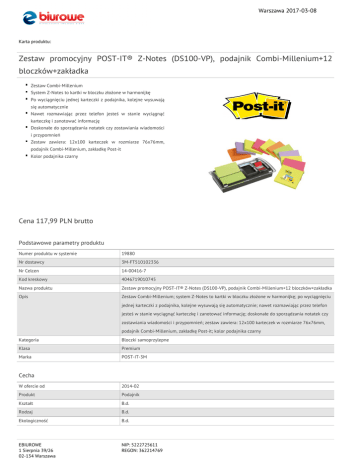 Warszawa 2017-03-08 Karta produktu: Zestaw promocyjny POST-IT® Z-Notes (DS100-VP), podajnik Combi-Millenium+12 bloczków+zakładka Zestaw Combi-Millenium System Z-Notes to kartki w bloczku złożone w harmonijkę Po wyciągnięciu jednej karteczki z podajnika, kolejne wysuwają się automatycznie Nawet rozmawiając przez telefon jesteś w stanie wyciągnąć karteczkę i zanotować informację Doskonałe do sporządzania notatek czy zostawiania wiadomości i przypomnień Zestaw zawiera: 12x100 karteczek w rozmiarze 76x76mm, podajnik Combi-Millenium, zakładkę Post-it Kolor podajnika czarny Cena 117,99 PLN brutto Podstawowe parametry produktu Numer produktu w systemie 19880 Nr dostawcy 3M-FT510102336 Nr Celcen 14-00416-7 Kod kreskowy 4046719010745 Nazwa produktu Zestaw promocyjny POST-IT® Z-Notes (DS100-VP), podajnik Combi-Millenium+12 bloczków+zakładka Opis Zestaw Combi-Millenium; system Z-Notes to kartki w bloczku złożone w harmonijkę; po wyciągnięciu jednej karteczki z podajnika, kolejne wysuwają się automatycznie; nawet rozmawiając przez telefon jesteś w stanie wyciągnąć karteczkę i zanotować informację; doskonałe do sporządzania notatek czy zostawiania wiadomości i przypomnień; zestaw zawiera: 12x100 karteczek w rozmiarze 76x76mm, podajnik Combi-Millenium, zakładkę Post-it; kolor podajnika czarny Kategoria Bloczki samoprzylepne Klasa Premium Marka POST-IT-3M Cecha W ofercie od 2014-02 Produkt Podajnik Kształt B.d. Rodzaj B.d. Ekologiczność B.d. EBIUROWE 1 Sierpnia 39/26 02-134 Warszawa NIP: 5222725611 REGON: 362214769 Warszawa 2017-03-08 Karta katalogowa produktu cd. Zestaw promocyjny POST-IT® Z-Notes (DS100-VP), podajnik Combi-Millenium+12 bloczków+zakładka Typ Standard Materiał Papier Ilość Ilość kartek 12x100 Wymiary Pojemność (mm) B.d. Rozmiar B.d. Szerokość (mm) B.d. Grubość (mm) B.d. Gramatura (g/m2) B.d. Wymiary (mm) 76x76 Wspólny słownik zamówień CPV 22816300-6 Bloczki samoprzylepnych karteczek na notatki Certyfikaty Nowy produkt w ofercie Standard Hit Standard Kolor Kolor Czarny Serdecznie zapraszamy do współpracy EBIUROWE zespół. EBIUROWE 1 Sierpnia 39/26 02-134 Warszawa NIP: 5222725611 REGON: 362214769