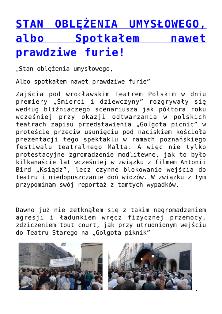 STAN OBLĘŻENIA UMYSŁOWEGO, albo Spotkałem nawet prawdziwe furie! „Stan oblężenia umysłowego, Albo spotkałem nawet prawdziwe furie” Zajścia pod wrocławskim Teatrem Polskim w dniu premiery „Śmierci i dziewczyny” rozgrywały się według bliźniaczego scenariusza jak półtora roku wcześniej przy okazji odtwarzania w polskich teatrach zapisu przedstawienia „Golgota picnic” w proteście przeciw usunięciu pod naciskiem kościoła prezentacji tego spektaklu w ramach poznańskiego festiwalu teatralnego Malta. A więc nie tylko protestacyjne zgromadzenie modlitewne, jak to było kilkanaście lat wcześniej w związku z filmem Antonii Bird „Ksiądz”, lecz czynne blokowanie wejścia do teatru i niedopuszczanie doń widzów. W związku z tym przypominam swój reportaż z tamtych wypadków. Dawno już nie zetknąłem się z takim nagromadzeniem agresji i ładunkiem wręcz fizycznej przemocy, zdziczeniem tout court, jak przy utrudnionym wejściu do Teatru Starego na „Golgota piknik” . Zacięte twarze niczym u Boscha . A najbardziej zawzięte były kobiety , rozjuszone furie, wywijające obuchową bronią, czyli krucyfiksami i drzewcami flag , a policja zdawała się raczej sprzyjać im w blokowaniu teatru i niedopuszczaniu chętnych do środka . Faceci ograniczali się do sarkastycznych w ich mniemaniu uwag: „Popatrz się, oni idą na piknik!”. Wznoszono też okrzyki przeciw gender, niechcący potwierdzając jedną z jego teorii, iż agresja nie jest wyłącznie cechą wrodzoną mężczyznom. Z perspektywy pierwszomajowych pikników z profesorstwem Senyszyn i Hartmannem rysował się całkiem inny, niestety nieprawdziwy, obraz świata, teraz zderzyłem się z nagą rzeczywistością. Prawdopodobnie prawdziwi wierzący nie biorą udziału w tego rodzaju ekscesach. To raczej awanturnicy, wykorzystujący każdą sytuację jako pretekst i okazję do wyżycia się, zwłaszcza że dawno nie było już wojny, kanalizującej tego rodzaju nastroje i napięcia (a działo się to akurat w przededniu stulecia Pierwszej), oraz sfrustrowani ludzie, chcący w ten sposób zaznaczyć swe istnienie. Niezamierzenie przyczynił się do tego J23 i jego sobór z nową architekturą kościołów, pozbawionych kaplic dla indywidualnej modlitwy i religijnej kontemplacji, na rzecz hal gromadzących zbiorowość, mającą stać się wspólnotą, a wyrabiającą w sobie raczej więzi stadne. Skądinąd przypominam, że słowo religio oznacza więź. Przypomina się Opowieść Wielkiego Inkwizytora z „Braci Karamazow”, który dla dobra kościoła Chrystusa musi skazać jego samego, gdy ponownie zjawia się na Ziemi. Okazuje się, że to nie tylko antykatolickie resentymenty Dostojewskiego. Również wczoraj te menady rozszarpałyby Chrystusa, niczym Penteusza, gdyby chciał dostać się do środka Starego Teatru. Swego czasu Konrad Swinarski planował przypuszczenie szturmu na Stary Teatr i jego zdobycie przez wojska Fortynbrasa w inscenizacji „Hamleta” (nieukończonej z uwagi na tragiczną śmierć). Można by zatem uznać oblegających teatr za wypełniających zamierzenia twórcze Konrada Swinarskiego gdyby nie to, że zapewne nic o nich nie słyszeli, a może nawet i o samym Konradzie Swinarskim. „Golgota piknik”, autorskie przedstawienie Rodriga Garcii nie jest wielką sztuką, zasługującą na kruszenie kopii i rozbudzanie takich emocji. Jest on lepszym dramatopisarzem niż reżyserem. Dramat posiada niewątpliwie autonomiczne wartości literackie, zwłaszcza liryczne (podobnie jak wcześniejszy „Król Lear”, nie mający nic wspólnego z Szekspirowskim), ale bardziej nadaje się na ścieżkę dźwiękową do obrazów filmowych w rodzaju „Koyanisqatsi” Godfreya Reggio czy „Nagiej wyspy” Kaneto Shindo, lub do posłużenia za kanwę do libretta operowego, choć Paweł Mykietyn w „Królu Learze” tego samego autora temu wyzwaniu nie sprostał. Teksty Garcii nie posiadają charakteru dyskursywnego, a tym bardziej publicystycznego. Przypominają swym ukształtowaniem raczej formę muzyczną, z jej refreniczną powtarzalnością oraz przetworzeniami przywołanych motywów i wątków (tematów), nie tworzących jednak ciągłości fabularnej, ani nie rządzących się jej prawami. Powraca wątek katastrofy samochodowej, znany z „Króla Leara”: mp3 grający po niej nadal „Pasję Mateuszową” Bacha, a także obrazu Rembrandta z jego psem, a przedstawiającego Ukrzyżowanie Wątek ewangeliczny wskazuje jak wciąż ważną rolę odgrywa postać Jezusa w zachodniej kulturze i twórczości współczesnych artystów, nawet traktowana krytycznie, co przeciwnicy powinni raczej uznać za sukces swojej religii. Niektóre ustępy przypominają „Pasję” Gibsona (storturowane ciało Jezusa), ale w odbiorze liczy się intencja, a nie tylko zbieżności ikonograficzne. Występują też konsumpcjonizmu, krytyczne nawiązania do a w warstwie ikonograficznej odpowiadają temu odwołania do wiedeńskich akcjonistów oraz przedstawienia Performance Group w reż. Richarda Schechnera „Dionysus in ‘69”, co znów posiada szersze odniesienia kulturowe, tym razem do Wajdy i jego „Piłata i innych”, a więc Golgoty, usytuowanej na wysypisku śmieci, obok autostrady, i turpistycznego obrazu Jezusa, umierającego oblepionym rojem much. Zakończenie z grającym ad libitum nagim pianistą nawiązuje do recitalu Friedricha Guldy i jego ówczesnej życiowej partnerki Ursuli Anders, wykonujących nago w austriackiej telewizji „Liederkreis” Roberta Schumanna. W ten sposób przedstawienie posiada otwarty charakter, pozostawiający zniecierpliwionej publiczności wybór momentu jego zakończenia poprzez oklaski, przerywające dalszy ciąg akcji? Oto spisane naprędce uwagi. Później pokuszę się o napisanie i opublikowanie czegoś bardziej pogłębionego. Tymczasem „do zobaczenia w piekle!”. Niestety, nie jest to moje, lecz cytat z profesor Alicji Helman. EKUMENIZM? CZY JE