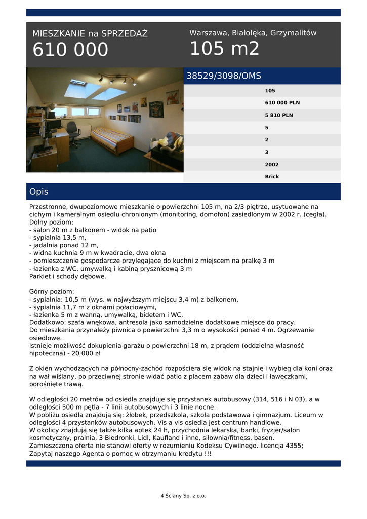 MIESZKANIE na SPRZEDAŻ 610 000 Warszawa, Białołęka, Grzymalitów 105 m2 38529/3098/OMS 105 610 000 PLN 5 810 PLN 5 2 3 2002 Brick Opis Przestronne, dwupoziomowe mieszkanie o powierzchni 105 m, na 2/3 piętrze, usytuowane na cichym i kameralnym osiedlu chronionym (monitoring, domofon) zasiedlonym w 2002 r. (cegła). Dolny poziom: - salon 20 m z balkonem - widok na patio - sypialnia 13,5 m, - jadalnia ponad 12 m, - widna kuchnia 9 m w kwadracie, dwa okna - pomieszczenie gospodarcze przylegające do kuchni z miejscem na pralkę 3 m - łazienka z WC, umywalką i kabiną prysznicową 3 m Parkiet i schody dębowe. Górny poziom: - sypialnia: 10,5 m (wys. w najwyższym miejscu 3,4 m) z balkonem, - sypialnia 11,7 m z oknami połaciowymi, - łazienka 5 m z wanną, umywalką, bidetem i WC, Dodatkowo: szafa wnękowa, antresola jako samodzielne dodatkowe miejsce do pracy. Do mieszkania przynależy piwnica o powierzchni 3,3 m o wysokości ponad 4 m. Ogrzewanie osiedlowe. Istnieje możliwość dokupienia garażu o powierzchni 18 m, z prądem (oddzielna własność hipoteczna) - 20 000 zł Z okien wychodzących na północny-zachód rozpościera się widok na stajnię i wybieg dla koni oraz na wał wiślany, po przeciwnej stronie widać patio z placem zabaw dla dzieci i ławeczkami, porośnięte trawą. W odległości 20 metrów od osiedla znajduje się przystanek autobusowy (314, 516 i N 03), a w odległości 500 m pętla - 7 linii autobusowych i 3 linie nocne. W pobliżu osiedla znajdują się: żłobek, przedszkola, szkoła podstawowa i gimnazjum. Liceum w odległości 4 przystanków autobusowych. Vis a vis osiedla jest centrum handlowe. W okolicy znajdują się także kilka aptek 24 h, przychodnia lekarska, banki, fryzjer/salon kosmetyczny, pralnia, 3 Biedronki, Lidl, Kaufland i inne, siłownia/fitness, basen. Zamieszczona oferta nie stanowi oferty w rozumieniu Kodeksu Cywilnego. licencja 4355; Zapytaj naszego Agenta o pomoc w otrzymaniu kredytu !!! 4 Ściany Sp. z o.o. 4 Ściany Sp. z o.o. tel. 22 629 80 80 email: [email protected] 4 Ściany Sp. z o.o. Powered by TCPDF (www.tcpdf.org)