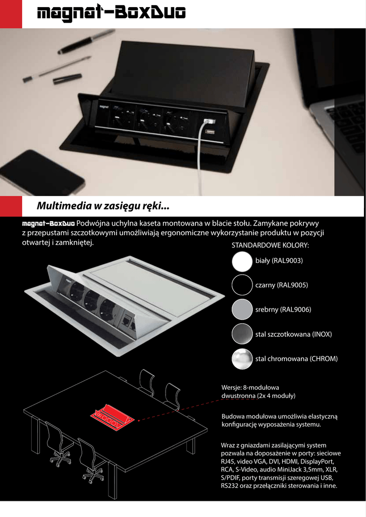 magnat-BoxDuo Multimedia w zasięgu ręki... magnat-BoxDuo Podwójna uchylna kaseta montowana w blacie stołu. Zamykane pokrywy z przepustami szczotkowymi umożliwiają ergonomiczne wykorzystanie produktu w pozycji otwartej i zamkniętej. STANDARDOWE KOLORY: biały (RAL9003) czarny (RAL9005) srebrny (RAL9006) stal szczotkowana (INOX) stal chromowana (CHROM) Wersje: 8-modułowa dwustronna (2x 4 moduły) Budowa modułowa umożliwia elastyczną konfigurację wyposażenia systemu. Wraz z gniazdami zasilającymi system pozwala na doposażenie w porty: sieciowe RJ45, video VGA, DVI, HDMI, DisplayPort, RCA, S-Video, audio MiniJack 3,5mm, XLR, S/PDIF, porty transmisji szeregowej USB, RS232 oraz przełączniki sterowania i inne. 1 2 3 4 magnat magnat 6 7 8 284,0 mm 5 259,0 mm Wymiary otworu montażowego: X Y 241mm – 246mm 276 mm - 277 mm X Dobór i konfiguracje wyposażenia w moduły zasilania oraz moduły multimedialne. Y Montaż wsporników do kasety osadzonej w otworze wyciętym w balcie i montaż śrubami M5 z blatem. 1 66,5 mm max. 30 mm 2 276,0 mm 66,5 mm max. 30 mm Montaż do blatu o grubości do 30 mm. 276,0 mm 66,5 mm max. 50 mm Montaż do blatu o grubości do 50 mm. ver.20161008 MAXBERT s.c., ul. Krakowiaków 80/98, 02-255 Warszawa, tel. +48 22 490 38 38, www.maxbert.pl m 0 mm 276,0 mm