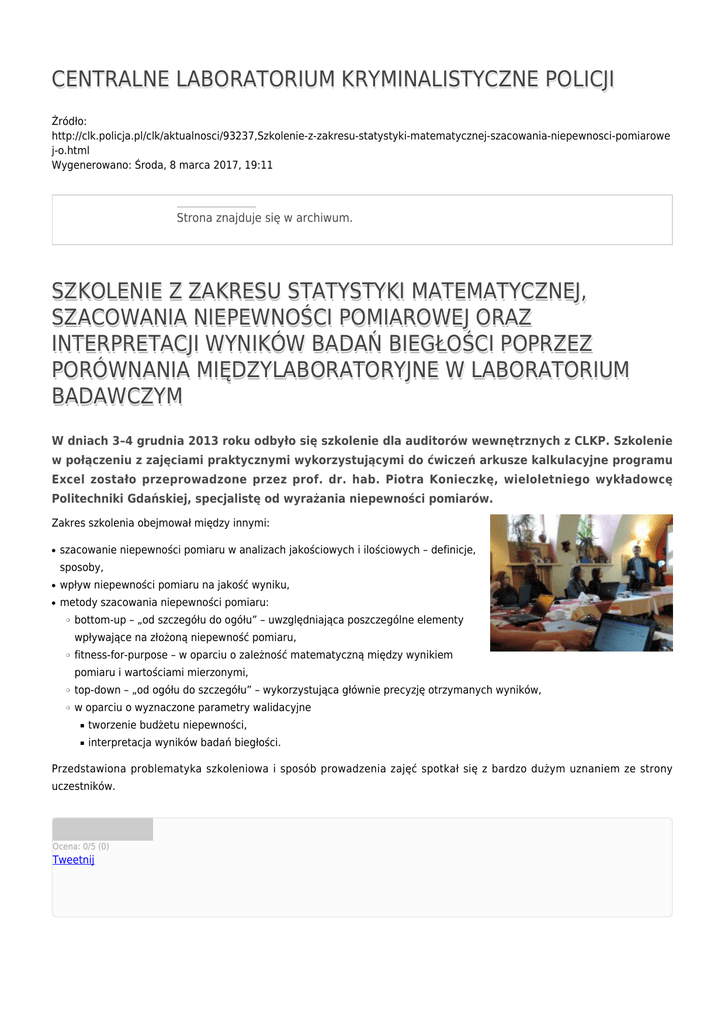 CENTRALNE LABORATORIUM KRYMINALISTYCZNE POLICJI Źródło: http://clk.policja.pl/clk/aktualnosci/93237,Szkolenie-z-zakresu-statystyki-matematycznej-szacowania-niepewnosci-pomiarowe j-o.html Wygenerowano: Środa, 8 marca 2017, 19:11 Strona znajduje się w archiwum. SZKOLENIE Z ZAKRESU STATYSTYKI MATEMATYCZNEJ, SZACOWANIA NIEPEWNOŚCI POMIAROWEJ ORAZ INTERPRETACJI WYNIKÓW BADAŃ BIEGŁOŚCI POPRZEZ PORÓWNANIA MIĘDZYLABORATORYJNE W LABORATORIUM BADAWCZYM W dniach 3–4 grudnia 2013 roku odbyło się szkolenie dla auditorów wewnętrznych z CLKP. Szkolenie w połączeniu z zajęciami praktycznymi wykorzystującymi do ćwiczeń arkusze kalkulacyjne programu Excel zostało przeprowadzone przez prof. dr. hab. Piotra Konieczkę, wieloletniego wykładowcę Politechniki Gdańskiej, specjalistę od wyrażania niepewności pomiarów. Zakres szkolenia obejmował między innymi: ● szacowanie niepewności pomiaru w analizach jakościowych i ilościowych – definicje, sposoby, ● wpływ niepewności pomiaru na jakość wyniku, ● metody szacowania niepewności pomiaru: ❍ bottom-up – „od szczegółu do ogółu” – uwzględniająca poszczególne elementy wpływające na złożoną niepewność pomiaru, ❍ fitness-for-purpose – w oparciu o zależność matematyczną między wynikiem pomiaru i wartościami mierzonymi, ❍ top-down – „od ogółu do szczegółu” – wykorzystująca głównie precyzję otrzymanych wyników, ❍ w oparciu o wyznaczone parametry walidacyjne ■ tworzenie budżetu niepewności, ■ interpretacja wyników badań biegłości. Przedstawiona problematyka szkoleniowa i sposób prowadzenia zajęć spotkał się z bardzo dużym uznaniem ze strony uczestników. Ocena: 0/5 (0) Tweetnij