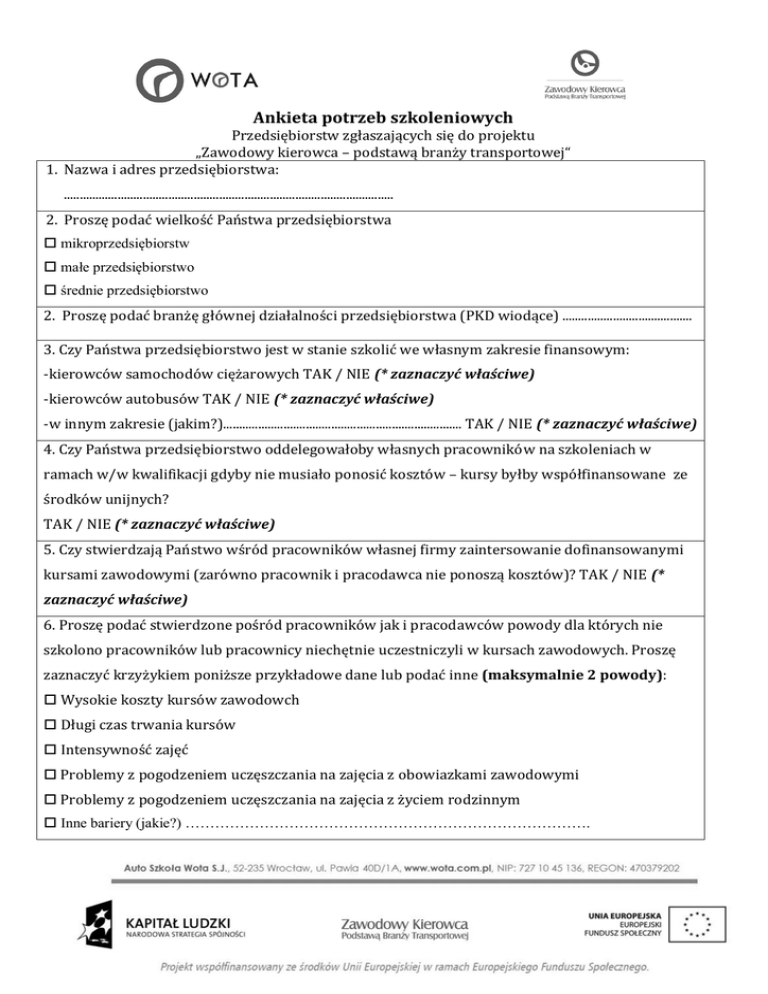 Ankieta potrzeb szkoleniowych Przedsiębiorstw zgłaszających się do projektu „Zawodowy kierowca – podstawą branży transportowej“ 1. Nazwa i adres przedsiębiorstwa: ........................................................................................................ 2. Proszę podać wielkość Państwa przedsiębiorstwa mikroprzedsiębiorstw małe przedsiębiorstwo średnie przedsiębiorstwo 2. Proszę podać branżę głównej działalności przedsiębiorstwa (PKD wiodące) ......................................... 3. Czy Państwa przedsiębiorstwo jest w stanie szkolić we własnym zakresie finansowym: -kierowców samochodów ciężarowych TAK / NIE (* zaznaczyć właściwe) -kierowców autobusów TAK / NIE (* zaznaczyć właściwe) -w innym zakresie (jakim?)........................................................................... TAK / NIE (* zaznaczyć właściwe) 4. Czy Państwa przedsiębiorstwo oddelegowałoby własnych pracowników na szkoleniach w ramach w/w kwalifikacji gdyby nie musiało ponosić kosztów – kursy byłby współfinansowane ze środków unijnych? TAK / NIE (* zaznaczyć właściwe) 5. Czy stwierdzają Państwo wśród pracowników własnej firmy zaintersowanie dofinansowanymi kursami zawodowymi (zarówno pracownik i pracodawca nie ponoszą kosztów)? TAK / NIE (* zaznaczyć właściwe) 6. Proszę podać stwierdzone pośród pracowników jak i pracodawców powody dla których nie szkolono pracowników lub pracownicy niechętnie uczestniczyli w kursach zawodowych. Proszę zaznaczyć krzyżykiem poniższe przykładowe dane lub podać inne (maksymalnie 2 powody): Wysokie koszty kursów zawodowch Długi czas trwania kursów Intensywność zajęć Problemy z pogodzeniem uczęszczania na zajęcia z obowiazkami zawodowymi Problemy z pogodzeniem uczęszczania na zajęcia z życiem rodzinnym Inne bariery (jakie?) ………………………………………………………………………. 7. Proszę wskazać, jakim rodzajem szkoleń są zainteresowani pracownicy Państwa przedsiębiorstwa? (maksymalnie 2 rodzaje): prawo jazdy kat. C prawo jazdy kat. CE prawo jazdy kat. D Kwalifikacja Wstępna Przyspieszona (przewóz rzeczy) Kwalifikacja Wstępna Przyspieszona (przewóz osób) inne (jakie?) ………………………………………………………………. 8. Proszę wskazać, jakie rodzaje szkoleń są najważniejsze w perspektywie rozwoju Państwa przedsiębiorstwa? (maksymalnie 2 rodzaje): prawo jazdy kat. C prawo jazdy kat. CE prawo jazdy kat. D Kwalifikacja Wstępna Przyspieszona (przewóz rzeczy) Kwalifikacja Wstępna Przyspieszona (przewóz osób) inne (jakie?) ………………………………………………………………. 9. Proszę wskazać, jakie oczekiwania wiąże Państwa przedsiębiorstwo z uczestnictwem jego pracowników w projekcie? (maksymalnie 2 rodzaje): pracownicy zdobędą nowe kompetencje przydatne z perspektywy przedsiębiorstwa przedsiębiorstwo, dzięki nowo wyszkolonym pracownikom, uzyska lepszą pozycję na rynku transportowym będzie to szansa na rozwój przedsiębiorstwa jest to inwestycja w potencjał firmy inne (jakie?) ………………………………………………………………. inne (jakie?) ………………………………………………………………. 10. Proszę wpisać to, co uważacie Państwo za istotne w kontekście Państwa potrzeb szkoleniowych, a co nie znalazło się w powyższej ankiecie ……………………………………………………………………………………………………………….. ……………………………………………………………………………………………………………….. ……………………………………………………………………………………………………………….. ……………………………………………………………………………………………………………….. Dziękujemy za wypełnienie ankiety!!