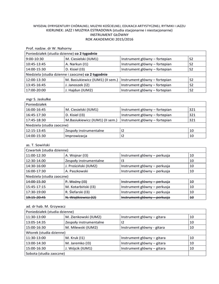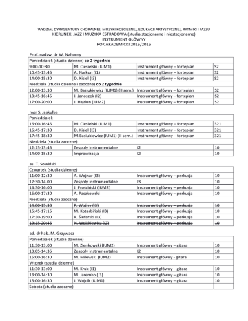 WYDZIAŁ DYRYGENTURY CHÓRALNEJ, MUZYKI KOŚCIELNEJ, EDUKACJI ARTYSTYCZNEJ, RYTMIKI I JAZZU KIERUNEK: JAZZ I MUZYKA ESTRADOWA (studia stacjonarne i niestacjonarne) INSTRUMENT GŁÓWNY ROK AKADEMICKI 2015/2016 Prof. nadzw. dr W. Nahorny Poniedziałek (studia dzienne) co 2 tygodnie 9:00-10:30 M. Ciesielski (IUM1) 10:45-13:45 A. Narkun (I1) 14:00-15:30 D. Kisiel (I3) Niedziela (studia dzienne i zaoczne) co 2 tygodnie 12:00-13:30 M. Basiukiewicz (IUM1) (II sem.) 13:45-16:45 J. Janoszek (I2) 17:00-20:00 J. Hajdun (IUM2) mgr S. Jaskułke Poniedziałek 16:00-16:45 M. Ciesielski (IUM1) 16:45-17:30 D. Kisiel (I3) 17:45-18:30 M.Basiukiewicz (IUM1) (II sem.) Niedziela (studia zaoczne) 12:15-13:45 Zespoły instrumentalne 14:00-15:30 Improwizacja as. T. Sowiński Czwartek (studia dzienne) 11:00-12:30 A. Wojnar (I3) 12:30-14.00 Zespoły instrumentalne 14:30-16:00 J. Prościński (IUM2) 16:00-17:30 A. Paszkowski Niedziela (studia zaoczne) 14:00-15:30 P. Woźny (I3) 15:45-17:15 M. Kotarbiński (I3) 17:30-19:00 R. Ślefarski (I3) 19:15-20:45 N. Wojtkiewicz (I2) ad. dr hab. M. Grzywacz Poniedziałek (studia dzienne) 11:30-13:00 M. Zienkowski (IUM2) 13:05-14:35 Zespoły instrumentalne 15:00-16:30 M. Milewski (IUM2) Wtorek (studia dzienne) 11:30-13:00 M. Kruk (I1) 13:00-14:30 M. Jaremko (I3) 15:00-16:30 J. Wójcik (IUM1) Sobota (studia zaoczne) Instrument główny – fortepian Instrument główny – fortepian Instrument główny – fortepian S2 S2 S2 Instrument główny – fortepian Instrument główny – fortepian Instrument główny – fortepian S2 S2 S2 Instrument główny – fortepian Instrument główny – fortepian Instrument główny – fortepian 321 321 321 I2 I2 10 10 Instrument główny – perkusja I3 Instrument główny – perkusja Instrument główny – perkusja 10 10 10 10 Instrument główny – perkusja Instrument główny – perkusja Instrument główny – perkusja Instrument główny – perkusja 10 10 10 10 Instrument główny – gitara I2 Instrument główny - gitara 10 10 10 Instrument główny – gitara Instrument główny – gitara Instrument główny – gitara 10 10 10 09:30-11:00 12:45-14:15 14:30-16:00 16:15-17:45 17:50-19:20 A. Pacak (I3) B. Wnuk (I3) M. Biesek (I2) P. Nabrdalik (I2) Zespoły instrumentalne as. dr P. Kułakowski Wtorek (studia dzienne) 16:30-18:00 P. Szajrych (I3) 18:00-19.30 F. Arasimowicz (I2) Środa (studia dzienne) 10:30-12:00 Studia orkiestrowe 12:00-13:30 Zespoły instrumentalne 13:45-15:15 S. Zalewski (I1) 15:15-16:45 J. Kisielewicz (IUM1) Sobota (studia zaoczne) 14:30-16:00 S. Kiziński (I1) 17:50-19:20 Zespoły instrumentalne dr J. Freicher Czwartek (studia dzienne) 15:00-16:30 P. Witulski (IUM1) 16:45-18:15 I. Gajewski (I2) Prof. zw. dr hab. Leszek Kułakowski Poniedziałek 9:00-13:00 Big Band 13:30-14:15 P. Witulski (IUM1) 14:15-15:00 E. Miszk (IUM1) 15:15-16:00 Zhang Yuyun (IUM1) 16:00-16:45 J. Wójcik (IUM1) 16:45-17:30 M. Basiukiewicz (IUM1) 17:45-18:30 Zhang Yuheng (IUM1) Wtorek 9:00-13:00 Big Band 13:30-14:15 J. Hajdun (IUM1) 14:15-15:00 M. Chorążewicz (IUM1) 15:00-15:45 J. Kisielewicz (IUM1) 16:15-17:00 J. Janoszek/J. Makowski (I2) 17:00-17:45 B. Sadok/A. Paszkowski (I2) Środa 9:40-10:25 F. Arasimowicz/I. Gajewski (I2) 13:00-14:30 P. Porszke (KA3) 15:00-16:30 P. Wysocki (KA3) 16:30-18:00 K. Piotrowicz (KA3) Instrument główny – gitara Instrument główny – gitara Instrument główny – gitara Instrument główny – gitara I3 409 409 409 409 410 Instrument główny – kontrabas Instrument główny – kontrabas 10 10 sekcja akompaniująca (I1,2,UM1, UM2) I1 Instrument główny – gitara basowa Instrument główny – gitara basowa 10 10 10 10 Instrument główny – gitara basowa I1 10 10 Instrument główny – wibrafon Instrument główny – wibrafon 410 410 ALL Prop. kompozycji i aranż. (I sem.) Prop. kompozycji i aranż. (I sem.) Prop. kompozycji i aranż. (I sem.) Prop. kompozycji i aranż. (I sem.) Prop. kompozycji i aranż. (II sem.) Prop. kompozycji i aranż. (I sem.) S. KONC. 415 415 415 415 415 415 ALL Prop. kompozycji i aranż. (I sem.) Prop. kompozycji i aranż. (I sem.) Prop. kompozycji i aranż. (I sem.) Prop. kompozycji i aranż. (II sem.) Prop. kompozycji i aranż. (II sem.) S.KONC. 415 415 415 415 415 Prop. kompozycji i aranż. (II sem.) Kompozycja i aranżacja Kompozycja i aranżacja Kompozycja i aranżacja 415 415 415 415 ad. dr J. Małek Środa (studia dzienne) 08:50-10:20 10:25-11:55 12:00-13:30 14:35-15:20 15:20-16:05 A. Skorczewski (I1) M. Grabarz (I3) E. Miszk (IUM1) J. Szczurek (KA2) Analiza improwizacji jazzowej Instrument główny – trąbka Instrument główny – trąbka Instrument główny – trąbka Fakultet – I sem. IUM1 414 414 414 414 410 II instrument Instrument główny – saksofon Instrument główny – saksofon Instrument główny – saksofon Instrument główny – saksofon Instrument główny – saksofon 410 410 410 410 410 410 Zespoły instrumentalne Interpretacja piosenki Improwizacja Improwizacja IUM2 WUM1 I2 (I sem.) I1 410 S2 410 410 A. Czernysz (I3) W. Ulanowski (I1) Instrument główny – akordeon Instrument główny – akordeon 10 10 mgr A. Wendt Czwartek (studia dzienne) 8:30-10:00 Zhang Yuheng (IUM1) 10:00-11:30 Zespoły instrumentalne Instrument główny – saksofon IUM1+IUM2 410 410 mgr M. Obara Wtorek (studia dzienne) 14:00-15:30 J. Klemensiewicz (I1) 16:00-17:30 M. Chorążewicz (IUM1) 17:30-19:00 A. Szajna (I1) Instrument główny – saksofon Instrument główny – saksofon Instrument główny – saksofon 410 410 410 mgr A. Tomaszewska Poniedziałek (studia dzienne) 14:40-16:10 S. Sutor (KAUM1) 16:15-17:30 J. Szczurek (KA2) Kompozycja i aranżacja Kompozycja i aranżacja 219 219 mgr J. Konop Środa (studia dzienne) 10:30-12:00 Studia orkiestrowe sekcja dęta (I1,2,UM1, UM2) 410 dr M. Sikała Poniedziałek (studia dzienne) 12:30-13:15 K. Wysocki (KA3) 13:15-14:45 T. Klepczyński (IUM2) 14:45-16:15 B. Sadok (I2) 16:30-18:00 A. Wysocki (I1) 18:00-19:30 