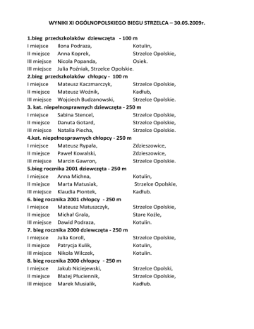 WYNIKI XI OGÓLNOPOLSKIEGO BIEGU STRZELCA – 30.05.2009r. 1.bieg przedszkolaków dziewczęta - 100 m I miejsce Ilona Podraza, Kotulin, II miejsce Anna Koprek, Strzelce Opolskie, III miejsce Nicola Popanda, Osiek. III miejsce Julia Poźniak, Strzelce Opolskie. 2.bieg przedszkolaków chłopcy - 100 m I miejsce Mateusz Kaczmarczyk, Strzelce Opolskie, II miejsce Mateusz Woźnik, Kadłub, III miejsce Wojciech Budzanowski, Strzelce Opolskie. 3. kat. niepełnosprawnych dziewczęta - 250 m I miejsce Sabina Stencel, Strzelce Opolskie, II miejsce Danuta Gotard, Strzelce Opolskie, III miejsce Natalia Piecha, Strzelce Opolskie. 4.kat. niepełnosprawnych chłopcy - 250 m I miejsce Mateusz Rypała, Zdzieszowice, II miejsce Paweł Kowalski, Zdzieszowice, III miejsce Marcin Gawron, Strzelce Opolskie. 5.bieg rocznika 2001 dziewczęta - 250 m I miejsce Anna Michna, Kotulin, II miejsce Marta Matusiak, Strzelce Opolskie, III miejsce Klaudia Piontek, Kadłub. 6. bieg rocznika 2001 chłopcy - 250 m I miejsce Mateusz Matuszczyk, Strzelce Opolskie, II miejsce Michał Grala, Stare Koźle, III miejsce Dawid Podraza, Kotulin. 7. bieg rocznika 2000 dziewczęta - 250 m I miejsce Julia Koroll, Strzelce Opolskie, II miejsce Patrycja Kulik, Kotulin, III miejsce Nikola Wilczek, Kotulin. 8. bieg rocznika 2000 chłopcy - 250 m I miejsce Jakub Niciejewski, Strzelce Opolski, II miejsce Błażej Płuciennik, Strzelce Opolskie, III miejsce Marek Musialik, Kadłub. 9. bieg rocznika 1999 dziewczęta - 250 m I miejsce Paulina Deja, Osiek, II miejsce Joanna Adamietz, Kadłub, III miejsce Karolina Bąk, Strzelce Opolskie. 10. bieg rocznika 1999 chłopcy - 250 m I miejsce Janusz Czernous, Strzelce Opolskie, II miejsce Piotr Strzelecki, Strzelce Opolskie, III miejsce Łukasz Ochwat, Grodzisko. 11. kat. niepełnosprawnych dziewczęta -500 m I miejsce Dominika Szczecińska, Strzelce Opolski, II miejsce Nikola Blaucik, Zdzieszowice, III miejsce Teresa Czaja, Strzelce Opolskie. 12. kat. niepełnosprawnych chłopcy - 500 m I miejsce Kamil Ropiński, Strzelce opolskie, II miejsce Bogdan Zabel, Strzelce Opolskie, III miejsce Krzysztof Hatlapa, Strzelce Opolskie. 13.bieg rocznika 1998 dziewczęta - 500 m I miejsce Katarzyna Podraza, Ligota Toszecka, II miejsce Kinga Michna, Kotulin, III miejsce Magdalena Szufla, Szymiszów. 14. bieg rocznika 1998 chłopcy - 500 m I miejsce Maciej Kaniewski, Błotnica Strzelecka, II miejsce Jan Malcherczyk, Szymiszów, III miejsce Paweł Ochwat, Dziewkowice. 15. bieg rocznika 1997 dziewczęta - 500 m I miejsce Paulin Bielecka, Strzelce opolskie, II miejsce Wiktoria Tischbier, Kotulin, III miejsce Liana Anioł, Kotulin. 16. bieg rocznika 1997 chłopcy - 500 m I miejsce Janusz Wilczek, Kotulin, II miejsce Patryk Adamski, Strzelce Opolskie, III miejsce Krystian Geisler, Kotulin. 17.bieg rocznika 1996 dziewczęta - 500 m I miejsce Małgorzata Grala, Stare Koźle, II miejsce Dominika Auer, Strzelce Opolskie, III miejsce Sara Zimon, Sucha. 18. bieg rocznika 1996 chłopcy - 500 m I miejsce Dawid Wilczek, Kotulin, II miejsce Łukasz Firuta, Strzelce Opolskie, III miejsce Dawid Mika, Kadłub. 19. bieg rocznika 1995 dziewczęta - 1000 m I miejsce Agnieszka Duda, Strzelce Opolskie, II miejsce Magdalena Żurek, Strzelce Opolskie, III miejsce Agnieszka Mehlich, Strzelce Opolskie. 20. bieg rocznika 1995 chłopców - 1000 m I miejsce Mateusz Weiss, Jemielnica, II miejsce Piotr Leś, Szymiszów. 21. bieg rocznika 1994 dziewczęta - 1000 m I miejsce Magdalena Chuchel, Strzelce Opolskie, II miejsce Ewelina Sładek, Szymiszów, III miejsce Natalia Zaborska, Strzelce Opolskie. 22. bieg rocznika 1994 chłopcy - 1000 m I miejsce Szymon Halczak, Kędzierzyn Koźle, II miejsce Miczał Szubrycht, Szymiszów, III miejsce Paweł Pasierbski, Strzelce Opolskie. 23. bieg rocznika 1993 dziewczęta - 1000 m I miejsce Ada Koik, Strzelce Opolskie, II miejsce Agata Tarlińska, Szymiszów. 24. bieg rocznika 1993 chłopcy - 1000 m I miejsce Michał Duk, Strzelce Opolskie, II miejsce Damian Dobrowolski, Szymiszów, III miejsce Piotr Sdzuj, Strzelce Opolskie.