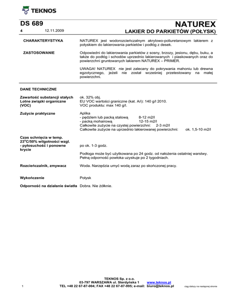 DS 689 NATUREX 12.11.2009 4 LAKIER DO PARKIETÓW (POŁYSK) CHARAKTERYSTYKA NATUREX jest wodorozcieńczalnym akrylowo-poliuretanowym lakierem z połyskiem do lakierowania parkietów i podłóg z desek. ZASTOSOWANIE Odpowiedni do lakierowania parkietów z sosny, brzozy, jesionu, dębu, buku, a także do podłóg i schodów uprzednio lakierowanych i piaskowanych oraz do powierzchni gruntowanych lakierem NATUREX – PRIMER. UWAGA! NATUREX nie jest zalecany do pokrywania mahoniu lub drewna egzotycznego, jeżeli nie został wcześniej przetestowany na małej powierzchni. DANE TECHNICZNE Zawartość substancji stałych Lotne związki organiczne (VOC) ok. 32% obj. EU VOC wartości graniczne (kat. A/i): 140 g/l 2010. VOC produktu: max 140 g/l. Zużycie praktyczne Aplika - pędzlem lub packą stalową 8-12 m2/l - packą mohairową 12-15 m2/l Całkowite zużycie na czystej powierzchni: 2-3 m2/l Całkowite zużycie na uprzednio lakierowanej powierzchni: Czas schnięcia w temp. o 23 C/50% wilgotności wzgl. - pyłosuchość i ponowne krycie ok. 1,5-10 m2/l po ok. 1-3 godz. Podłoga może być użytkowana po 24 godz. od nałożenia ostatniej warstwy. Pełną odporność powłoka uzyskuje po 2 tygodniach. Rozcieńczalnik, zmywacz Woda. Narzędzia umyć wodą zaraz po skończonej pracy. Wykończenie Połysk Odporność na działanie światła Dobra. Nie żółknie. 1 TEKNOS Sp. z o.o. 03-797 WARSZAWA ul. Sterdyńska 1 www.teknos.pl TEL +48 22 67-87-004; FAX +48 22 67-87-995; e-mail: [email protected] ciąg dalszy na następnej stronie NATUREX POŁYSK DS 689 - 4 strona 2 SPOSÓB STOSOWANIA Lakierowana powierzchnia musi być sucha, dokładnie zeszlifowana i odkurzona z kurzu. Wymieszać NATUREX dokładnie przed użyciem uważając przy tym, aby nie dostały się wewnątrz pęcherzyki powietrza. Nie lakierowane parkiety i podłogi z desek: zagruntować powierzchnie przy pomocy NATUREX – PRIMER zgodnie z instrukcją. Wykańczać nakładając 2-3 warstwy lakieru do parkietów NATUREX przy użyciu packi mohairowej lub filcowej. Rozprowadzać lakier zgodnie z kierunkiem włókien i słojów drewna. Uprzednio lakierowane podłogi: zaleca się całkowicie zeszlifować stary lakier, a następnie postępować jak powyżej. Jeśli stary lakier jest w dobrym stanie można podłogę bezpośrednio polakierować NATUREX po uprzednim zmatowieniu powierzchni (papier ścierny nr 150 lub drobniejszy). W przypadku lakierowania istniejących powłok zaleca się wcześniejsze wykonanie próby w celu sprawdzenia przyczepności lakieru do starej powłoki. Schody: można lakierować zgodnie z powyższą instrukcją lub pędzlem. Nałożyć pierwszą cienką warstwę lakieru i pozostawić do wyschnięcia na min. godzinę. Zmatowić powierzchnię i dokładnie usunąć powstały pył. Nałożyć drugą warstwę i pozwolić wyschnąć przynajmniej 3 godziny przed nałożeniem trzeciej. Warunki podczas nakładania Temperatura otaczającego powietrza, malowanej powierzchni i farby powinna być wyższa niż +10oC, a wilgotność względna powietrza poniżej 80%. INFORMACJE DODATKOWE NIE MOŻE ZAMARZAĆ. Informacje zawarte w arkuszu danych opierają się o badania laboratoryjne i doświadczenia praktyczne. Są to wyłącznie dane informacyjne i zależą np. od koloru i połysku. Nie mając wpływu na stosowanie i warunki nanoszenia możemy brać odpowiedzialność wyłącznie za jakość wyrobu i gwarantować, że odpowiada on naszym normom. Nie bierzemy również odpowiedzialności za straty lub uszkodzenia powstałe w wyniku nanoszenia wyrobów niezgodnie z zaleceniami lub niewłaściwego ich użycia. 2 1 grudnia 2009