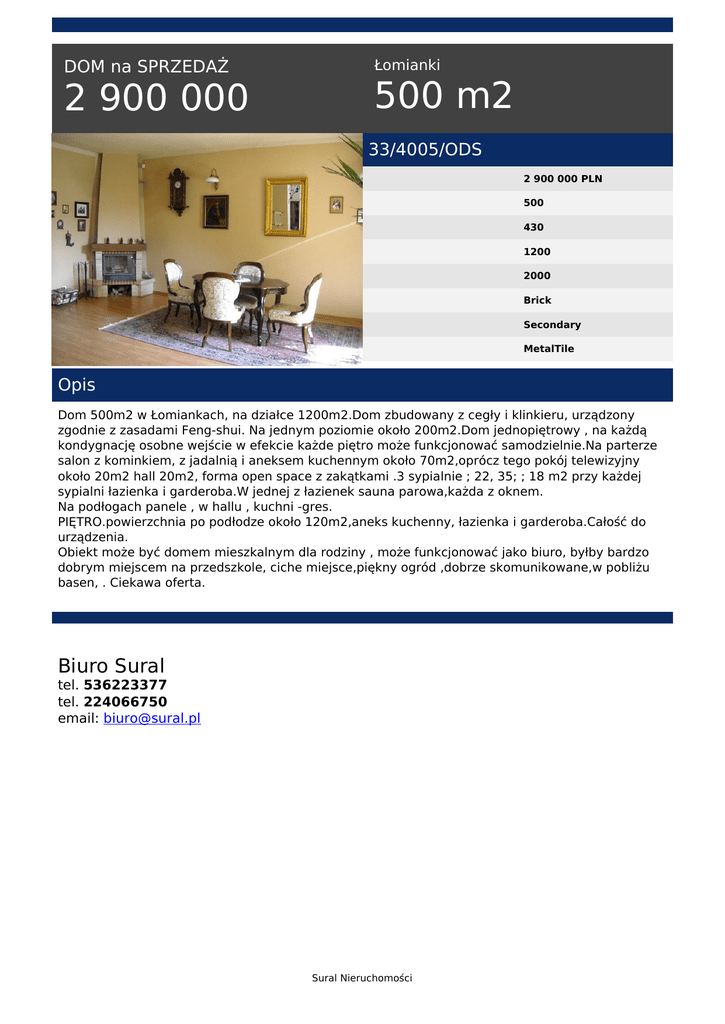 DOM na SPRZEDAŻ 2 900 000 Łomianki 500 m2 33/4005/ODS 2 900 000 PLN 500 430 1200 2000 Brick Secondary MetalTile Opis Dom 500m2 w Łomiankach, na działce 1200m2.Dom zbudowany z cegły i klinkieru, urządzony zgodnie z zasadami Feng-shui. Na jednym poziomie około 200m2.Dom jednopiętrowy , na każdą kondygnację osobne wejście w efekcie każde piętro może funkcjonować samodzielnie.Na parterze salon z kominkiem, z jadalnią i aneksem kuchennym około 70m2,oprócz tego pokój telewizyjny około 20m2 hall 20m2, forma open space z zakątkami .3 sypialnie ; 22, 35; ; 18 m2 przy każdej sypialni łazienka i garderoba.W jednej z łazienek sauna parowa,każda z oknem. Na podłogach panele , w hallu , kuchni -gres. PIĘTRO.powierzchnia po podłodze około 120m2,aneks kuchenny, łazienka i garderoba.Całość do urządzenia. Obiekt może być domem mieszkalnym dla rodziny , może funkcjonować jako biuro, byłby bardzo dobrym miejscem na przedszkole, ciche miejsce,piękny ogród ,dobrze skomunikowane,w pobliżu basen, . Ciekawa oferta. Biuro Sural tel. 536223377 tel. 224066750 email: [email protected] Sural Nieruchomości Powered by TCPDF (www.tcpdf.org)