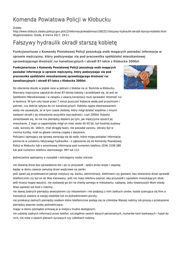Komenda Powiatowa Policji w Kłobucku Źródło: http://www.klobuck.slaska.policja.gov.pl/k12/informacje/wiadomosci/38225,Falszywy-hydraulik-okradl-starsza-kobiete.html Wygenerowano: Środa, 8 marca 2017, 19:11 Fałszywy hydraulik okradł starszą kobietę Funkcjonariusze z Komendy Powiatowej Policji poszukują osób mogących posiadać informacje w sprawie mężczyzny, który podszywając się pod pracownika spółdzielni mieszkaniowej sprawdzającego drożność rur kanalizacyjnych i ukradł 87-latce z Kłobucka 2000zł. Funkcjonariusze z Komendy Powiatowej Policji poszukują osób mogących posiadać informacje w sprawie mężczyzny, który podszywając się pod pracownika spółdzielni mieszkaniowej sprawdzającego drożność rur kanalizacyjnych i ukradł 87-latce z Kłobucka 2000zł. Do zdarzenia doszło w piątek rano w jednym z bloków na ul. Rommla w Kłobucku. Nieznany mężczyzna zapukał do drzwi 87-letniej kobiety i przedstawił się, że jest ze Spółdzielni Mieszkaniowej i w związku z awarią kanalizacji musi sprawdzić drożność rur w łazience. W tym celu kazał przez 7 minut puszczać kobiecie wodę pod prysznicem i patrzeć, czy dobrze spływa do rur kanalizacyjnych. Kobieta zajęta obserwowaniem wody nie zauważyła, że w tym czasie złodziej, który mógł działać wspólnie z innymi osobami skradł z jej mieszkania wszystkie oszczędności, czyli 2000zł. Kobieta zorientowała się, że nie ma pieniędzy dopiero po tym, jak mężczyzna opuścił jej mieszkanie. Z tego co zapamiętała mógł on mieć około 45-50 lat, był średniej budowy ciała, wzrostu ok. 160cm, miał okrągłą twarz, nie posiadał zarostu. Ubrany był w ciemna kurtkę, miał na głowie ciemną czapkę z daszkiem. Policjanci zajmujący się sprawą zwracają się do osób, które mogą posiadać informacje pomocne w ustaleniu fałszywego hydraulika - o zgłoszenie się do Komendy Powiatowej Policji w Kłobucku lub o anonimową informację pod numerem telefonu (034) 3109 280 lub pod numerem telefonu alarmowego: 997 lub 112. Jednocześnie apelujemy o rozsądek i ostrzegamy osoby starsze: nie otwieraj drzwi bez sprawdzenia kto i po co przyszedł - spójrz przez wizjer i zapytaj; będąc w domu zawsze zamykaj drzwi wejściowe na zamki; jeśli zjawił się przedstawiciel jakiejś instytucji np. banku, administracji, elektrowni czy gazowni, bez otwierania drzwi sprawdź telefonicznie czy był on do Was kierowany; jeśli nie masz telefonu poproś, aby przyszedł z sąsiadem mieszkającym obok; jeśli musisz kogoś wpuścić, nie zostawiaj go ani na chwilę samego w mieszkaniu; najlepiej, żeby towarzyszyli Wam wtedy Wasi sąsiedzi lub ktoś z rodziny; nie dawaj żadnych pieniędzy akwizytorom czy inkasentom i nie podpisuj z nimi żadnych umów; każda szanująca się firm a transakcje zawiera w swojej siedzibie lub za pośrednictwem poczty; nie przekazuj żadnych pieniędzy osobom które telefonicznie podają się za członków Waszej rodziny lub proszą o przekazanie pieniędzy poprzez osoby pośredniczące; mając w domu pieniądze schowaj je w miejscu trudno dostępnym; nie udzielaj żadnych informacji przez telefon, szczególnie swoich danych personalnych, numerów kont bankowych i haseł do nich, nie mów o swoich planach życiowych czy członkach rodziny. Ocena: 0/5 (0) Tweetnij