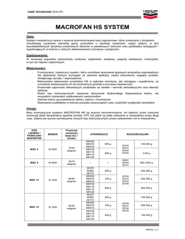 DANE TECHNICZNE 0626-PL MACROFAN HS SYSTEM Opis: System mieszalniczy oparty o wysoce skoncentrowane bazy pigmentowe, które zmieszane z binderami umożliwiają uzyskanie szerokiej gamy produktów o wysokiej zawartości części stałych, w tym dwuskładnikowych akrylowo-uretanowych lakierów w pastelowych kolorach oraz podkładów izolujących / wypełniających w kolorze o różnych właściwościach schnięcia i wydajności. Zastosowanie: W renowacji pojazdów (samochody osobowe, ciężarówki, autobusy, pojazdy dostawcze, motocykle), w tym do napraw częściowych. Właściwości: ⋅ ⋅ ⋅ ⋅ ⋅ ⋅ Funkcjonalny i elastyczny system, który umożliwia otrzymanie gotowych produktów odpowiednich dla spełnienia różnych wymagań (w zakresie aplikacji, zasad stosowania, wyglądu powłoki, dostępnego sprzętu i wyposażenia) Różnorodne właściwości produktów HS w zakresie schnięcia, siły izolującej i wypełniania, co umożliwia dostosowanie ich do konkretnych potrzeb w procesie naprawczym Doskonała odporność oferowanych produktów na światło i warunki atmosferyczne oraz łatwość aplikacji Dobór baz kolorystycznych zapewnia otrzymanie doskonałego dopasowania koloru, we wszystkich odcieniach użytkowanych samochodów Gotowe kolory są pozbawione ołowiu, kadmu i chromianów Stosowanie podkładów w kolorze pozwala zaoszczędzić czas i podnieść wydajność produktów Uwagi: Bazy kolorystyczne systemu MACROFAN HS są wysoce skoncentrowane, ich lepkość może znacznie wzrosnąć jeżeli temperatura spadnie poniżej 15ºC lub jeżeli są stale mieszane w mieszalniku przez długi czas. Zaleca się ręczne wymieszanie nowych baz kolorystycznych przed ustawieniem ich w mieszalniku. KOD LAKIERU / PODKŁADU MACROFAN MAC 4 MAC 5 MAC 14 MAC 15 BINDER M 4000 M 5000 M 1004 M 1005 Proporcje mieszania (baza kol. / binder) 70/30 wagowo 30/70 wagowo 60/40 wagowo 50/50 wagowo UTWARDZACZ MH400 MH410 MH415 MH100 MH110 MH115 MH120 / 00379 00362 00174 MH400 MH410 MH415 MH100 MH110 MH115 MH120 00379 00362 00174 MH400 MH410 MH415 MH100 MH110 MH115 MH120 500 g 600 g / ROZCIEŃCZALNIK 00740 00741 00742 00755 00551 00740 00741 250 g 150 g 100-200 g 0-50 g 800-1000 g 200-250 g 00740 00741 00742 00755 250-300 g 200 g 200-250 g 250 g 150-200 g 150 g 200 g 00740 00741 00742 00755 200-250 g 150-200 g strona 1 z 2 DANE TECHNICZNE MAC 16 MAC 71 MAC 75 MAC 81 MAC 85 MAC 9 MAC 0 0626-PL 50/50 wagowo M 1006 M 7010 M 7005 M 8010 M 8005 M 9000 M 0000 10/90 objętościowo 10/90 objętościowo 10/90 objętościowo 10/90 objętościowo 10/90 objętościowo 10/90 objętościowo 00379 00362 00174 MH400 MH410 MH415 MH100 MH110 MH115 MH120 00379 00362 00174 MH100 MH110 MH115 MH120 MH400 MH415 00362 00174 MH400 MH415 MH100 MH110 MH115 MH120 MH100 MH110 MH115 MH120 150 g 160 g 200-250 g 150-200 g 00740 00741 00742 00755 100-200 g 130 g 160 g 100 g 130 g 110 g 180 g 00362 200 g / 00740 00741 00742 00755 200 g MH300 MH400 MH415 MH110 MH115 MH120 MH400 MH410 MH415 MH100 MH110 MH115 MH120 150-200 g 250 g 130 g 160 g 250 g 50-200 g 00740 00741 00742 00755 00740 00741 00742 00755 100-250 g 100-200 g mokre-na-mokre: 250-350 g suche-na-suche: 150-250 g mokre-na-mokre: 200-250 g suche-na-suche: 150-200 g 100-250 g 00740 00741 00742 00755 300 g 00740 00741 00742 00755 / 00526 150-300 g 150-250 g 250-300 g 200-250 g 1000-1300 g Dane techniczne 0441-PL 09/2012 PRODUKT PRZEZNACZONY JEST DO ZASTOSOWAŃ PROFESJONALNYCH PRZEZ WYKWALIFIKOWANY PERSONEL. Powyższe dane sporządzono po uprzednim sprawdzeniu, mimo to nie odpowiadamy za ewentualne pomyłki i niedokładności. strona 2 z 2