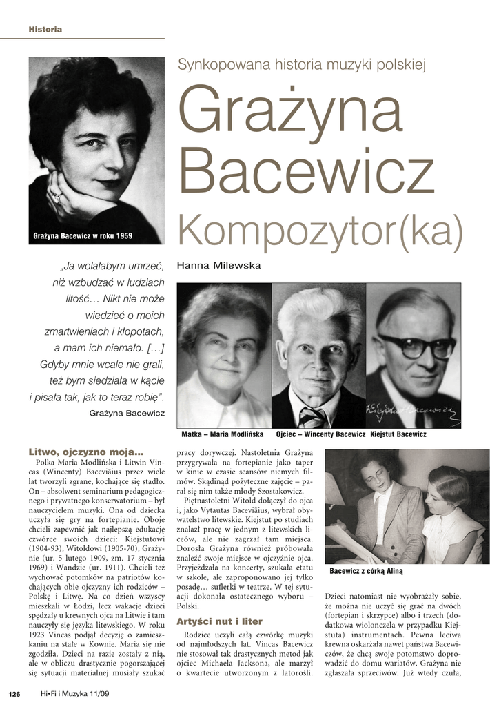 Historia Synkopowana historia muzyki polskiej Gra˝yna Bacewicz Gra˝yna Bacewicz w roku 1959 „Ja wola∏abym umrzeç, Kompozytor(ka) Hanna Milewska ni˝ wzbudzaç w ludziach litoÊç… Nikt nie mo˝e wiedzieç o moich zmartwieniach i k∏opotach, a mam ich niema∏o. […] Gdyby mnie wcale nie grali, te˝ bym siedzia∏a w kàcie i pisa∏a tak, jak to teraz robi´”. Gra˝yna Bacewicz Matka – Maria Modliƒska Litwo, ojczyzno moja… Polka Maria Modliƒska i Litwin Vincas (Wincenty) Baceviãius przez wiele lat tworzyli zgrane, kochajàce si´ stad∏o. On – absolwent seminarium pedagogicznego i prywatnego konserwatorium – by∏ nauczycielem muzyki. Ona od dziecka uczy∏a si´ gry na fortepianie. Oboje chcieli zapewniç jak najlepszà edukacj´ czwórce swoich dzieci: Kiejstutowi (1904-93), Witoldowi (1905-70), Gra˝ynie (ur. 5 lutego 1909, zm. 17 stycznia 1969) i Wandzie (ur. 1911). Chcieli te˝ wychowaç potomków na patriotów kochajàcych obie ojczyzny ich rodziców – Polsk´ i Litw´. Na co dzieƒ wszyscy mieszkali w ¸odzi, lecz wakacje dzieci sp´dza∏y u krewnych ojca na Litwie i tam nauczy∏y si´ j´zyka litewskiego. W roku 1923 Vincas podjà∏ decyzj´ o zamieszkaniu na sta∏e w Kownie. Maria si´ nie zgodzi∏a. Dzieci na razie zosta∏y z nià, ale w obliczu drastycznie pogorszajàcej si´ sytuacji materialnej musia∏y szukaç 126 Hi•Fi i Muzyka 11/09 Ojciec – Wincenty Bacewicz Kiejstut Bacewicz pracy dorywczej. Nastoletnia Gra˝yna przygrywa∏a na fortepianie jako taper w kinie w czasie seansów niemych filmów. Skàdinàd po˝yteczne zaj´cie – para∏ si´ nim tak˝e m∏ody Szostakowicz. Pi´tnastoletni Witold do∏àczy∏ do ojca i, jako Vytautas Baceviãius, wybra∏ obywatelstwo litewskie. Kiejstut po studiach znalaz∏ prac´ w jednym z litewskich liceów, ale nie zagrza∏ tam miejsca. Doros∏a Gra˝yna równie˝ próbowa∏a znaleêç swoje miejsce w ojczyênie ojca. Przyje˝d˝a∏a na koncerty, szuka∏a etatu w szkole, ale zaproponowano jej tylko posad´… suflerki w teatrze. W tej sytuacji dokona∏a ostatecznego wyboru – Polski. ArtyÊci nut i liter Rodzice uczyli ca∏à czwórk´ muzyki od najm∏odszych lat. Vincas Bacewicz nie stosowa∏ tak drastycznych metod jak ojciec Michaela Jacksona, ale marzy∏ o kwartecie utworzonym z latoroÊli. Bacewicz z córkà Alinà Dzieci natomiast nie wyobra˝a∏y sobie, ˝e mo˝na nie uczyç si´ graç na dwóch (fortepian i skrzypce) albo i trzech (dodatkowa wiolonczela w przypadku Kiejstuta) instrumentach. Pewna leciwa krewna oskar˝a∏a nawet paƒstwa Bacewiczów, ˝e chcà swoje potomstwo doprowadziç do domu wariatów. Gra˝yna nie zg∏asza∏a sprzeciwów. Ju˝ wtedy czu∏a, Historia ˝e muzyka to „ostinato jej ˝ycia”, jak póêniej podsumowa∏ Stefan Kisielewski. Utalentowana trójka rodzeƒstwa (najm∏odsza Wanda, mimo zdolnoÊci i umiej´tnoÊci, nie zdradza∏a ochoty do wspó∏uczestniczenia) wyst´powa∏a na publicznych popisach, nie tylko w szkole. Grali w trio, duetach i solo, przedstawiali te˝ pierwsze w∏asne kompozycje. Z perspektywy lat, Gra˝yna by∏a wdzi´czna rodzicom za gruntowne muzyczne wykszta∏cenie. Dzi´ki niemu wi´zy siostrzano-braterskie okaza∏y si´ silniejsze ni˝ odleg∏oÊci w przestrzeni i granice polityczne. Cz´sto spotyka∏a si´ z pozosta∏ymi w kraju Kiejstutem i Wandà, natomiast do Witolda prawie codziennie pisa∏a listy. Witold z Kowna wyruszy∏ na studia kompozytorskie i pianistyczne do Pary˝a. Wybuch II wojny zasta∏ go na tournée w Ameryce Po∏udniowej. Od 1940 mieszka∏ w USA, w Nowym Jorku. Choç bardzo t´skni∏, nie chcia∏ wróciç do Litwy – republiki sowieckiej. ˚y∏ skromnie – g∏ównie z pensji wyk∏adowcy szkó∏ muzycznych i z prywatnych lekcji. Wcià˝ komponowa∏, koncertowa∏ jako pianista. Osiem razy wystàpi∏ z recitalem w Carnegie Hall. Kiejstut, pianista, kompozytor i pedagog, by∏ rektorem Paƒstwowej Wy˝szej Szko∏y Muzycznej w ¸odzi w latach 1957-69. Wanda, pianistka i muzykolog, krytyk muzyczny, dziennikarka radiowa i poetka – zosta∏a stra˝niczkà i propagatorkà spuÊcizny twórczej Gra˝yny. Ju˝ czterdzieÊci lat godnie spe∏nia to zadanie. Podstawy gry na skrzypcach i fortepianie przekaza∏ Gra˝ynie ojciec. Dzie- Skrzypaczka pierwszorz´dna Gra˝yna zdecydowa∏a, ˝e b´dzie studiowaç w Warszawie. Âciàgn´∏a tam matk´ i Wand´. Zapisa∏a si´ na wydzia∏ filozofii Uniwersytetu Warszawskiego oraz do Paƒstwowego Konserwatorium Muzycznego do trzech klas: kompozycji (prof. Kazimierz Sikorski), skrzypiec (prof. Józef Jarz´bski) i fortepianu (prof. Józef Turczyƒski). Po kilku semestrach, jako perfekcjonistka, zrozumia∏a, ˝e nie zdo∏a pogodziç M∏oda Bacewiczo?wna ze skrzypcami tajàc z pobytu w stolicy Francji, Gra˝yna pobiera∏a prywatne lekcje u skrzypka André Toureta. W 1934 roku znów pojecha∏a do Pary˝a, aby pod kierunkiem wybitnego pedagoga i wirtuoza Carla Flescha opracowaç program na I Mi´dzynarodowy Konkurs Skrzypcowy im. Wieniawskiego, który mia∏ si´ odbyç w 1935. SpecjaliÊci wró˝yli jej zdobycie nagrody. Niestety, w przeddzieƒ jej wyst´pu w II etapie do mieszkania Bacewiczów dokonano w∏amania. Z∏odzieje ukradli wszystkie cenne przedmioty – oprócz sukni galowej i skrzypiec. Po bezsennej nocy, sp´dzonej na policyjnym dochodzeniu, artystka nie by∏a w dobrej formie. Laureatami zostali wówczas m.in. Dawid Ojstrach i Ginette Neveu. Gra˝yna zadowoli∏a si´ dyplomem. Nie przysz∏o jej do g∏owy, aby t∏umaczyç przyczyn´ pora˝ki przed publicznoÊcià lub krytykami. A przecie˝ by∏a usprawiedliwiona. Tajemnic´ ujawni∏a dopiero w zbiorze wspomnieƒ „Znak szczególny”. W latach 1936-38 by∏a koncertmistrzem Orkiestry Polskiego Radia, którà dyrygowa∏ Grzegorz Fitelberg. Chcia∏a si´ z bliska przyjrzeç pracy zespo∏u; poznaç mo˝liwoÊci instrumentów i ró˝ne wspó∏brzmienia. Muzycy Fitelberg