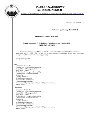 ZAKŁAD NARODOWY im. OSSOLIŃSKICH ul. Szewska 37, 50-139 Wrocław, tel. 071 344-44-71, fax 071 344-85-61, NIP 897-10-82-476, www.oss.wroc.pl Wrocław, dnia 16.09.2011 r. Wykonawcy, którzy pobrali SIWZ Informacja o zmianie treści siwz Druk Czasopisma Z. 22 Zakładu Narodowego im. Ossolińskich DZP-2621-9/2011 Zamawiający działając na podstawie art. 38 ust. 4 ustawy z dnia 29 stycznia 2004r. Prawo zamówień publicznych (Dz.U. z 2010 r. Nr 113, poz. 759 ze zm.) informuje, że dokonuje zmiany treści specyfikacji istotnych warunków zamówienia o następujące zapisy: Siwz punkt IV, punkt 1 Jest: Czasopismo ZNiO Z. 22 Objętość: 342 stron; 22 arkusze drukarskie Format 166 x 297 mm po obcięciu Kolor druku – czarny Druk środka: 1 + 1, papier offsetowy 80 g Oprawa twarda, szyta nićmi, klejona Tektura 3 g Oklejka – druk 4 + 0 Wyklejka niezadrukowana Biała kapitałka, grzbiet prosty Folia błyszcząca na okładkę Foliowanie każdego egzemplarza książki w folię termokurczliwą Nakład 200 egz. Winno być: Czasopismo ZNiO Z. 22 Objętość: 342 stron; 22 arkusze drukarskie Format 168 x 238 mm po obcięciu Kolor druku – czarny Druk środka: 1 + 1, papier offsetowy 80 g Oprawa twarda, szyta nićmi, klejona Tektura 3 g Oklejka – druk 4 + 0 Wyklejka niezadrukowana Biała kapitałka, grzbiet prosty Folia błyszcząca na okładkę Foliowanie każdego egzemplarza książki w folię termokurczliwą Nakład 200 egz. Powyższa zmiana zostaje wprowadzona do wzoru umowy - Załącznik nr 7 - § 1 wzoru umowy. Ponadto, działając na podstawie art. 12 a ust. 1 ustawy Pzp, informuję, iż Zamawiający przesuwa termin składania ofert z 20.09.2011 r. na dzień 21.09.2011 r. Obowiązujące terminy: - termin składania ofert - termin otwarcia ofert 21.09.2011 godz. 09.00 21.09.2011 godz. 09.30 Pozostałe ustalenia zawarte w siwz pozostają bez zmian. Dyrektor (-) dr Adolf Juzwenko