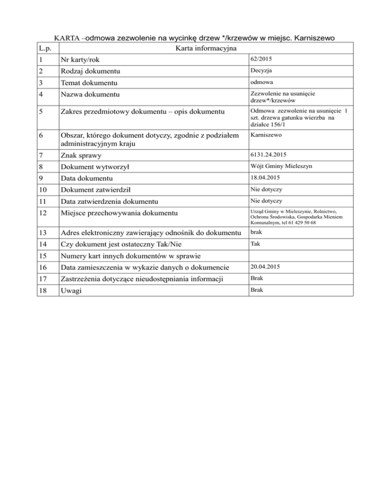 KARTA –odmowa zezwolenie na wycinkę drzew */krzewów w miejsc. Karniszewo L.p. Karta informacyjna 1 Nr karty/rok 62/2015 2 Rodzaj dokumentu Decyzja 3 Temat dokumentu odmowa 4 Nazwa dokumentu Zezwolenie na usunięcie drzew*/krzewów 5 Zakres przedmiotowy dokumentu – opis dokumentu Odmowa zezwolenie na usunięcie 1 szt. drzewa gatunku wierzba na działce 156/1 6 Obszar, którego dokument dotyczy, zgodnie z podziałem administracyjnym kraju Karniszewo 7 Znak sprawy 6131.24.2015 8 Dokument wytworzył Wójt Gminy Mieleszyn 9 Data dokumentu 18.04.2015 10 Dokument zatwierdził Nie dotyczy 11 Data zatwierdzenia dokumentu Nie dotyczy 12 Miejsce przechowywania dokumentu Urząd Gminy w Mieleszynie, Rolnictwo, Ochrona Środowiska, Gospodarka Mieniem Komunalnym, tel 61 429 50 68 13 Adres elektroniczny zawierający odnośnik do dokumentu brak 14 Czy dokument jest ostateczny Tak/Nie Tak 15 Numery kart innych dokumentów w sprawie 16 Data zamieszczenia w wykazie danych o dokumencie 20.04.2015 17 Zastrzeżenia dotyczące nieudostępniania informacji Brak 18 Uwagi Brak