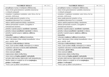 NACOBEZU DZIAŁ I porządkujesz wyrazy w kolejności alfabetycznej, znasz zwroty grzecznościowe i potrafisz stosować je w różnych sytuacjach rozumiesz i wyjaśniasz wyrażenia: ważyć słowa, być na poziomie, elokwencja znasz zasady pisowni wyrazów z ó i u, uzasadniasz pisownię ó i u w wyrazach, umiesz zapisać poprawnie dialog z narratorem, unikasz powtarzania wyrazów, szczególnie w komentarzach narratora potrafisz wyjaśnić pojęcia: uosobienie i ożywienie, potrafisz wskazać uosobienie i ożywienie w tekście, potrafisz wyjaśnić pojęcia: nadawca, odbiorca, komunikat, wskazujesz nadawcę i odbiorcę komunikatu, znasz i odczytujesz różne rodzaje komunikatów: słowa, gesty, mimikę, znaki wskazujesz osobę mówiącą w wierszu, wiesz, czym są wers i strofa, wskazujesz je w tekście wyjaśniasz znaczenie wyrażenia mieć natchnienie, rozróżniasz głoski i litery, wiesz czym jest zdanie, rozpoczynasz zdania wielką literą, wiesz czym są: kropka, pytajnik i wykrzyknik, na końcu zdań stawiasz odpowiedni znak interpunkcyjny, dzielisz zdania ze względu na cel na oznajmujące, pytające i rozkazujące, *wiesz czym są zdania wykrzyknikowe. ++ / + / - NACOBEZU DZIAŁ I porządkujesz wyrazy w kolejności alfabetycznej, znasz zwroty grzecznościowe i potrafisz stosować je w różnych sytuacjach rozumiesz i wyjaśniasz wyrażenia: ważyć słowa, być na poziomie, elokwencja znasz zasady pisowni wyrazów z ó i u, uzasadniasz pisownię ó i u w wyrazach, umiesz zapisać poprawnie dialog z narratorem, unikasz powtarzania wyrazów, szczególnie w komentarzach narratora potrafisz wyjaśnić pojęcia: uosobienie i ożywienie, potrafisz wskazać uosobienie i ożywienie w tekście, potrafisz wyjaśnić pojęcia: nadawca, odbiorca, komunikat, wskazujesz nadawcę i odbiorcę komunikatu, znasz i odczytujesz różne rodzaje komunikatów: słowa, gesty, mimikę, znaki wskazujesz osobę mówiącą w wierszu, wiesz, czym są wers i strofa, wskazujesz je w tekście wyjaśniasz znaczenie wyrażenia mieć natchnienie, rozróżniasz głoski i litery, wiesz czym jest zdanie, rozpoczynasz zdania wielką literą, wiesz czym są: kropka, pytajnik i wykrzyknik, na końcu zdań stawiasz odpowiedni znak interpunkcyjny, dzielisz zdania ze względu na cel na oznajmujące, pytające i rozkazujące, *wiesz czym są zdania wykrzyknikowe. ++ / + / -