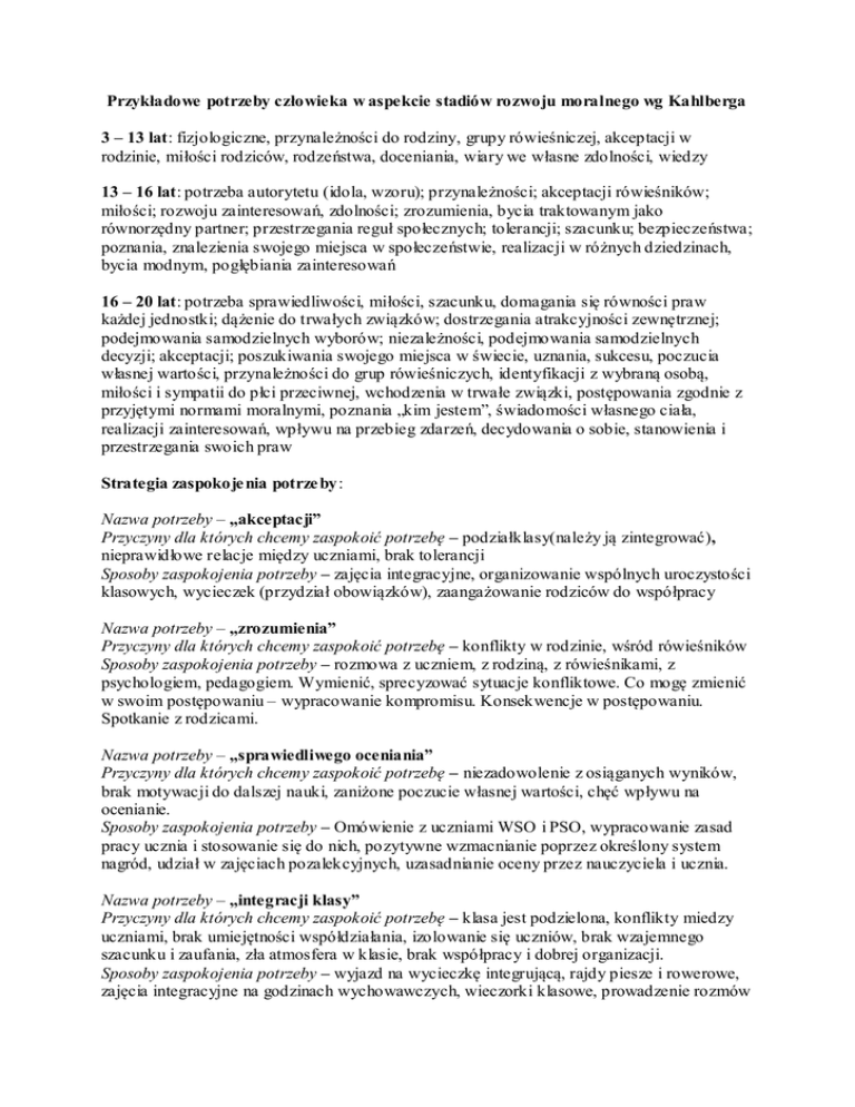 Przykładowe potrzeby człowieka w aspekcie stadiów rozwoju moralnego wg Kahlberga 3 – 13 lat: fizjologiczne, przynależności do rodziny, grupy rówieśniczej, akceptacji w rodzinie, miłości rodziców, rodzeństwa, doceniania, wiary we własne zdolności, wiedzy 13 – 16 lat: potrzeba autorytetu (idola, wzoru); przynależności; akceptacji rówieśników; miłości; rozwoju zainteresowań, zdolności; zrozumienia, bycia traktowanym jako równorzędny partner; przestrzegania reguł społecznych; tolerancji; szacunku; bezpieczeństwa; poznania, znalezienia swojego miejsca w społeczeństwie, realizacji w różnych dziedzinach, bycia modnym, pogłębiania zainteresowań 16 – 20 lat: potrzeba sprawiedliwości, miłości, szacunku, domagania się równości praw każdej jednostki; dążenie do trwałych związków; dostrzegania atrakcyjności zewnętrznej; podejmowania samodzielnych wyborów; niezależności, podejmowania samodzielnych decyzji; akceptacji; poszukiwania swojego miejsca w świecie, uznania, sukcesu, poczucia własnej wartości, przynależności do grup rówieśniczych, identyfikacji z wybraną osobą, miłości i sympatii do płci przeciwnej, wchodzenia w trwałe związki, postępowania zgodnie z przyjętymi normami moralnymi, poznania „kim jestem”, świadomości własnego ciała, realizacji zainteresowań, wpływu na przebieg zdarzeń, decydowania o sobie, stanowienia i przestrzegania swoich praw Strategia zaspokoje nia potrze by: Nazwa potrzeby – „akceptacji” Przyczyny dla których chcemy zaspokoić potrzebę – podziałklasy(należy ją zintegrować), nieprawidłowe relacje między uczniami, brak tolerancji Sposoby zaspokojenia potrzeby – zajęcia integracyjne, organizowanie wspólnych uroczystości klasowych, wycieczek (przydział obowiązków), zaangażowanie rodziców do współpracy Nazwa potrzeby – „zrozumienia” Przyczyny dla których chcemy zaspokoić potrzebę – konflikty w rodzinie, wśród rówieśników Sposoby zaspokojenia potrzeby – rozmowa z uczniem, z rodziną, z rówieśnikami, z psychologiem, pedagogiem. Wymienić, sprecyzować sytuacje konfliktowe. Co mogę zmienić w swoim postępowaniu – wypracowanie kompromisu. Konsekwencje w postępowaniu. Spotkanie z rodzicami. Nazwa potrzeby – „sprawiedliwego oceniania” Przyczyny dla których chcemy zaspokoić potrzebę – niezadowolenie z osiąganych wyników, brak motywacji do dalszej nauki, zaniżone poczucie własnej wartości, chęć wpływu na ocenianie. Sposoby zaspokojenia potrzeby – Omówienie z uczniami WSO i PSO, wypracowanie zasad pracy ucznia i stosowanie się do nich, pozytywne wzmacnianie poprzez określony system nagród, udział w zajęciach pozalekcyjnych, uzasadnianie oceny przez nauczyciela i ucznia. Nazwa potrzeby – „integracji klasy” Przyczyny dla których chcemy zaspokoić potrzebę – klasa jest podzielona, konflikty miedzy uczniami, brak umiejętności współdziałania, izolowanie się uczniów, brak wzajemnego szacunku i zaufania, zła atmosfera w klasie, brak współpracy i dobrej organizacji. Sposoby zaspokojenia potrzeby – wyjazd na wycieczkę integrującą, rajdy piesze i rowerowe, zajęcia integracyjne na godzinach wychowawczych, wieczorki klasowe, prowadzenie rozmów w sytuacji konfliktów w klasie, zawarcie „kontraktu” (umowy dotyczącej obowiązujących reguł życia w klasie), wspólne rozwiązywanie problemów pojawiających się w klasie, przeprowadzenie ankiety „Moja klasa”, wspólne realizowanie konkretnego zadania (podział ról), monitoring zaspokojenia potrzeby. Nazwa potrzeby – „znalezienia przyjaciela w klasie” Przyczyny dla których chcemy zaspokoić potrzebę – uczucie samotności – izolacji odrzucenia, potrzeba akceptacji, chęć walki z kompleksami, potrzeba wiary w siebie. Sposoby zaspokojenia potrzeby – obserwuję zachowania uczniów - ich reakcje, poznaję mocne i słabe strony uczniów, uwzględniam wyniki ankiety i przydzielam zadania wg zainteresowań, czuwam i wspieram działania ucznia, chwalę – wspieram gestem i słowem, przydzielam zadania na jego miarę, aranżuję współpracę z innymi uczniami, organizuję imprezy integracyjne.