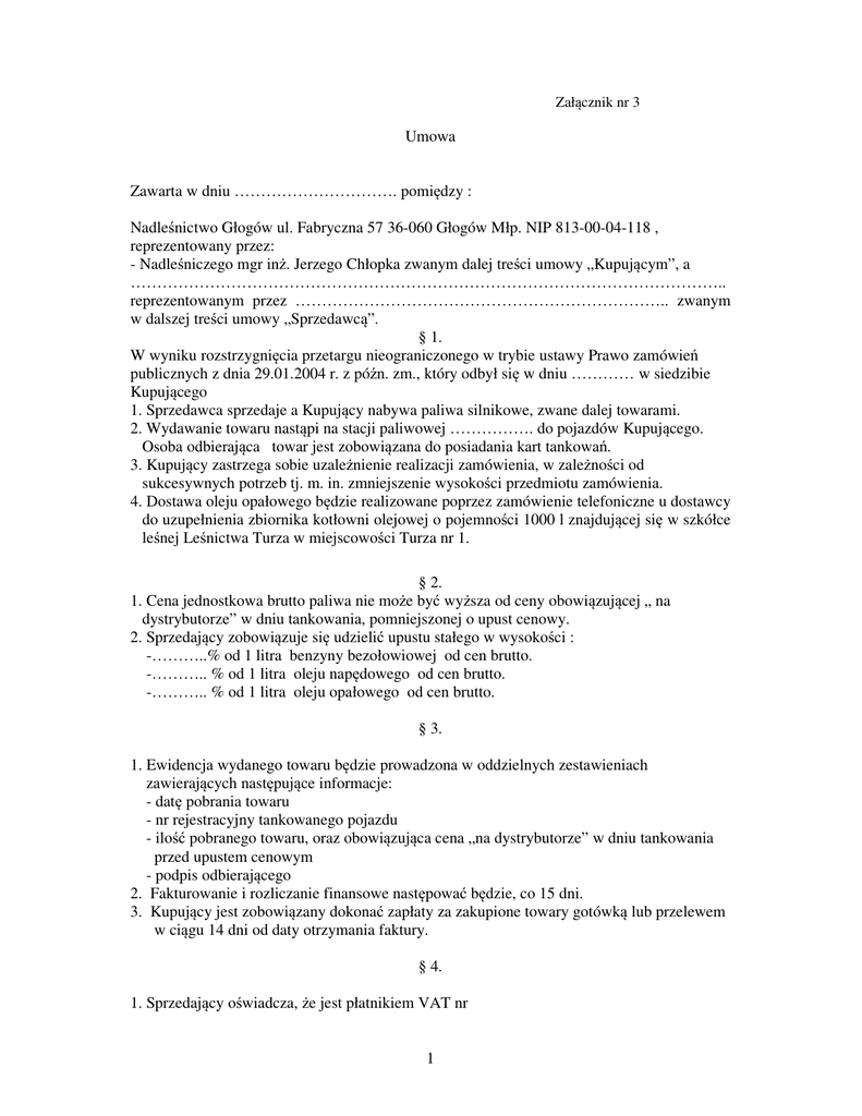 Zał cznik nr 3 Umowa Zawarta w dniu …………………………. pomi dzy : Nadle nictwo Głogów ul. Fabryczna 57 36-060 Głogów Młp. NIP 813-00-04-118 , reprezentowany przez: - Nadle niczego mgr in . Jerzego Chłopka zwanym dalej tre ci umowy „Kupuj cym”, a ………………………………………………………………………………………………….. reprezentowanym przez …………………………………………………………….. zwanym w dalszej tre ci umowy „Sprzedawc ”. § 1. W wyniku rozstrzygni cia przetargu nieograniczonego w trybie ustawy Prawo zamówie publicznych z dnia 29.01.2004 r. z pó n. zm., który odbył si w dniu ………… w siedzibie Kupuj cego 1. Sprzedawca sprzedaje a Kupuj cy nabywa paliwa silnikowe, zwane dalej towarami. 2. Wydawanie towaru nast pi na stacji paliwowej ……………. do pojazdów Kupuj cego. Osoba odbieraj ca towar jest zobowi zana do posiadania kart tankowa . 3. Kupuj cy zastrzega sobie uzale nienie realizacji zamówienia, w zale no ci od sukcesywnych potrzeb tj. m. in. zmniejszenie wysoko ci przedmiotu zamówienia. 4. Dostawa oleju opałowego b dzie realizowane poprzez zamówienie telefoniczne u dostawcy do uzupełnienia zbiornika kotłowni olejowej o pojemno ci 1000 l znajduj cej si w szkółce le nej Le nictwa Turza w miejscowo ci Turza nr 1. § 2. 1. Cena jednostkowa brutto paliwa nie mo e by wy sza od ceny obowi zuj cej „ na dystrybutorze” w dniu tankowania, pomniejszonej o upust cenowy. 2. Sprzedaj cy zobowi zuje si udzieli upustu stałego w wysoko ci : -………..% od 1 litra benzyny bezołowiowej od cen brutto. -……….. % od 1 litra oleju nap dowego od cen brutto. -……….. % od 1 litra oleju opałowego od cen brutto. § 3. 1. Ewidencja wydanego towaru b dzie prowadzona w oddzielnych zestawieniach zawieraj cych nast puj ce informacje: - dat pobrania towaru - nr rejestracyjny tankowanego pojazdu - ilo pobranego towaru, oraz obowi zuj ca cena „na dystrybutorze” w dniu tankowania przed upustem cenowym - podpis odbieraj cego 2. Fakturowanie i rozliczanie finansowe nast powa b dzie, co 15 dni. 3. Kupuj cy jest zobowi zany dokona zapłaty za zakupione towary gotówk lub przelewem w ci gu 14 dni od daty otrzymania faktury. § 4. 1. Sprzedaj cy o wiadcza, e jest płatnikiem VAT nr 1 2. Kupuj cy o wiadcza, jest płatnikiem VAT nr NIP 813-00-04-118 jest uprawniony do otrzymania faktur VAT. 3. Strony umawiaj si do wystawienia faktur sprzedawcy bez podpisu Kupuj cego. § 5. Umowa została zawarta na czas okre lony od 1 stycznia 2010 r. do 31.grudnia 2010 r. z mo liwo ci wypowiedzenia przez ka d ze stron z zachowaniem jednomiesi cznego okresu wypowiedzenia. § 6. W sprawach nie uregulowanych niniejsz umow przepisy Kodeksu Cywilnego. § 7. Sprawy sporne rozstrzygane b d przez S d Gospodarczy w Rzeszowie. § 8. Zmiany umowy wymagaj formy pisemnej pod rygorem niewa no ci. § 9. Integraln cz umowy jest zło ona oferta i S.I.W.Z. § 10. Umowa została sporz dzona w 2 jednobrzmi cych egzemplarzach. Sprzedawca: Kupuj cy: 2