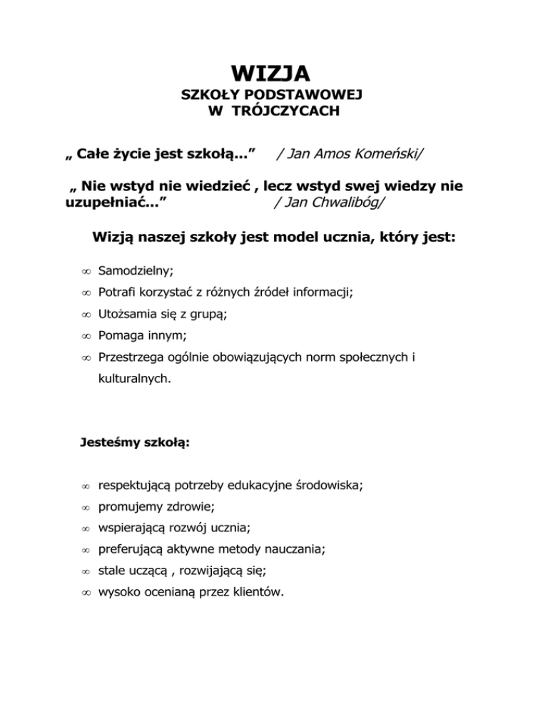 WIZJA SZKOŁY PODSTAWOWEJ W TRÓJCZYCACH „ Całe życie jest szkołą...” / Jan Amos Komeński/ „ Nie wstyd nie wiedzieć , lecz wstyd swej wiedzy nie uzupełniać...” / Jan Chwalibóg/ Wizją naszej szkoły jest model ucznia, który jest: • Samodzielny; • Potrafi korzystać z różnych źródeł informacji; • Utożsamia się z grupą; • Pomaga innym; • Przestrzega ogólnie obowiązujących norm społecznych i kulturalnych. Jesteśmy szkołą: • respektującą potrzeby edukacyjne środowiska; • promujemy zdrowie; • wspierającą rozwój ucznia; • preferującą aktywne metody nauczania; • stale uczącą , rozwijającą się; • wysoko ocenianą przez klientów. MISJA Szkoły Podstawowej w Trójczycach „ Dążmy do tego, aby nasi uczniowie byli twórczy, przygotowani do dalszej życiowej wędrówki”. Wypełnianie misji to nieustanna praca nad realizacją ogólnych celów. UCZEŃ NASZEJ SZKOŁY : traktuje szkołę jako miejsce do którego chętnie przychodzi i dobrze się w niej czuje; jest świadomy swoich uzdolnień; korzysta z osiągnięć techniki; jest koleżeński, przyjazny, szanuje godność swoją i innych; dba o swoje zdrowie i środowisko społeczno – przyrodnicze. Zadania szkoły: • prowadzić dziecko do nabywania i rozwijania umiejętności wypowiadania się, czytania, pisania, wykonywania zadań arytmetycznych, posługiwania się prostymi narzędziami i kształtowania nawyków społecznego współżycia. • Rozwijać poznawcze możliwości uczniów, uczyć: jak się uczyć! • Rozwijać poczucie własnej wartości i motywować do nauki. • Kształtować potrzebę i umiejętności dbania o własne ciało, zdrowie i sprawność fizyczną. • Wzmacniać poczucie tożsamości kulturowej, historycznej, etnicznej i narodowej. Oferta edukacyjna: Oferta zajęć pozalekcyjnych obejmuje: Zajęcia taneczne Szkolnego Zespołu Pieśni i Tańca „ Trójczyce” Zajęcia sportowe dla uczniów klas I- VI w Uczniowskim Klubie Sportowym „ Trójczyce” Zajęcia wyrównawcze dla uczniów klas I- VI Zespół kompensacyjno- korekcyjny dla uczniów klas I-III wg zaleceń PPP