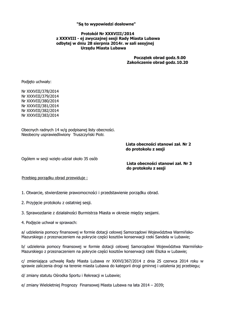"Są to wypowiedzi dosłowne" Protokół Nr XXXVIII/2014 z XXXVIII - ej zwyczajnej sesji Rady Miasta Lubawa odbytej w dniu 28 sierpnia 2014r. w sali sesyjnej Urzędu Miasta Lubawa Początek obrad godz.9.00 Zakończenie obrad godz.10.20 Podjęto uchwały: Nr Nr Nr Nr Nr Nr XXXVIII/378/2014 XXXVIII/379/2014 XXXVIII/380/2014 XXXVIII/381/2014 XXXVIII/382/2014 XXXVIII/383/2014 Obecnych radnych 14 w/g podpisanej listy obecności. Nieobecny usprawiedliwiony Truszczyński Piotr. Lista obecności stanowi zał. Nr 2 do protokołu z sesji Ogółem w sesji wzięło udział około 35 osób Lista obecności stanowi zał. Nr 3 do protokołu z sesji Przebieg porządku obrad przewiduje : 1. Otwarcie, stwierdzenie prawomocności i przedstawienie porządku obrad. 2. Przyjęcie protokołu z ostatniej sesji. 3. Sprawozdanie z działalności Burmistrza Miasta w okresie między sesjami. 4. Podjęcie uchwał w sprawach: a/ udzielenia pomocy finansowej w formie dotacji celowej Samorządowi Województwa WarmińskoMazurskiego z przeznaczeniem na pokrycie części kosztów konserwacji rzeki Sandela w Lubawie; b/ udzielenia pomocy finansowej w formie dotacji celowej Samorządowi Województwa WarmińskoMazurskiego z przeznaczeniem na pokrycie części kosztów konserwacji rzeki Elszka w Lubawie; c/ zmieniająca uchwałę Rady Miasta Lubawa nr XXXVI/367/2014 z dnia 25 czerwca 2014 roku w sprawie zaliczenia drogi na terenie miasta Lubawa do kategorii drogi gminnej i ustalenia jej przebiegu; d/ zmiany statutu Ośrodka Sportu i Rekreacji w Lubawie; e/ zmiany Wieloletniej Prognozy Finansowej Miasta Lubawa na lata 2014 – 2039; f/ zmian w budżecie miasta Lubawa na 2014 rok. 5. Pytania i wolne wnioski. 6. Odpowiedzi na pytania i wolne wnioski. 7. Zakończenie obrad. Ad.2.Przyjęcie protokołów z ostatniej sesji. Protokół z XXXVI-ej zwyczajnej sesji Rady Miasta i XXXVII – ej nadzwyczajnej sesji Rady Miasta wyłożony był do wglądu w Referacie Organizacyjnym. Z treścią protokołów zaraz po jego napisaniu zapoznał się Przewodniczący Rady nie wnosząc żadnych uwag. W wyniku przeprowadzonego jawnego głosowania Rada Miasta 13 głosami "za", przy "przeciwnym" - 0 głosie i "wstrzymującym się" - 0 głosie przyjęła i zatwierdziła treść protokołu z XXXVI-ej zwyczajnej sesji Rady Miasta odbytej w dniu 25 czerwca 2014 roku i XXXVII – ej nadzwyczajnej sesji Rady Miasta odbytej w dniu 14 sierpnia 2014 roku. Ad.3.Sprawozdanie Burmistrza w okresie między sesjami. P.Burmistrz – przedstawił sprawozdanie. Sprawozdanie stanowi zał. Nr 4 do protokołu z sesji. P.Sekretarz – przedstawiła sprawozdanie z realizacji uchwał. Sprawozdanie stanowi zał. Nr 4a do protokołu z sesji. Ad.4. Podjęcie uchwał w sprawach: a/ udzielenia pomocy finansowej w formie dotacji celowej Samorządowi Województwa Warmińsko-Mazurskiego z przeznaczeniem na pokrycie części kosztów konserwacji rzeki Sandela w Lubawie. Wiceprzew.Rady P.Sarnowski– przedstawił projekt uchwały. W wyniku przeprowadzonego jawnego głosowania Rada Miasta jednogłośnie 12 głosami podjęła uchwałę. Uchwała Nr XXXVIII/378/2014 w sprawie udzielenia pomocy finansowej w formie dotacji celowej Samorządowi Województwa Warmińsko-Mazurskiego z przeznaczeniem na pokrycie części kosztów konserwacji rzeki Sandela, stanowi zał. Nr 5 do protokołu z sesji, b/ udzielenia pomocy finansowej w formie dotacji celowej Samorządowi Województwa Warmińsko-Mazurskiego z przeznaczeniem na pokrycie części kosztów konserwacji rzeki Elszka w Lubawie. Przew.Rady P.Zawadzki - przedstawił projekt uchwały. W wyniku przeprowadzonego jawnego głosowania Rada Miasta jednogłośnie 12 głosami podjęła uchwałę. Uchwała Nr XXXVIII/379/2014 w sprawie udzielenia pomocy finansowej w formie dotacji celowej Samorządowi Województwa Warmińsko-Mazurskiego z przeznaczeniem na pokrycie części kosztów konserwacji rzeki Elszka w Lubawie stanowi zał. Nr 6 do protokołu z sesji, c/ zmieniająca uchwałę Rady Miasta Lubawa nr XXXVI/367/2014 z dnia 25 czerwca 2014 roku w sprawie zaliczenia drogi na terenie miasta Lubawa do kategorii drogi gminnej i ustalenia jej przebiegu. Wiceprzew.Rady P.Zaleski - przedstawił projekt uchwały. W wyniku przeprowadzonego jawnego głosowania Rada Miasta jednogłośnie 11 głosami podjęła uchwałę. Uchwała Nr XXXVIII/380/2014 zmieniająca uchwałę Rady Miasta Lubawa nr XXXVI/367/2014 z dnia 25 czerwca 2014 roku w sprawie zaliczenia drogi na terenie miasta Lubawa do kategorii drogi gminnej i ustalenia jej przebiegu, stanowi zał. Nr 7 do protokołu z sesji, d/ zmiany statutu Ośrodka Sportu i Rekreacji w Lubawie. Wiceprzew.Rady P.Sarnowski – przedstawił projekt uchwały. W wyniku przeprowadzonego jawnego głosowania Rada Miasta 13 głosami „za” przy „przeciwnym” - 0 głosie i „wstrzymującym się” - 0 głosie podjęła uchwałę. Uchwała Nr XXXVIII/381/2014 w sprawie zmiany statutu Ośrodka Sportu i Rekreacji w Lubawie, stanowi zał. Nr 8 do protokołu z sesji, e/ zmiany Wieloletniej Prognozy Finansowej Miasta Lubawa na lata 2014 – 2039. Przew.Rady P.Zawadzki – przedstawił projekt uchwały. W wyniku przeprowadzonego jawnego głosowania Rada Miasta 13 głosami „za” przy „przeciwnym” - 0 głosie i „wstrzymującym się” - 0 głosie podjęła uchwałę. Uchwała Nr XXXVIII/382/2014 w sprawie zmiany Wieloletniej Prognozy Finansowej Miasta Lubawa na lata 2014 - 2039, stanowi zał. Nr 9 do protokołu z sesji, f/ zmian w budżecie miasta Lubawa na 2014 rok. Wiceprzew.Rady P.Sarnowski– przedstawił projekt uchwały. W wyniku przeprowadzonego jawnego głosowania Rada Miasta 13 głosami „za” przy „przeciwnym” - 0 głosie i „wstrzymującym się” - 0 głosie podjęła uchwałę. Uchwała Nr XXXVIII/383/2014 w sprawie zmian w budżecie miasta Lubawa na 2014 rok, stanowi zał. Nr 10 do protokołu z sesji. Ad.5. Pytania i wolne wnioski. P.radny Sobiechowski – miałbym jeszcze takie pytanie. Otóż obwod