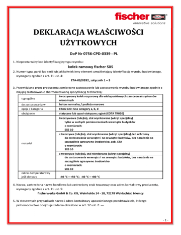 DEKLARACJA WŁAŚCIWOŚCI UŻYTKOWYCH DoP Nr 0756-CPD-0339 - PL 1. Niepowtarzalny kod identyfikacyjny typu wyrobu: kołek ramowy fischer SXS 2. Numer typu, partii lub serii lub jakikolwiek inny element umożliwiający identyfikację wyrobu budowlanego, wymagany zgodnie z art. 11 ust. 4: ETA-09/0352, załącznik 1 – 3 3. Przewidziane przez producenta zamierzone zastosowanie lub zastosowania wyrobu budowlanego zgodnie z mającą zastosowanie zharmonizowaną specyfikacją techniczną: do zastosowania w tworzywowy kołek rozporowy dla wielopunktowych zamocowań systemów nienośnych beton normalny / podłoża murowe opcja / kategoria ETAG 020: Use category a, b, d obciążenie statyczne lub quasi-statyczne; ogień (EOTA TR020) typ ogólny tworzywowa (tulejka), stal ocynkowana (wkręt specjalny) tylko w suchych pomieszczeniach wewnątrz budynków o rozmiarach: SXS 10 materiał z tworzywa (tulejka), stal ocynkowana (wkręt specjalny), łeb ochronny do zastosowania wewnątrz i na zewnątrz budyków, bez narażenia na szczególnie agresywne środowisko, zob. ETA o rozmiarach: SXS 10 z tworzywa (tulejka), stal nierdzewna (wkręt specjalny) do zastosowania wewnątrz i na zewnątrz budyków, bez narażenia na szczególnie agresywne środowisko o rozmiarach: SXS 10 zakres temperaturowy jeśli dotyczy -40 °C – +50 °C; -40 °C – +80 °C 4. Nazwa, zastrzeżona nazwa handlowa lub zastrzeżony znak towarowy oraz adres kontaktowy producenta, wymagany zgodnie z art. 11 ust. 5: fischerwerke GmbH & Co. KG, Weinhalde 14 - 18, 72178 Waldachtal, Niemcy 5. W stosownych przypadkach nazwa i adres kontaktowy upoważnionego przedstawiciela, którego pełnomocnictwo obejmuje zadania określone w art. 12 ust. 2: --- -1- 6. System lub systemy oceny i weryfikacji stałości właściwości użytkowych wyrobu budowlanego określone w załączniku V: 2+ 7. W przypadku deklaracji właściwości użytkowych dotyczącej wyrobu budowlanego objętego normą zharmonizowaną: --8. W przypadku deklaracji właściwości użytkowych dotyczącej wyrobu budowlanego, dla którego wydana została europejska ocena techniczna: Deutsches Institut für Bautechnik (DIBt) wydał(-a/-o) ETA-09/0352 na podstawie ETAG 020. ETAG 020 - Kategoria uzytkoania a, b, d MPA Darmstadt 0756-CPD o właściwościach (i) wstępnej inspekcji zakładu produkcyjnego i zakładowej kontroli produkcji; (ii) stałego nadzoru, oceny i ewaluacji zakładowej kontroli produkcji. w systemie 2+ i wydał(-a/-o) certyfikat stałości właściwości użytkowych 0756-CPD-0339. 9. Deklarowane właściwości użytkowe Zharmonizowana specyfikacja techniczna Zasadnicze charakterystyki metoda projektowa Właściwości użytkowe nośność charakterystyczna na wyrywanie ETAG 020 Annex C nośność charakterystyczna na ścinanie ETAG 020 Annex C ETA-09/0352, załącznik 4 ETA-09/0352, załącznik 4, załącznik 6, załącznik 8 ETA-09/0352, załącznik 5, załącznik 7, załącznik 8 minimalne odległośi osiowe i od krawędzi ETAG 020 Annex C przemieszczenie w stanie granicznym użytkowania ETAG 020 Annex C ETAG 020 ETA-09/0352, załącznik 5 10. Właściwości użytkowe wyrobu określone w pkt 1 i 2 są zgodne z właściwościami użytkowymi deklarowanymi w pkt 9. Niniejsza deklaracja właściwości użytkowych wydana zostaje na wyłączną odpowiedzialność producenta określonego w pkt 4. W imieniu producenta podpisał(-a): Wolfgang Hengesbach Dipl.-Ing., Dipl.-Wirtsch.-Ing. Zulassungen & Technische Dokumente Andreas Bucher Dipl.-Ing. Forschung & Technologietransfer Waldachtal, 2013-06-12 -2PL_SXS_DoP-0756-CPD-0339_ETA-09-0352_2013-07-19.docx ZD_DOP_SXS_F_#SALL_#AIP_#V1.pdf