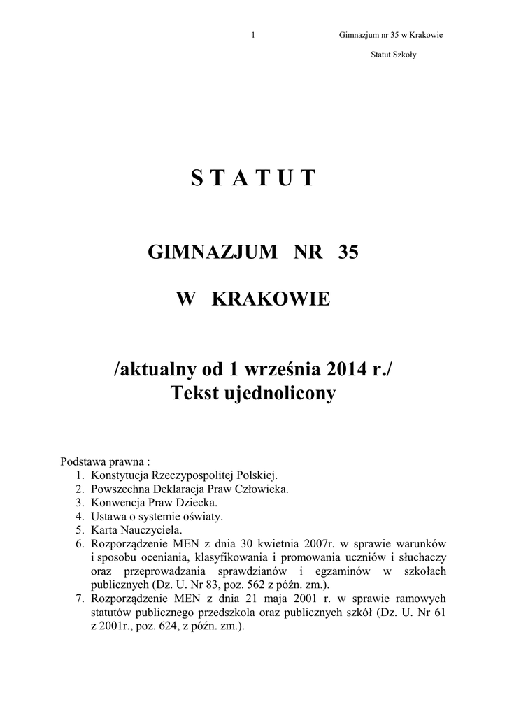 1 Gimnazjum nr 35 w Krakowie Statut Szkoły STATUT GIMNAZJUM NR 35 W KRAKOWIE /aktualny od 1 września 2014 r./ Tekst ujednolicony Podstawa prawna : 1. Konstytucja Rzeczypospolitej Polskiej. 2. Powszechna Deklaracja Praw Człowieka. 3. Konwencja Praw Dziecka. 4. Ustawa o systemie oświaty. 5. Karta Nauczyciela. 6. Rozporządzenie MEN z dnia 30 kwietnia 2007r. w sprawie warunków i sposobu oceniania, klasyfikowania i promowania uczniów i słuchaczy oraz przeprowadzania sprawdzianów i egzaminów w szkołach publicznych (Dz. U. Nr 83, poz. 562 z późn. zm.). 7. Rozporządzenie MEN z dnia 21 maja 2001 r. w sprawie ramowych statutów publicznego przedszkola oraz publicznych szkół (Dz. U. Nr 61 z 2001r., poz. 624, z późn. zm.). 2 Gimnazjum nr 35 w Krakowie Statut Szkoły Spis treści Postanowienia ogólne……………………………………………………..3 Cele i zadania gimnazjum………………………………………………...4 Zasady działania i współpracy organów gimnazjum……………………..5 Organizacja gimnazjum…………………………………………………10 Nauczyciele i inni pracownicy gimnazjum……………………………...13 Współpraca z rodzicami…………………………………………………16 Uczniowie gimnazjum…………………………………………………..17 VII.1. Rekrutacja do klas pierwszych………………………….………..17 VII.2. Obowiązek szkolny………….……………………………...…....18 VII.3. Prawa uczniów……………………………………………....…...18 VII.4. Obowiązki uczniów………….……………………………....…...19 VII.5. Nagrody i kary……………….……………………………...…...20 VIII. Ocenianie wewnątrzszkolne………………………………………..……22 VIII.1. Zasady ogólne…………………………………..……………….22 VIII.2. Ocenianie przedmiotów humanistycznych…………..………….28 VIII.3. Ocenianie języków obcych……………………………………....29 VIII.4. Ocenianie przedmiotów matematyczno – przyrodniczych…...…30 VIII.5. Ocenianie wychowania fizycznego………………………...……30 VIII.6. Ocenianie zachowania………………………………………..31 VIII.7. Warunki i tryb uzyskania wyższej niż przewidywana rocznej oceny klasyfikacyjnej zachowania i zajęć edukacyjnych……36 VIII.8. Zgodność wystawianych ocen z przepisami prawa.………….....36 IX. Zasady gospodarki finansowej…………………………………………..44 X. Postanowienia końcowe………………………………………………....45 I. II. III. IV. V. VI. VII. 3 Gimnazjum nr 35 w Krakowie Statut Szkoły Rozdział I Postanowienia ogólne §1 1. 2. 3. 4. 5. Nazwa szkoły: Gimnazjum nr 35. Siedziba szkoły: Kraków, ul. Limanowskiego 60-62. Organ prowadzący: Gmina Kraków. Organ sprawujący nadzór pedagogiczny: Małopolski Kurator Oświaty. Do obszaru działania szkoły należy obwód szkolny określony uchwałą Rady Miasta Krakowa. §2 1. Gimnazjum nosi imię Zofii Chrzanowskiej. Zofia (właściwie Anna Dorota) Chrzanowska, żona pułkownika Jana Samuela Chrzanowskiego, żyła w XVII wieku, wsławiła się wielką odwagą podczas obrony polskiego grodu Trembowli nad rzeką Seret, na Podolu. W 1675 roku za panowania króla Jana III Sobieskiego, stojąc wraz z mężem na czele nielicznej załogi grodu, przyczyniła się do odparcia nacierających głównych sił turecko-tatarskich. Opiekując się chorymi i rannymi, dała przykład bohaterskiej postawy mobilizującej innych do aktywnej obrony miasta. Pułkownik Jan Samuel Chrzanowski pochodzący ze stanu mieszczańskiego, w 1676 roku uzyskał za zasługi tytuł szlachecki. Obywatele Podgórza, budując dla swych córek szkołę zwaną Ludową, wybrali Zofię Chrzanowską na patronkę szkoły. 2. Gimnazjum ma swój hymn: 3. Gimnazjum na swoje godło i sztandar: 4 Gimnazjum nr 35 w Krakowie Statut Szkoły 4. 5. Gimnazjum podtrzymuje ceremoniał szkoły, w tym biało-granatowy strój galowy i krawat z emblematem szkoły oraz strój codzienny dowolny, przyzwoity, w stonowanych kolorach, schludny i pozbawiony ekstrawaganckich ozdób. Strój szkolny ustala dyrektor w porozumieniu z Radą Rodziców, po zasięgnięciu opinii Rady Pedagogicznej i Samorządu Uczniowskiego. §3 1. 2. 3. Gimnazjum jest szkołą publiczną, która kształci uczniów na podbudowie sześcioletniej szkoły podstawowej. Nauka w Gimnazjum trwa trzy lata i kończy się uzyskaniem świadectwa ukończenia szkoły. Gimnazjum zapewnia bezpłatne nauczanie w zakresie podstawy programowej. §4 1. 2. 3. Gimnazjum jest jednostką budżetową. Posiada wyodrębniony rachunek bankowy. Jest jednostką samobilansującą i prowadzi księgi rachunkowe zgodnie z obowiązującymi przepisami w tym zakresie. Rozdział II Cele i zadania gimnazjum §5 Szkoła realizuje cele i zadania określone w ustawie o systemie oświaty oraz w przepisach wydanych na jej podstawie, w szczególności: 1. Umożliwia zdobycie wiedzy i umiejętności niezbędnych do uzyskania świadectwa ukończenia szkoły i podjęcia dalszego kształcenia. 2. Kształtuje postawy wychowawcze zgodnie z akceptowanym społecznie Programem Wychowawczym Szkoły. 3. Zapobiega patologiom, niedostosowaniom społecznym, walczy z nałogami zgodnie z Programem Profilaktyki. 4. Otacza opieką wszystkich uczniów i zapewnia im bezpieczeństwo podczas zajęć programowych, odpowiednio do ich potrzeb i możliwości szkoły. 5. Udziela pomocy rodzicom w wypełnianiu przez nich funkcji wychowawczo– opiekuńczych. 6. Zapewnia pomoc psychologiczno – pedagogiczną wszystkim uczniom oraz organizuje opiekę nad tymi, którym z przyczyn rozwojowych, rodzinnych i losowych potrzebne jest organizowanie zajęć wyrównawczych lub innych form pomocy. 7. Zapewnia odpowiednie warunki nauczania. 8. Rozwija s