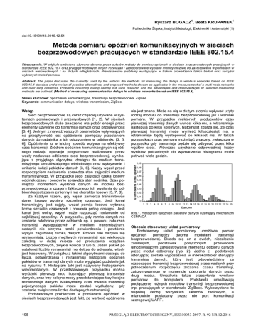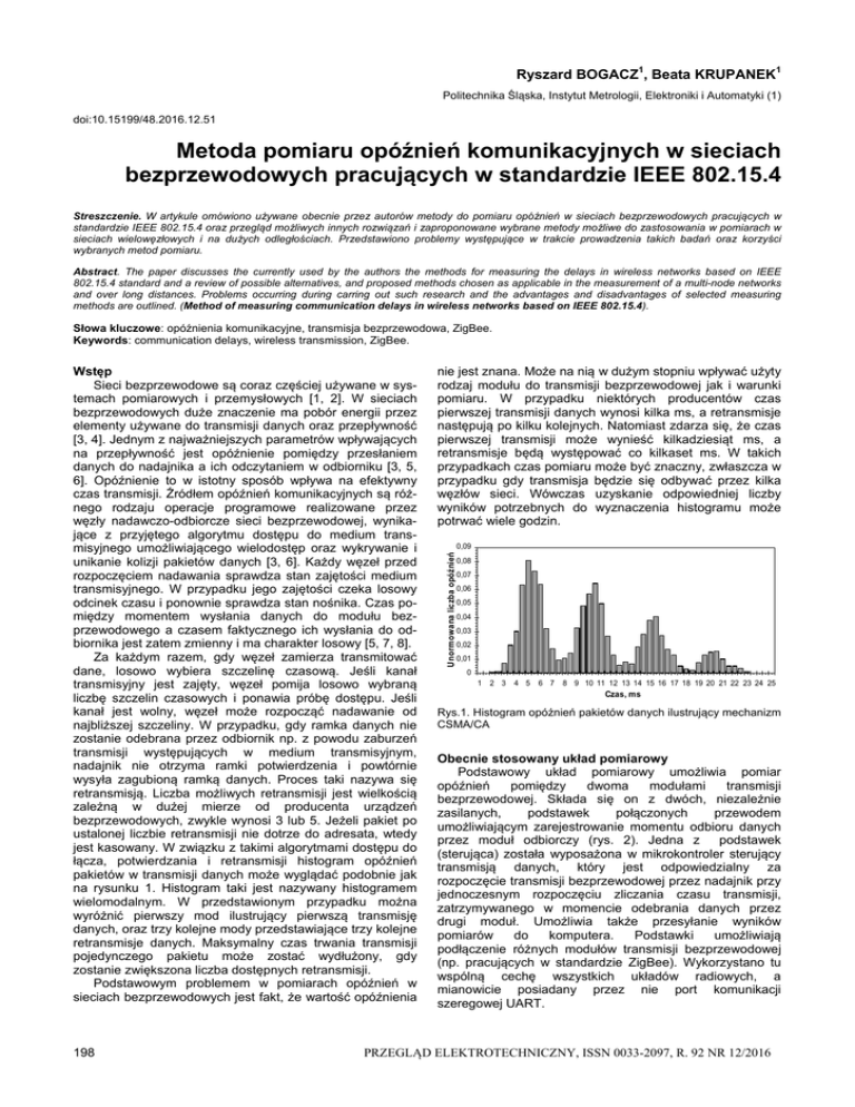 Ryszard BOGACZ1, Beata KRUPANEK1 Politechnika Śląska, Instytut Metrologii, Elektroniki i Automatyki (1) doi:10.15199/48.2016.12.51 Metoda pomiaru opóźnień komunikacyjnych w sieciach bezprzewodowych pracujących w standardzie IEEE 802.15.4 Streszczenie. W artykule omówiono używane obecnie przez autorów metody do pomiaru opóźnień w sieciach bezprzewodowych pracujących w standardzie IEEE 802.15.4 oraz przegląd możliwych innych rozwiązań i zaproponowane wybrane metody możliwe do zastosowania w pomiarach w sieciach wielowęzłowych i na dużych odległościach. Przedstawiono problemy występujące w trakcie prowadzenia takich badań oraz korzyści wybranych metod pomiaru. Abstract. The paper discusses the currently used by the authors the methods for measuring the delays in wireless networks based on IEEE 802.15.4 standard and a review of possible alternatives, and proposed methods chosen as applicable in the measurement of a multi-node networks and over long distances. Problems occurring during carring out such research and the advantages and disadvantages of selected measuring methods are outlined. (Method of measuring communication delays in wireless networks based on IEEE 802.15.4). Słowa kluczowe: opóźnienia komunikacyjne, transmisja bezprzewodowa, ZigBee. Keywords: communication delays, wireless transmission, ZigBee. 198 nie jest znana. Może na nią w dużym stopniu wpływać użyty rodzaj modułu do transmisji bezprzewodowej jak i warunki pomiaru. W przypadku niektórych producentów czas pierwszej transmisji danych wynosi kilka ms, a retransmisje następują po kilku kolejnych. Natomiast zdarza się, że czas pierwszej transmisji może wynieść kilkadziesiąt ms, a retransmisje będą występować co kilkaset ms. W takich przypadkach czas pomiaru może być znaczny, zwłaszcza w przypadku gdy transmisja będzie się odbywać przez kilka węzłów sieci. Wówczas uzyskanie odpowiedniej liczby wyników potrzebnych do wyznaczenia histogramu może potrwać wiele godzin. 0,09 Unorm owana liczba opóźnień Wstęp Sieci bezprzewodowe są coraz częściej używane w systemach pomiarowych i przemysłowych [1, 2]. W sieciach bezprzewodowych duże znaczenie ma pobór energii przez elementy używane do transmisji danych oraz przepływność [3, 4]. Jednym z najważniejszych parametrów wpływających na przepływność jest opóźnienie pomiędzy przesłaniem danych do nadajnika a ich odczytaniem w odbiorniku [3, 5, 6]. Opóźnienie to w istotny sposób wpływa na efektywny czas transmisji. Źródłem opóźnień komunikacyjnych są różnego rodzaju operacje programowe realizowane przez węzły nadawczo-odbiorcze sieci bezprzewodowej, wynikające z przyjętego algorytmu dostępu do medium transmisyjnego umożliwiającego wielodostęp oraz wykrywanie i unikanie kolizji pakietów danych [3, 6]. Każdy węzeł przed rozpoczęciem nadawania sprawdza stan zajętości medium transmisyjnego. W przypadku jego zajętości czeka losowy odcinek czasu i ponownie sprawdza stan nośnika. Czas pomiędzy momentem wysłania danych do modułu bezprzewodowego a czasem faktycznego ich wysłania do odbiornika jest zatem zmienny i ma charakter losowy [5, 7, 8]. Za każdym razem, gdy węzeł zamierza transmitować dane, losowo wybiera szczelinę czasową. Jeśli kanał transmisyjny jest zajęty, węzeł pomija losowo wybraną liczbę szczelin czasowych i ponawia próbę dostępu. Jeśli kanał jest wolny, węzeł może rozpocząć nadawanie od najbliższej szczeliny. W przypadku, gdy ramka danych nie zostanie odebrana przez odbiornik np. z powodu zaburzeń transmisji występujących w medium transmisyjnym, nadajnik nie otrzyma ramki potwierdzenia i powtórnie wysyła zagubioną ramką danych. Proces taki nazywa się retransmisją. Liczba możliwych retransmisji jest wielkością zależną w dużej mierze od producenta urządzeń bezprzewodowych, zwykle wynosi 3 lub 5. Jeżeli pakiet po ustalonej liczbie retransmisji nie dotrze do adresata, wtedy jest kasowany. W związku z takimi algorytmami dostępu do łącza, potwierdzania i retransmisji histogram opóźnień pakietów w transmisji danych może wyglądać podobnie jak na rysunku 1. Histogram taki jest nazywany histogramem wielomodalnym. W przedstawionym przypadku można wyróżnić pierwszy mod ilustrujący pierwszą transmisję danych, oraz trzy kolejne mody przedstawiające trzy kolejne retransmisje danych. Maksymalny czas trwania transmisji pojedynczego pakietu może zostać wydłużony, gdy zostanie zwiększona liczba dostępnych retransmisji. Podstawowym problemem w pomiarach opóźnień w sieciach bezprzewodowych jest fakt, że wartość opóźnienia 0,08 0,07 0,06 0,05 0,04 0,03 0,02 0,01 0 1 2 3 4 5 6 7 8 9 10 11 12 13 14 15 16 17 18 19 20 21 22 23 24 25 Czas, ms Rys.1. Histogram opóźnień pakietów danych ilustrujący mechanizm CSMA/CA Obecnie stosowany układ pomiarowy Podstawowy układ pomiarowy umożliwia pomiar opóźnień pomiędzy dwoma modułami transmisji bezprzewodowej. Składa się on z dwóch, niezależnie zasilanych, podstawek połączonych przewodem umożliwiającym zarejestrowanie momentu odbioru danych przez moduł odbiorczy (rys. 2). Jedna z podstawek (sterująca) została wyposażona w mikrokontroler sterujący transmisją danych, który jest odpowiedzialny za rozpoczęcie transmisji bezprzewodowej przez nadajnik przy jednoczesnym rozpoczęciu zliczania czasu transmisji, zatrzymywanego w momencie odebrania danych przez drugi moduł. Umożliwia także przesyłanie wyników pomiarów do komputera. Podstawki umożliwiają podłączenie różnych modułów transmisji bezprzewodowej (np. pracujących w standardzie ZigBee). Wykorzystano tu wspólną cechę wszystkich układów radiowych, a mianowicie posiadany przez nie port komunikacji szeregowej UART. PRZEGLĄD ELEKTROTECHNICZNY, ISSN 0033-2097, R. 92 NR 12/2016 Rys. 2. Podstawowy układ pomiarowy Początkowo wszystkie moduły zostały przystosowane do pracy w topologi