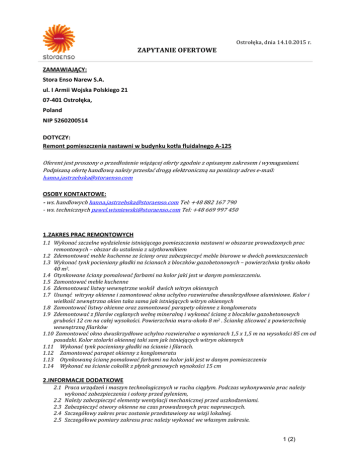 Ostrołęka, dnia 14.10.2015 r. ZAPYTANIE OFERTOWE ZAMAWIAJĄCY: Stora Enso Narew S.A. ul. I Armii Wojska Polskiego 21 07-401 Ostrołęka, Poland NIP 5260200514 DOTYCZY: Remont pomieszczenia nastawni w budynku kotła fluidalnego A-125 Oferent jest proszony o przedłożenie wiążącej oferty zgodnie z opisanym zakresem i wymaganiami. Podpisaną ofertę handlową należy przesłać drogą elektroniczną na poniższy adres e-mail: [email protected] OSOBY KONTAKTOWE: - ws. handlowych [email protected] Tel: +48 882 167 790 - ws. technicznych [email protected] Tel: +48 669 997 450 1.ZAKRES PRAC REMONTOWYCH 1.1 Wykonać szczelne wydzielenie istniejącego pomieszczenia nastawni w obszarze prowadzonych prac remontowych – obszar do ustalenia z użytkownikiem 1.2 Zdemontować meble kuchenne ze ściany oraz zabezpieczyć meble biurowe w dwóch pomieszczeniach 1.3 Wykonać tynk pocieniany gładki na ścianach z bloczków gazobetonowych – powierzchnia tynku około 40 m2. 1.4 Otynkowane ściany pomalować farbami na kolor jaki jest w danym pomieszczeniu. 1.5 Zamontować meble kuchenne 1.6 Zdemontować listwy wewnętrzne wokół dwóch witryn okiennych 1.7 Usunąć witryny okienne i zamontować okna uchylno rozwieralne dwuskrzydłowe aluminiowe. Kolor i wielkość zewnętrzna okien taka sama jak istniejących witryn okiennych 1.8 Zamontować listwy okienne oraz zamontować parapety okienne z konglomeratu 1.9 Zdemontować z filarów ceglanych wełnę mineralną i wykonać ścianę z bloczków gazobetonowych grubości 12 cm na całej wysokości. Powierzchnia muru-około 8 m2 . Ściankę zlicować z powierzchnią wewnętrzną filarków 1.10 Zamontować okno dwuskrzydłowe uchylno rozwieralne o wymiarach 1,5 x 1,5 m na wysokości 85 cm od posadzki. Kolor stolarki okiennej taki sam jak istniejących witryn okiennych 1.11 Wykonać tynk pocieniany gładki na ścianie i filarach. 1.12 Zamontować parapet okienny z konglomeratu 1.13 Otynkowaną ścianę pomalować farbami na kolor jaki jest w danym pomieszczeniu 1.14 Wykonać na ścianie cokolik z płytek gresowych wysokości 15 cm 2.INFORMACJE DODATKOWE 2.1 Praca urządzeń i maszyn technologicznych w ruchu ciągłym. Podczas wykonywania prac należy wykonać zabezpieczenia i osłony przed pyleniem, 2.2 Należy zabezpieczyć elementy wentylacji mechanicznej przed uszkodzeniami. 2.3 Zabezpieczyć otwory okienne na czas prowadzonych prac naprawczych. 2.4 Szczegółowy zakres prac zostanie przedstawiony na wizji lokalnej. 2.5 Szczegółowe pomiary zakresu prac należy wykonać we własnym zakresie. 1 (2) Ostrołęka, dnia 14.10.2015 r. ZAPYTANIE OFERTOWE 3.WIZJA LOKALNA Wizja lokalna odbędzie się w piątek dnia 16 października 2015r o godz.10. Spotkanie przed bramą osobową nr 1. Osoby uczestniczące w wizji lokalnej proszone są o zaopatrzenie w odzież ochronną tj. kask, kamizelka, okulary, obuwie z podnoskiem. Osoba odpowiedzialna za przeprowadzenie wizji lokalnej – Pan Jerzy Małkowski tel +48 602 573 873 4. CZAS REALIZACJI PRAC: Oferent proszony jest o podanie terminu wykonania od momentu otrzymania zamówienia. 5. WYMAGANA DATA ZŁOŻENIA OFERTY: Do dnia 21 października 2015r 6. TERMIN WAŻNOŚCI OFERTY: Ustala Oferent, jednak termin ważności nie może być krótszy niż do 30 listopada 2015r. 7. OFERTA POWINNA ZAWIERAĆ: a) Wartość prac z uwzględnieniem niezbędnych materiałów i narzędzi b) Termin realizacji c) Termin ważności oferty d) Warunki gwarancji (okres oczekiwany – min. 3 lata) e) Warunki płatności – min. 45 dni f) Podpisany Kodeks Postępowania dla Dostawców (Dotyczy firm, które dotychczas nie złożyły podpisanego Kodeksu) 8. POZOSTAŁE WARUNKI Stora Enso zastrzega sobie prawo do zmiany treści niniejszego Zapytania Ofertowego, jak i odrzucenia w całości Oferty bez podania przyczyny. Kupujący może zmienić treść zapytania ofertowego w trakcie całego procesu przetargu, niemniej jednak przed upływem terminu złożenia oferty. Stora Enso oświadcza, że nie jest zobowiązana do stosowania Ustawy z dnia 29 stycznia 2004 r. prawo zamówień publicznych (t.j. Dz.U,. z 2010, nr 113 poz 759). Jeśli dostawca nie stosuje się do zasad podanych w Zapytaniu Ofertowym zwłaszcza nie przestrzega terminów złożenia Oferty, Kupujący ma prawo do odrzucenia oferty. Z poważaniem Hanna Jastrzębska 2 (2)
