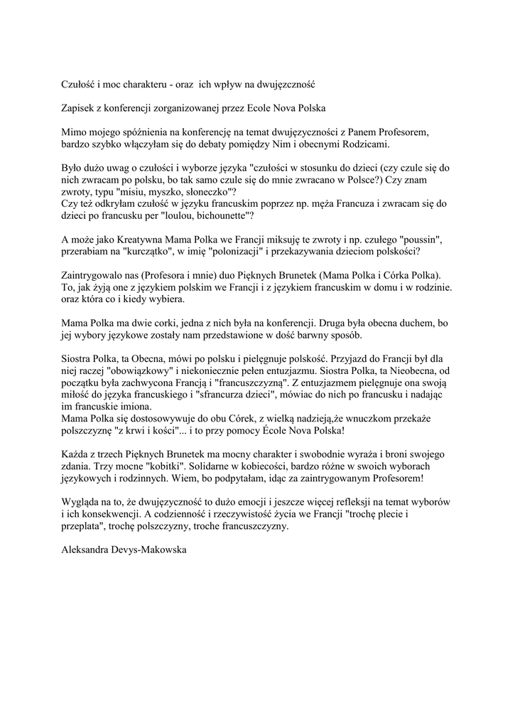 Czułość i moc charakteru - oraz ich wpływ na dwujęzczność Zapisek z konferencji zorganizowanej przez Ecole Nova Polska Mimo mojego spóźnienia na konferencję na temat dwujęzyczności z Panem Profesorem, bardzo szybko włączyłam się do debaty pomiędzy Nim i obecnymi Rodzicami. Było dużo uwag o czułości i wyborze języka "czułości w stosunku do dzieci (czy czule się do nich zwracam po polsku, bo tak samo czule się do mnie zwracano w Polsce?) Czy znam zwroty, typu "misiu, myszko, słoneczko"? Czy też odkryłam czułość w języku francuskim poprzez np. męża Francuza i zwracam się do dzieci po francusku per "loulou, bichounette"? A może jako Kreatywna Mama Polka we Francji miksuję te zwroty i np. czułego "poussin", przerabiam na "kurczątko", w imię "polonizacji" i przekazywania dzieciom polskości? Zaintrygowalo nas (Profesora i mnie) duo Pięknych Brunetek (Mama Polka i Córka Polka). To, jak żyją one z językiem polskim we Francji i z językiem francuskim w domu i w rodzinie. oraz która co i kiedy wybiera. Mama Polka ma dwie corki, jedna z nich była na konferencji. Druga była obecna duchem, bo jej wybory językowe zostały nam przedstawione w dość barwny sposób. Siostra Polka, ta Obecna, mówi po polsku i pielęgnuje polskość. Przyjazd do Francji był dla niej raczej "obowiązkowy" i niekoniecznie pełen entuzjazmu. Siostra Polka, ta Nieobecna, od początku była zachwycona Francją i "francuszczyzną". Z entuzjazmem pielęgnuje ona swoją miłość do języka francuskiego i "sfrancurza dzieci", mówiac do nich po francusku i nadając im francuskie imiona. Mama Polka się dostosowywuje do obu Córek, z wielką nadzieją,że wnuczkom przekaże polszczyznę "z krwi i kości"... i to przy pomocy École Nova Polska! Każda z trzech Pięknych Brunetek ma mocny charakter i swobodnie wyraża i broni swojego zdania. Trzy mocne "kobitki". Solidarne w kobiecości, bardzo różne w swoich wyborach językowych i rodzinnych. Wiem, bo podpytałam, idąc za zaintrygowanym Profesorem! Wygląda na to, że dwujęzyczność to dużo emocji i jeszcze więcej refleksji na temat wyborów i ich konsekwencji. A codzienność i rzeczywistość życia we Francji "trochę plecie i przeplata", trochę polszczyzny, troche francuszczyzny. Aleksandra Devys-Makowska