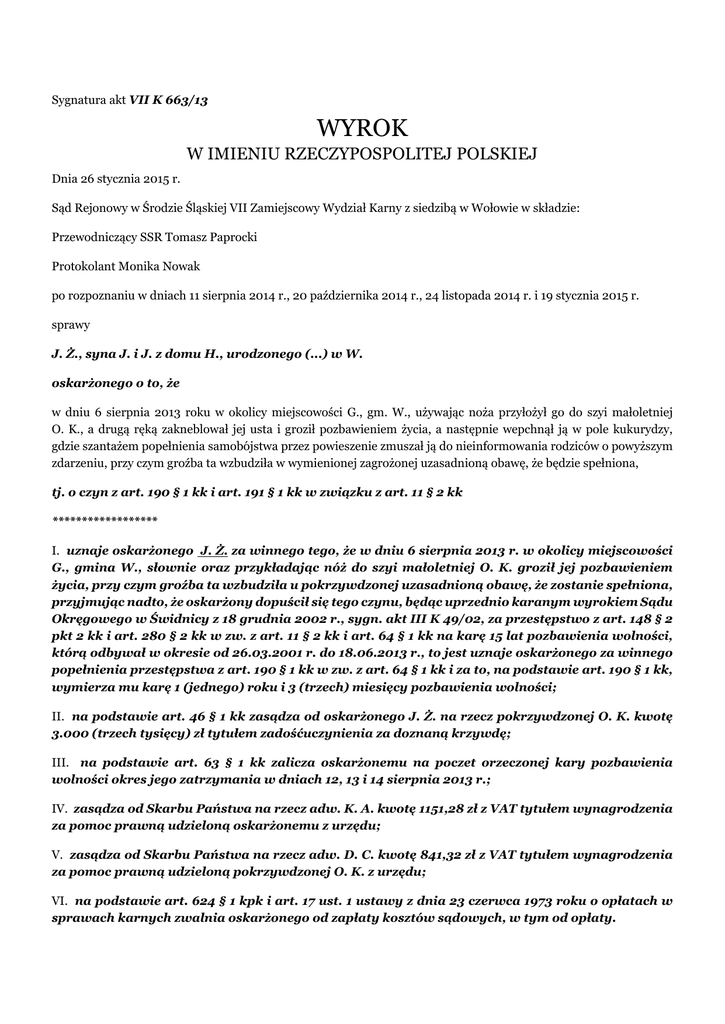 Sygnatura akt VII K 663/13 WYROK W IMIENIU RZECZYPOSPOLITEJ POLSKIEJ Dnia 26 stycznia 2015 r. Sąd Rejonowy w Środzie Śląskiej VII Zamiejscowy Wydział Karny z siedzibą w Wołowie w składzie: Przewodniczący SSR Tomasz Paprocki Protokolant Monika Nowak po rozpoznaniu w dniach 11 sierpnia 2014 r., 20 października 2014 r., 24 listopada 2014 r. i 19 stycznia 2015 r. sprawy J. Ż., syna J. i J. z domu H., urodzonego (...) w W. oskarżonego o to, że w dniu 6 sierpnia 2013 roku w okolicy miejscowości G., gm. W., używając noża przyłożył go do szyi małoletniej O. K., a drugą ręką zakneblował jej usta i groził pozbawieniem życia, a następnie wepchnął ją w pole kukurydzy, gdzie szantażem popełnienia samobójstwa przez powieszenie zmuszał ją do nieinformowania rodziców o powyższym zdarzeniu, przy czym groźba ta wzbudziła w wymienionej zagrożonej uzasadnioną obawę, że będzie spełniona, tj. o czyn z art. 190 § 1 kk i art. 191 § 1 kk w związku z art. 11 § 2 kk ****************** I. uznaje oskarżonego J. Ż. za winnego tego, że w dniu 6 sierpnia 2013 r. w okolicy miejscowości G., gmina W., słownie oraz przykładając nóż do szyi małoletniej O. K. groził jej pozbawieniem życia, przy czym groźba ta wzbudziła u pokrzywdzonej uzasadnioną obawę, że zostanie spełniona, przyjmując nadto, że oskarżony dopuścił się tego czynu, będąc uprzednio karanym wyrokiem Sądu Okręgowego w Świdnicy z 18 grudnia 2002 r., sygn. akt III K 49/02, za przestępstwo z art. 148 § 2 pkt 2 kk i art. 280 § 2 kk w zw. z art. 11 § 2 kk i art. 64 § 1 kk na karę 15 lat pozbawienia wolności, którą odbywał w okresie od 26.03.2001 r. do 18.06.2013 r., to jest uznaje oskarżonego za winnego popełnienia przestępstwa z art. 190 § 1 kk w zw. z art. 64 § 1 kk i za to, na podstawie art. 190 § 1 kk, wymierza mu karę 1 (jednego) roku i 3 (trzech) miesięcy pozbawienia wolności; II. na podstawie art. 46 § 1 kk zasądza od oskarżonego J. Ż. na rzecz pokrzywdzonej O. K. kwotę 3.000 (trzech tysięcy) zł tytułem zadośćuczynienia za doznaną krzywdę; III. na podstawie art. 63 § 1 kk zalicza oskarżonemu na poczet orzeczonej kary pozbawienia wolności okres jego zatrzymania w dniach 12, 13 i 14 sierpnia 2013 r.; IV. zasądza od Skarbu Państwa na rzecz adw. K. A. kwotę 1151,28 zł z VAT tytułem wynagrodzenia za pomoc prawną udzieloną oskarżonemu z urzędu; V. zasądza od Skarbu Państwa na rzecz adw. D. C. kwotę 841,32 zł z VAT tytułem wynagrodzenia za pomoc prawną udzieloną pokrzywdzonej O. K. z urzędu; VI. na podstawie art. 624 § 1 kpk i art. 17 ust. 1 ustawy z dnia 23 czerwca 1973 roku o opłatach w sprawach karnych zwalnia oskarżonego od zapłaty kosztów sądowych, w tym od opłaty. Sygn. akt VII K 663/13 UZASADNIENIE Sąd ustalił następujący stan faktyczny: W dniu 6 sierpnia 2013 r. O. K.(...) udała się ze swoim wujkiem J. Ż. na basen do W.. W drodze powrotnej przechodzili razem drogą przez lasek w miejscowości G.. W pewnym momencie J. Ż. podszedł do idącej przed nim O. K. i przyłożył jej prawą ręką nóż – scyzoryk – do przedniej części szyi. Stojąc za O. K., drugą ręką zasłonił jej usta łącznie z nosem i powiedział, że jeśli krzyknie, to ją zabije. Następnie wepchnął ją w znajdujące się przy drodze pole kukurydzy, odejmując nóż od szyi. Tam nakazał O. K., aby usiadła i zapytał ją, czy molestuje ją jej ojczym. Gdy O. K. odpowiedziała przecząco, J. Ż. nakazał jej, aby się uspokoiła, stwierdzając, że jeśli się nie uspokoi, to zostawi ją samą. Stwierdził także, że chciał ją nastraszyć, aby powiedziała mu prawdę. Wyciągnął także z tylnej kieszeni sznurek i powiedział do O. K., że jeśli powie rodzicom o tym zdarzeniu, to się powiesi. Następnie oboje wyszli z kukurydzy i udali się na drogę, aby wrócić do domu autostopem. Po dotarciu do W., J. Ż. odprowadził O. K. do Z. M., który odwiózł ją do domu. Skierowana do O. K. groźba wywołała u niej uzasadnioną obawę, że zostanie spełniona. Dowód: • zeznania A. K., k. 10, 161, 163, • zeznania R. S., k. 96, 181-182, • wyjaśnienia J. Ż., k. 158-160, 41, 43, • zeznania O. K., k. 171-172, 29-30, 173, • zeznania S. K., k. 180, • zeznania Z. M., k. 180-181, • zeznania H. M., k. 181, • zeznania M. M., k. 181, 92. W toku postępowania przygotowawczego i sądowego oskarżony nie przyznawał się do popełnienia zarzuconego mu czynu i składał wyjaśnienia. Sąd zważył: W świetle zebranych dowodów sprawstwo, wina i okoliczności popełnienia przez oskarżonego zarzuconego mu czynu nie budziły wątpliwości sądu. Wyjaśnieniom oskarżonego nie dano wiary w części, w której odbiegały one od poczynionych przez sąd ustaleń faktycznych. Stały bowiem w sprzeczności z zeznaniami większości świadków. Wersja wydarzeń przedstawiona przez oskarżonego była przede wszystkim sprzeczna z zeznaniami pokrzywdzonej. Zeznania te były spójne, logiczne i konsekwentne. Sąd, a także obecny przy przesłuchaniu psycholog, nie znalazł podstaw, aby zeznaniom tym odmówić wiarygodności. Zeznania pokrzywdzonej potwierdzone zostały relacją matki, której pokrzywdzona opowiedziała o zdarzeniu oraz relacją ojca. Także babcia pokrzywdzonej – M. M. – oraz jej dziadek H. M. potwierdzili relację pokrzywdzonej. Zwrócić należy uwagę, że zeznania wyżej wskazanych świadków są zbieżne, a na żadnym etapie postępowania nie pojawił się dowód, który pokazywałby, że pokrzywdzona komukolwiek i w którymkolwiek czasie przedstawiła odmienną, niż opisana w ustaleniach faktycznych, wersję wydarzeń. Zeznania R. S. również przyczyniły się do rozstrzygnięcia sprawy. Świadek nie posiadał wprawdzie konkretnej wiedzy odnośnie zdarzenia, ale potwierdzał, że oskarżony mówił mu, że krzyknął na pokrzywdzoną, aby wydobyć od niej informację, iż jest prawdą, że O. jest molestowana. Zezn