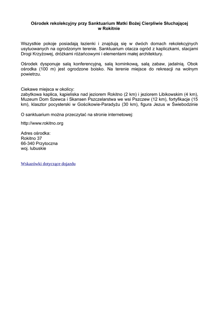 Ośrodek rekolekcyjny przy Sanktuarium Matki Bożej Cierpliwie Słuchającej w Rokitnie Wszystkie pokoje posiadają łazienki i znajdują się w dwóch domach rekolekcyjnych usytuowanych na ogrodzonym terenie. Sanktuarium otacza ogród z kapliczkami, stacjami Drogi Krzyżowej, dróżkami różańcowymi i elementami małej architektury. Ośrodek dysponuje salą konferencyjną, salą kominkową, salą zabaw, jadalnią. Obok ośrodka (100 m) jest ogrodzone boisko. Na terenie miejsce do rekreacji na wolnym powietrzu. Ciekawe miejsca w okolicy: zabytkowa kaplica, kąpieliska nad jeziorem Rokitno (2 km) i jeziorem Libikowskim (4 km), Muzeum Dom Szewca i Skansen Pszczelarstwa we wsi Pszczew (12 km), fortyfikacje (15 km), klasztor pocysterski w Gościkowie-Paradyżu (30 km), figura Jezus w Świebodzinie O sanktuarium można przeczytać na stronie internetowej: http://www.rokitno.org Adres ośrodka: Rokitno 37 66-340 Przytoczna woj. lubuskie Wskazówki dotyczące dojazdu