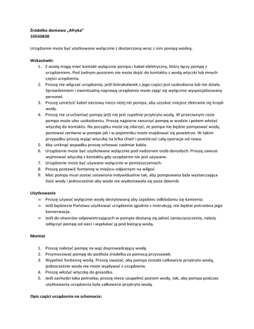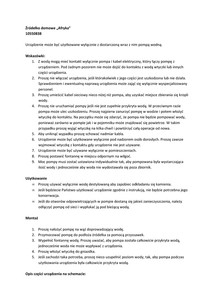 Źródełko domowe „Afryka” 10550838 Urządzenie może być użytkowane wyłącznie z dostarczoną wraz z nim pompą wodną. Wskazówki: 1. Z wodą mogą mieć kontakt wyłącznie pompa i kabel elektryczny, który łączy pompę z urządzeniem. Pod żadnym pozorem nie może dojść do kontaktu z wodą wtyczki lub innych części urządzenia. 2. Proszę nie włączać urządzenia, jeśli którakolwiek z jego części jest uszkodzona lub nie działa. Sprawdzeniem i ewentualną naprawą urządzenia może zająć się wyłącznie wyspecjalizowany personel. 3. Proszę umieścić kabel sieciowy nieco niżej niż pompa, aby uzyskać miejsce zbierania się kropli wody. 4. Proszę nie uruchamiać pompy jeśli nie jest zupełnie przykryta wodą. W przeciwnym razie pompa może ulec uszkodzeniu. Proszę najpierw zanurzyć pompę w wodzie i potem włożyć wtyczkę do kontaktu. Na początku może się zdarzyć, że pompa nie będzie pompować wody, ponieważ zarówno w pompie jak i w pojemniku może znajdować się powietrze. W takim przypadku proszę wyjąć wtyczkę na kilka chwil i powtórzyć całą operacje od nowa. 5. Aby uniknąć wypadku proszę schować nadmiar kabla. 6. Urządzenie może być użytkowane wyłącznie pod nadzorem osób dorosłych. Proszę zawsze wyjmować wtyczkę z kontaktu gdy urządzenie nie jest używane. 7. Urządzenie może być używane wyłącznie w pomieszczeniach. 8. Proszę postawić fontannę w miejscu odpornym na wilgoć. 9. Moc pompy musi zostać ustawiona indywidualnie tak, aby pompowana była wystarczająca ilość wody i jednocześnie aby woda nie wydostawała się poza zbiornik. Użytkowanie • Proszę używać wyłącznie wodę destylowaną aby zapobiec odkładaniu się kamienia. • Jeśli będziecie Państwo użytkować urządzenie zgodnie z instrukcją, nie będzie potrzebna jego konserwacja. • Jeśli do otworów odpowietrzających w pompie dostaną się jakieś zanieczyszczenia, należy odłączyć pompę od sieci i wypłukać ją pod bieżącą wodą. Montaż 1. Proszę nałożyć pompę na wąż doprowadzający wodę. 2. Przymocować pompę do podłoża źródełka za pomocą przyssawek. 3. Wypełnić fontannę wodą. Proszę uważać, aby pompa została całkowicie przykryta wodą, jednocześnie woda nie może wypływać z urządzenia. 4. Proszę włożyć wtyczkę do gniazdka. 5. Jeśli zachodzi taka potrzeba, proszę nieco uzupełnić poziom wody, tak, aby pompa podczas użytkowania urządzenia była całkowicie przykryta wodą. Opis części urządzenia na schemacie: Verbindungsrohr - Złączka Antrieb – napęd Saugnapf – przyssawki Viersiegelung – zamknięcie Rückseite – część tylna Regler – regulator