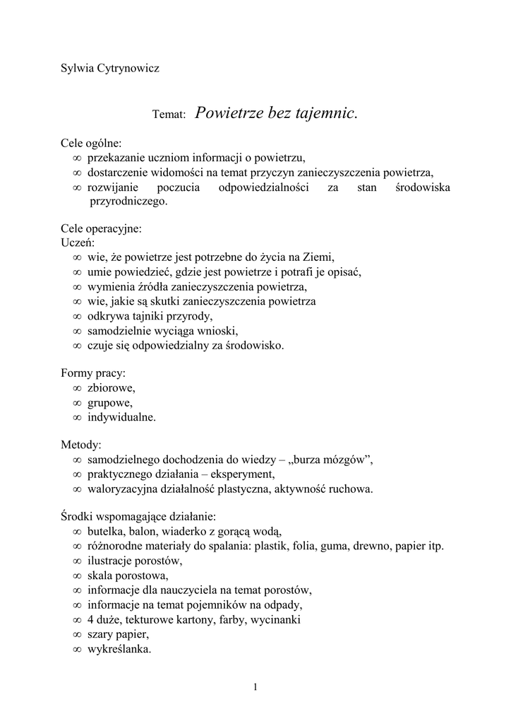 Sylwia Cytrynowicz Temat: Powietrze bez tajemnic. Cele ogólne: • przekazanie uczniom informacji o powietrzu, • dostarczenie widomości na temat przyczyn zanieczyszczenia powietrza, • rozwijanie poczucia odpowiedzialności za stan środowiska przyrodniczego. Cele operacyjne: Uczeń: • wie, Ŝe powietrze jest potrzebne do Ŝycia na Ziemi, • umie powiedzieć, gdzie jest powietrze i potrafi je opisać, • wymienia źródła zanieczyszczenia powietrza, • wie, jakie są skutki zanieczyszczenia powietrza • odkrywa tajniki przyrody, • samodzielnie wyciąga wnioski, • czuje się odpowiedzialny za środowisko. Formy pracy: • zbiorowe, • grupowe, • indywidualne. Metody: • samodzielnego dochodzenia do wiedzy – „burza mózgów”, • praktycznego działania – eksperyment, • waloryzacyjna działalność plastyczna, aktywność ruchowa. Środki wspomagające działanie: • butelka, balon, wiaderko z gorącą wodą, • róŜnorodne materiały do spalania: plastik, folia, guma, drewno, papier itp. • ilustracje porostów, • skala porostowa, • informacje dla nauczyciela na temat porostów, • informacje na temat pojemników na odpady, • 4 duŜe, tekturowe kartony, farby, wycinanki • szary papier, • wykreślanka. 1 Przebieg zajęć: (3 godziny lekcyjne) 1. Nawiązanie do tematu zajęć przed szkołą. Uczniowie zatykają palcami nos i starają się jak najdłuŜej wytrzymać. Następnie rozmawiają o tym, co się dzieje, gdy zatykamy nos i dlaczego musimy oddychać. Następnie starają się „poczuć powietrze”. 2. W klasie rozmawiają na temat tego, co czuły (jakie zapachy unosiły się w powietrzu), co to jest powietrze, kiedy moŜemy je zobaczyć (wiatr) ukierunkowane pytaniami: • Czy powietrze pachnie? • Czy powietrze moŜemy zobaczyć? • Czy powietrze istnieje? 3. Uczniowie w grupach wykonują eksperyment mający dowieść istnienie powietrza: do wiaderka napełnionego gorącą wodą wkładamy butelkę z wcześniej naciągniętym na szyjkę balonem (podgrzane powietrze z butelki wypełni balon, co dowodzi, Ŝe mimo iŜ go nie widać, powietrze wypełniało butelkę). 4. W dalszej części wracamy do doświadczeń z podwórka, zwracając szczególną uwagę na nieprzyjemne zapachy. Uczniowie zastanawiają się nad tym, skąd mogły pochodzić (dymy, spaliny samochodów itp.) i do czego mogą doprowadzić (zanieczyszczenie powietrza). By przekonać się jakie są ich źródła wykonują w grupach doświadczenie ze spalaniem róŜnych materiałów (przy czym naleŜy zachowywać szczególną ostroŜność i przygotować odpowiednio miejsce pracy). Spalają kawałki gumy, foli, papieru, drewna, plastiku. Następnie opisują barwę dymu, jego zapach i własną reakcję: • który zapach był dla nich nieprzyjemny? • jak wyglądały dymy powstające podczas spalania? • czy wszystkie materiały się spalają? • jaki wpływ mają dymy na powietrze? 5. Ocena stopnia zanieczyszczenia powietrza w najbliŜszym otoczeniu szkoły. Nauczyciel informuje dzieci, Ŝe najprościej jest ocenić stopień zanieczyszczenia powietrza obserwując porosty. Wyjaśnia im, co to za organizmy (zał.1). Następnie uczniowie oglądają ilustracje porostów (zał. 2 lub własne dostępne materiały równieŜ ze strony internetowej np. www.porosty.yoyo.pl) ). Kolejną czynnością jest omówienie skali porostowej (zał. 3, dostępnej na 2 stronie internetowej www.ekoswiat.com.pl zakładka ekologia) i wyjście przed szkołę w celu porównania występujących tam porostów ze skalą. 6. Omówienie wyników obserwacji. Wymyślanie recepty na czyste powietrze ukierunkowane pytaniem: Co moŜemy robić, by nie zanieczyszczać powietrza? Swoje pomysły uczniowie zapisują na arkuszach szarego papieru, a następnie je prezentują. 7. Odczytanie wykreślanki (hasło: Nie pal śmieci). Wykreśl dwuznaki i odczytaj hasło. sznieczchpalrzszśmieczchciszcz 8. Rozmowa na temat zastąpienia sposobu pozbywania się śmieci jakim jest palenie segregowaniem ich do odpowiednich pojemników. Nauczyciel objaśnia znaczenie kolorów pojemników na odpady i tego, co naleŜy w nich umieszczać (zał.4). 9. Wykonanie w grupach pojemników na odpady, które zostaną umieszczone w klasie. 10. Podsumowanie zajęć. Giełda pomysłów: zwrócenie uwagi mieszkańców okolicy na problem zanieczyszczania powietrza. 3