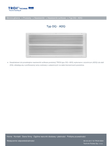 Strona główna > Produkty > Nawiewniki > Nawiewniki sufitowe > Typ DQ · ADQ Typ DQ · ADQ Kwadratowe lub prostokątne nawiewniki sufitowe produkcji TROX typu DQ • ADQ, wykonane z aluminium (ADQ) lub stali (DQ), składają się z profilowanej ramy czołowej z ustawionymi na stałe kierownicami powietrza. Home Kontakt Dane firmy Ogólne warunki dostawy i płatności Polityka prywatności Wyłączenie odpowiedzialności 08-03-2017 © TROX BSH Technik Polska Sp. z o.o. Strona główna > Produkty > Nawiewniki > Nawiewniki sufitowe > Typ DQ · ADQ OPIS URZĄDZENIA Kwadratowe lub prostokątne nawiewniki sufitowe produkcji TROX typu DQ • ADQ wykonane z aluminium (ADQ) lub stali (DQ), składają się z profilowanej ramy czołowej z ustawionymi na stałe kierownicami powietrza. Przewidziane są przede wszystkim do poziomego rozprowadzenia powietrza przy gładkim suficie. Wybór ilości kierunków nawiewu zależy od geometrii pomieszczenia – nawiew może być realizowany od 1-go do 4-ech kierunków. Mogą być stosowane zarówno w instalacjach nawiewnych, jak i wywiewnych. TECHNOLOGIA kwadratowe, prostokątne 55 – 830 l/s 200 – 3,000 m³/h 120 – 1,760 cfm 464, 564 i 589 mm prostokątne: L: 473– 1,273 mm H: 264 – 589 mm Home Kontakt Dane firmy Ogólne warunki dostawy i płatności Polityka prywatności Wyłączenie odpowiedzialności 08-03-2017 © TROX BSH Technik Polska Sp. z o.o. Strona główna > Produkty > Nawiewniki > Nawiewniki sufitowe > Typ DQ · ADQ TROX BSH Technik Polska Sp. z o.o. Kontakt online Formularz kontaktowy Kontakt TROX BSH Stara Iwiczna Zgłoszenie usterki Zapytanie ofertowe - szafy Telefon: +48 22 73718 58 Fax: +48 22 737 18 59 Tel. Komórkowy: +48 662 129 415 Kontakt TROX BSH Technik Polska Sp. z o.o. ul. Kolejowa 13, Stara Iwiczna 05-500 Piaseczno telefon +48 22 737 18 58 fax +48 22 737 18 59 e-mail: [email protected] Home Kontakt Dane firmy Ogólne warunki dostawy i płatności Polityka prywatności Wyłączenie odpowiedzialności 08-03-2017 © TROX BSH Technik Polska Sp. z o.o.