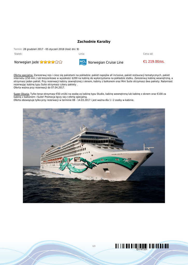 Zachodnie Karaiby Termin: 28 grudzień 2017 - 05 styczeń 2018 (ilość dni: 9) Statek: Norwegian Jade Linia: Cena od: Norwegian Cruise Line €1 219.00/os. Oferta specjalna: Zarezerwuj rejs i ciesz się pakietami na pokładzie: pakiet napojów all inclusive, pakiet restauracji tematycznych, pakiet internetu (250 min.) lub kieszonkowe w wysokości $200 na kabinę do wykorzystania na pokładzie statku. Zarezerwuj kabinę wewnętrzną, a otrzymasz jeden pakiet. Przy rezerwacji kabiny zewnętrznej z oknem, kabiny z balkonem oraz Mini Suite otrzymasz dwa pakiety. Natomiast rezerwując kabinę typu Suite otrzymasz cztery pakiety . Oferta ważna przy rezerwacji do 07.04.2017. Super Okazja: Tylko teraz otrzymasz €50 zniżki na osobę za kabinę typu Studio, kabinę wewnętrzną lub kabinę z oknem oraz €100 za kabinę z balkonem i Suite! Promocja łączy się z ofertą specjalną. Oferta obowiązuje tylko przy rezerwacji w terminie 08 - 14.03.2017 i jest ważna dla 1 i 2 osoby w kabinie. 1/3 EV:47331 TRASA REJSU dzień 1 Data Port Wpłynięcie Wypłynięcie czwartek 28.12.2017 Miami, Floryda --:-- 16:00 Dzień na morzu --:-- --:-- Roatan 10:00 18:00 08:00 17:00 08:00 16:00 11:00 20:00 08:00 17:00 dzień 2 piątek 29.12.2017 dzień 3 sobota 30.12.2017 dzień 4 Stany Zjednoczone Honduras niedziela 31.12.2017 Harvest Caye poniedziałek 01.01.2018 Santo Tomas de Castilla wtorek 02.01.2018 Cozumel środa 03.01.2018 Costa Maya dzień 8 czwartek 04.01.2018 Dzień na morzu --:-- --:-- dzień 9 piątek 05.01.2018 Miami, Floryda 08:00 --:-- dzień 5 dzień 6 dzień 7 Legenda Belize Gwatemala Meksyk Meksyk Stany Zjednoczone CENNIK Cena katalogowa Kabina wewnętrzna od 5 425.16zł Kabina zewnętrzna z oknem od 6 448.77zł Kabina zewnętrzna z balkonem od 9 964.67zł Suite (apartament) od 11 210.81zł Kabina jednoosobowa na zapytanie 3 i 4 osoba dorosła w kabinie na zapytanie Cena promocyjna 2/3 EV:47331 dziecko od 2 do 17 lat jako 3 i 4 osoba w kabinie na zapytanie dziecko od 0 do 2 lat jako 3 i 4 osoba w kabinie na zapytanie Opłaty portowe w cenie Uwaga! Ceny za osobę w kabinie dwuosobowej. Cena zawiera: zakwaterowanie w kabinie wybranej kategorii; wyżywienie - 3 główne posiłki, przekąski między posiłkami, bufet lub przekąski o północy; napoje serwowane do śniadania i w bufetach samoobsługowych; serwis bagażowy podczas wejścia i zejścia ze statku; serwis kabinowy; korzystanie ze wszystkich urządzeń sportowo - rekreacyjnych znajdujących się na pokładzie statku (basen, jacuzzi, sala fitness, itp.); udział we wszystkich imprezach organizowanych na statku (przedstawienia w teatrze, koncerty, programy animacyjne itp.). Cena nie zawiera: kosztów dojazdu do portu; ewentualnych noclegów w hotelu przed/po rejsie i transferów; wycieczek fakultatywnych w trakcie rejsu; korzystania z barów, mini baru w kabinie oraz napojów zamawianych w restauracji; korzystania z punktów usługowych (fryzjer, pralnia, fotograf, salon piękności i odnowy biologicznej, internet) i wydatków osobistych; napiwków dla obsługi na statku (kwota uzależniona od długości rejsu); ubezpieczenia KL, NNW i bagaż, kosztów wiz (tam gdzie wymagane). 3/3 EV:47331