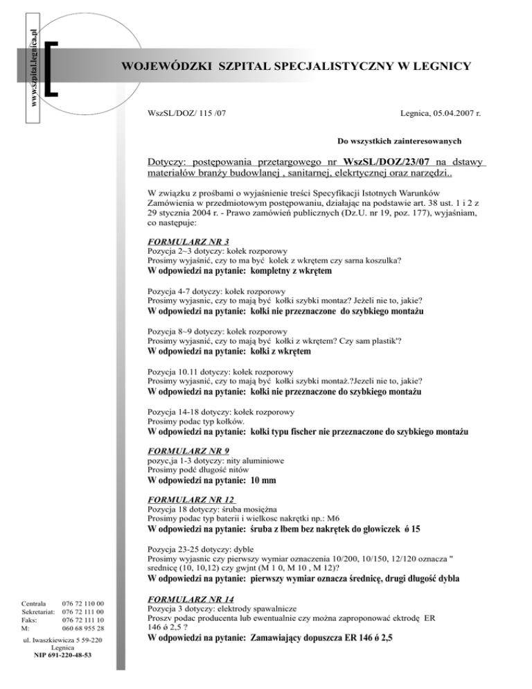 www.szpital.legnica.pl WOJEWÓDZKI SZPITAL SPECJALISTYCZNY W LEGNICY WszSL/DOZ/ 115 /07 Legnica, 05.04.2007 r. Do wszystkich zainteresowanych Dotyczy: postępowania przetargowego nr WszSL/DOZ/23/07 na dstawy materiałów branży budowlanej , sanitarnej, elekrtycznej oraz narzędzi.. W związku z prośbami o wyjaśnienie treści Specyfikacji Istotnych Warunków Zamówienia w przedmiotowym postępowaniu, działając na podstawie art. 38 ust. 1 i 2 z 29 stycznia 2004 r. - Prawo zamówień publicznych (Dz.U. nr 19, poz. 177), wyjaśniam, co następuje: FORMULARZ NR 3 Pozycja 2~3 dotyczy: kołek rozporowy Prosimy wyjaśnić, czy to ma być kolek z wkrętem czy sarna koszulka? W odpowiedzi na pytanie: kompletny z wkrętem Pozycja 4-7 dotyczy: kołek rozporowy Prosimy wyjasnic, czy to mają być kołki szybki montaz? Jeżeli nie to, jakie? W odpowiedzi na pytanie: kołki nie przeznaczone do szybkiego montażu Pozycja 8~9 dotyczy: kołek rozporowy Prosimy wyjasnić, czy to mają być kołki z wkrętem? Czy sam plastik'? W odpowiedzi na pytanie: kołki z wkrętem Pozycja 10.11 dotyczy: kołek rozporowy Prosimy wyjasnić, czy to mają być kołki szybki montaż.?Jezeli nie to, jakie? W odpowiedzi na pytanie: kołki nie przeznaczone do szybkiego montażu Pozycja 14-18 dotyczy: kołek rozporowy Prosimy podac typ kołków. W odpowiedzi na pytanie: kołki typu fischer nie przeznaczone do szybkiego montażu FORMULARZ NR 9 pozyc,ja 1-3 dotyczy: nity aluminiowe Prosimy podć długość nitów W odpowiedzi na pytanie: 10 mm FORMULARZ NR 12 Pozycja 18 dotyczy: śruba mosiężna Prosimy podac typ baterii i wielkosc nakrętki np.: M6 W odpowiedzi na pytanie: śruba z łbem bez nakrętek do głowiczek ǿ 15 Pozycja 23-25 dotyczy: dyble Prosimy wyjasnic czy pierwszy wymiar oznaczenia 10/200, 10/150, 12/120 oznacza " srednicę (10, 10,12) czy gwjnt (M 1 0, M 10 , M 12)? W odpowiedzi na pytanie: pierwszy wymiar oznacza średnicę, drugi długość dybla Centrala Sekretariat: Faks: M: 076 72 110 00 076 72 111 00 076 72 111 10 060 68 955 28 ul. Iwaszkiewicza 5 59-220 Legnica NIP 691-220-48-53 FORMULARZ NR 14 Pozycja 3 dotyczy: elektrody spawalnicze Proszv podac producenta lub ewentualnie czy można zaproponować ektrodę ER E-mail: 146 ǿ 2,5 ? [email protected] W odpowiedzi na pytanie: Zamawiający dopuszcza ER 146 ǿ 2,5 FORMULARZ NR 16 Pozyc,ia 1 dotyczy: cyna do lutowania Prosimy podać czy to ma być cyna w laskach czy drut? Jezeli drut to poszę też podać srednicę. W odpowiedzi na pytanie: drut z kalafonią o średnicy 1,5 mm FOR M ULARZ NR 21 Pozycja 2 dotyczy: zamek nawierzchniowy Prosimy podać wymiary zamka np.: 60 tub 50 W odpowiedzi na pytanie: wymiar zamka 60 Pozycja 4 dotyczy: zamek wpuszczany Prosimy okreslić czy to ma być zamek na wkładkę czy na klucz zwykły? W odpowiedzi na pytanie: zamek na wkładkę Pozycja 5 dotyczy: zamki kulkowe Prosimy podać wymiary zamka. W odpowiedzi na pytanie: 120/35 i 100/25 Pozycja 6 dotyczy: zamki wpuszczane Prosimy podać szerokość zamka np.: 72/50 .llib 72/60 W odpowiedzi na pytanie: szerokość zamka 72/60 FORMULARZ NR 22 Pozycja 1 dotyczy: zawiasy Prosimy podać wymiary W odpowiedzi na pytanie: wymiar 75/90 „fapim” Pozycja .2 dotyczy: zawiasy Proszę podać średnicę W odpowiedzi na pytanie: średnica ǿ 8 Pozycja 4 dotyczy: zawiasy Proszę podać średnicę W odpowiedzi na pytanie: średnica ǿ 10 FORMULARZ NR 29 Pozycja 3 dotyczy: cęgi monterskie Prosimy podać wymiary W odpowiedzi na pytanie: wymiar „180” Pozycja 15-16 dotyczy: kielnia prosimy podać wymiar (jaka duża) np.: 160 W odpowiedzi na pytanie: Tak 160 Pozycja 22 dotyczy: kombinerki Prosimy podać rozmiar W odpowiedzi na pytanie: rozmiar „180” Pozycja 24 - 25 dotyczy: komplet kluczy Proszę określić , jaki to ma być kwadrat! Np.: ½ " lub ¾" W odpowiedzi na pytanie: kwadrat ½ Pozycja 29~30 dotyczy: przecinak Proszę okreslić, jaki to ma byc SDS PLUS czy SDS MAX oraz długość. W odpowiedzi na pytanie: SDS MAX Pozycja 32 dotyczy: mieszadła Proszę podać średnicę W odpowiedzi na pytanie: średnica ǿ 12 mm Pozycja 33 dotyczy: miotły Proszę podać szerokość. Czy to ma być włoś naturalny czy sztuczny? W odpowiedzi na pytanie: ma to być włoś sztuczny Pozycja 46 dotyczy: nożyce ręczne Proszę określić czy to mają być prawe, lewe czy proste ? W odpowiedzi na pytanie: maja to być nożyce proste Pozycja 58-59 dotyczy: papier ścierny Proszę określić , jaki to ma być: papier czy płótno w arkuszach? W odpowiedzi na pytanie: arkusze płótno Pozycja 61-62 dotyczy: pędzel Proszę podać szerokość W odpowiedzi na pytanie: ławkowiec dł. 20 cm., tapeciak dl. 15 cm. Pozycja 73 dotyczy: piła elektryczna Proszę podać średnicę tarczy W odpowiedzi na pytanie: średnica tarczy 190 mm. Pozycja 79 dotyczy: przecinak ślusarski Proszę podać długość i inne wymiary W odpowiedzi na pytanie: 300mm/40mm Pozycja 85 dotyczy: rączka do spawania Proszę podać typ i określić, jaka ma być duża ? W odpowiedzi na pytanie: do elektrod 1,5 do 4,0 Pozycja 92 dotyczy : szczotka druciana Proszę określić wymiar i ilość rzędow. W odpowiedzi na pytanie: 5 rzędowe / 140 pozycja 93-95 dotyczy: szczypce Proszę podać wymiar, np.: 160mm i okreslić jakle maj być duże? W odpowiedzi na pytanie: wymiar 160 mm Pozycja 98 dotyczy: szlifierka stołowa Proszę podać średnicę tarczy W odpowiedzi na pytanie: średnica tarczy „ 225” Pozycja 100 dotyczy: szpachelki Proszę okreslić kształty i wielkość 1iczb sztuk z danego rodzaju. W odpowiedzi na pytanie: typowe, malarskie o kształcie prostokątnym i trojkatnym o szerokości 5-10 cm. pozycja 101 dotyczy: tarcza do betonu Proszę okrcślić czy to ma być tarcza korundowa czy diamentowa? I czy na pewno fl 125? W odpowiedzi na pytanie: tarcza korundowa 125 Pozycja 104 dotyczy: tarcza do cięcia betonu W ofercie występują tylko fi 230 . Czy zaakceptują Państwo taką tarczę ? W odpowiedzi na pytanie: zamawiaj a