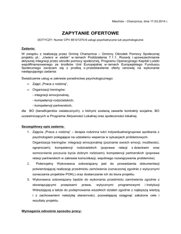 Miechów - Charsznica, dnia 17.03.2014 r. ZAPYTANIE OFERTOWE DOTYCZY: Numer CPV 85121270-6 usługi psychiatryczne lub psychologiczne Zadanie: W związku z realizacją przez Gminę Charsznica – Gminny Ośrodek Pomocy Społecznej projektu pt.: „Uwierz w siebie” w ramach Poddziałania 7.1.1. Rozwój i upowszechnianie aktywnej integracji przez ośrodki pomocy społecznej, Programu Operacyjnego Kapitał Ludzki współfinansowanego ze środków Unii Europejskiej w ramach Europejskiego Funduszu Społecznego zwracam się z prośbą o przedstawienie oferty cenowej na wykonanie następującego zadania: Świadczenie usług w zakresie poradnictwa psychologicznego: • Zajęć „Praca z rodziną”, • Organizacji treningów: - integracji emocjonalnej, - kompetencji rodzicielskich, - kompetencji partnerskich, dla BO (beneficjentów ostatecznych), z którymi zostaną zawarte kontrakty socjalne, BO uczestniczących w Programie Aktywności Lokalnej oraz społeczności lokalnej. Szczegółowy opis zadania: 1. Zajęcia „Praca z rodziną” – terapia rodzinna lub/i indywidualne/grupowe spotkania z psychologiem polegające na udzielaniu wsparcia w sytuacjach problemowych. Organizacja treningów: integracji emocjonalnej (poznanie swoich emocji, możliwości, ograniczeń); kompetencji rodzicielskich (poprawa relacji z dzieckiem oraz wzmocnienie poczucia bycia dobrym rodzicem); kompetencji partnerskich (poprawa relacji partnerskich w zakresie komunikacji, wspólnego rozwiązywania problemów). 2. Potencjalny Wykonawca zobowiązany jest do prowadzenia dokumentacji potwierdzającej realizację przedmiotu zamówienia (oznaczonej zgodnie z wytycznymi oznaczania projektów POKL) oraz dostarczanie ich do biura projektu. 3. Wykonawca zobowiązany będzie do wykonania przedmiotu zamówienia zgodnie z obowiązującymi przepisami prawa, wytycznymi programowymi i Instytucji Wdrażającej a także do podejmowania wszelkich działań zgodnie z najlepszą wiedzą i z zachowaniem należytej staranności, pozwalającej osiągnąć założone cele i rezultaty projektu. Wymagania odnośnie sposobu pracy: Wykonawca będzie świadczył usługi w ilości minimum 10 godzin miesięcznie (2 spotkania po 5 godzin), we wskazanych przez zamawiającego dniach tygodnia. Usługi będą świadczone osobiście w Miechowie - Charsznicy w pomieszczeniu wskazanym i przygotowanym przez Zamawiającego. Wymagania dotyczące kwalifikacji osób świadczących usługę poradnictwa psychologicznego: 1. Posiadanie uprawnień do wykonywania określonej działalności lub czynności. 2. Posiadanie minimum psychologicznych, w 3-letniego tym doświadczenia uczestnictwo w w świadczeniu minimum jednym usług projekcie współfinansowanym ze środków UE. Wykonawca powinien udokumentować posiadanie uprawnień, doświadczenia i wiedzy. Termin realizacji zadania: Od dnia podpisania umowy do 31 grudnia 2014 r. Miejsce realizacji zadania: Budynek Wielofunkcyjny, Miechów - Charsznica ul. Kolejowa 22, 32 – 250 Charsznica Kryteria wyboru oferty: 1. Cena brutto za wykonanie zamówienia Zamawiający dokona wyboru oferty Wykonawcy, w oparciu o następujące wytyczne: L.p. 1. Kryterium Liczba punktów (waga) Cena brutto za wykonanie zamówienia 100 Razem 100 W ramach kryterium „1 – Cena brutto za wykonanie zamówienia” Wykonawcy zostaną przyznane punkty w skali od 0 do 100 pkt, przy czym do porównania cen zostanie przyjęta podana w ofertach całkowita cena brutto za wykonanie niniejszej usługi. Punktacja w ramach tego kryterium będzie przyznawana według poniższego wzoru: cena brutto oferty minimalnej P1 = --------------------------------------------- x 100 pkt. cena brutto oferty badanej HARMONOGRAM REALIZACJI – WG WSKAZAŃ ZAMAWIAJĄCEGO Dokumenty wymagane od Wykonawcy: 1) Formularz ofertowy (zał. 1) 2) Kserokopia dokumentu potwierdzającego posiadanie uprawnień do realizacji przedmiotu zamówienia - kserokopia 3) Wykaz osób wykonujących zamówienie wraz z posiadanymi kwalifikacjami i doświadczeniem (zał. 2) 4) Wykaz przeprowadzonych usług o charakterze odpowiadającym przedmiotowi zamówienia w 3 ostatnich latach w tym minimum jednego w zakresie projektów współfinansowanych ze środków europejskich (zał. 3) Oferty proszę przysyłać do dnia 25.03.2014 r. do godziny 10:00 - drogą elektroniczną na adres: [email protected] - osobiście – Gminny Ośrodek Pomocy Społecznej, ul. Kolejowa 20, 32 – 250 Charsznica, pok. 26 - drogą pocztową na w/w adres. Niniejsze zapytanie ofertowe nie stanowi zobowiązania do zawarcia umowy. W przypadku pytań lub wątpliwości proszę o kontakt: - w sprawach merytorycznych Małgorzata Grzebień - koordynator projektu „Uwierz w siebie”, Tel. (41) 383 60 03 Adres e-mail: [email protected] W sprawach proceduralnych: - Szczepan Podlach, Tel. 604 623 980