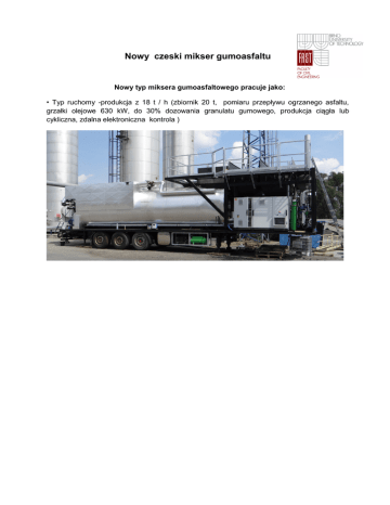 Nowy czeski mikser gumoasfaltu Nowy typ miksera gumoasfaltowego pracuje jako: • Typ ruchomy -produkcja z 18 t / h (zbiornik 20 t, pomiaru przepływu ogrzanego asfaltu, grzałki olejowe 630 kW, do 30% dozowania granulatu gumowego, produkcja ciągła lub cykliczna, zdalna elektroniczna kontrola ) • Typ stacjonarny - produkcja 25 t / h asfaltu gumowego ( zbiornik 45 t, podgrzewacz asfaltu, grzanie olejowe 350 kW, ważenie asfaltu i granulatu gumowego, produkcja ciągła i cykliczna, elektroniczna kontrola . ) Nadmiar produkcji z obu typów mikserów używa się do produkcji w innych wytwórniach mas bitumicznych. Gumoasfalt transportowany jest w ogrzewanych zbiornikach umieszczonych na naczepie.