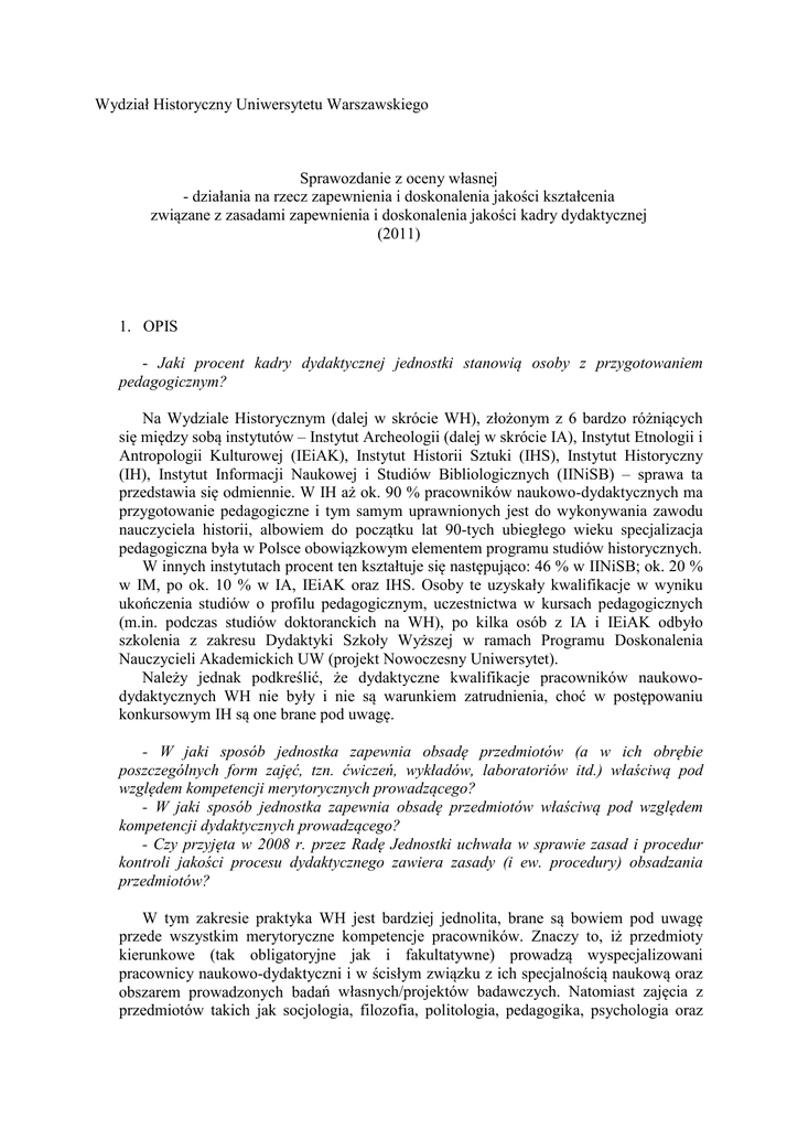 Wydział Historyczny Uniwersytetu Warszawskiego Sprawozdanie z oceny własnej - działania na rzecz zapewnienia i doskonalenia jakości kształcenia związane z zasadami zapewnienia i doskonalenia jakości kadry dydaktycznej (2011) 1. OPIS - Jaki procent kadry dydaktycznej jednostki stanowią osoby z przygotowaniem pedagogicznym? Na Wydziale Historycznym (dalej w skrócie WH), złożonym z 6 bardzo różniących się między sobą instytutów – Instytut Archeologii (dalej w skrócie IA), Instytut Etnologii i Antropologii Kulturowej (IEiAK), Instytut Historii Sztuki (IHS), Instytut Historyczny (IH), Instytut Informacji Naukowej i Studiów Bibliologicznych (IINiSB) – sprawa ta przedstawia się odmiennie. W IH aż ok. 90 % pracowników naukowo-dydaktycznych ma przygotowanie pedagogiczne i tym samym uprawnionych jest do wykonywania zawodu nauczyciela historii, albowiem do początku lat 90-tych ubiegłego wieku specjalizacja pedagogiczna była w Polsce obowiązkowym elementem programu studiów historycznych. W innych instytutach procent ten kształtuje się następująco: 46 % w IINiSB; ok. 20 % w IM, po ok. 10 % w IA, IEiAK oraz IHS. Osoby te uzyskały kwalifikacje w wyniku ukończenia studiów o profilu pedagogicznym, uczestnictwa w kursach pedagogicznych (m.in. podczas studiów doktoranckich na WH), po kilka osób z IA i IEiAK odbyło szkolenia z zakresu Dydaktyki Szkoły Wyższej w ramach Programu Doskonalenia Nauczycieli Akademickich UW (projekt Nowoczesny Uniwersytet). Należy jednak podkreślić, że dydaktyczne kwalifikacje pracowników naukowodydaktycznych WH nie były i nie są warunkiem zatrudnienia, choć w postępowaniu konkursowym IH są one brane pod uwagę. - W jaki sposób jednostka zapewnia obsadę przedmiotów (a w ich obrębie poszczególnych form zajęć, tzn. ćwiczeń, wykładów, laboratoriów itd.) właściwą pod względem kompetencji merytorycznych prowadzącego? - W jaki sposób jednostka zapewnia obsadę przedmiotów właściwą pod względem kompetencji dydaktycznych prowadzącego? - Czy przyjęta w 2008 r. przez Radę Jednostki uchwała w sprawie zasad i procedur kontroli jakości procesu dydaktycznego zawiera zasady (i ew. procedury) obsadzania przedmiotów? W tym zakresie praktyka WH jest bardziej jednolita, brane są bowiem pod uwagę przede wszystkim merytoryczne kompetencje pracowników. Znaczy to, iż przedmioty kierunkowe (tak obligatoryjne jak i fakultatywne) prowadzą wyspecjalizowani pracownicy naukowo-dydaktyczni i w ścisłym związku z ich specjalnością naukową oraz obszarem prowadzonych badań własnych/projektów badawczych. Natomiast zajęcia z przedmiotów takich jak socjologia, filozofia, politologia, pedagogika, psychologia oraz 2 lektoraty języków specyficznych (łacina, w IH też hebrajski) powierzane są pracownikom innych, odpowiednich jednostek UW lub PAN (w IEiAK), z reguły mających stopień co najmniej doktora, lub pracownikom WH mającym ukończone 2 kierunki studiów (dotyczy to IH). Obsady zajęć dokonują w instytutach ich dyrektorzy lub wicedyrektorzy ds. studenckich na wniosek kierowników zakładów. Propozycje te zatwierdzają następnie Komisje Dydaktyczne lub Rady Naukowe Instytutów. Do prowadzenia zajęć na studiach licencjackich dopuszcza się też doktorantów WH. Najczęściej powierza się im przedmioty związane z tematyką ich dysertacji. W IH muszą oni spełnić też następujące warunki: ukończony co najmniej II rok studiów doktoranckich; udział w roli obserwatora w zajęciach prowadzonych przez promotora, kierownika zakładu lub in. pracownika samodzielnego zakładu (minimum przez semestr); doświadczenie dydaktyczne ze studenckiego objazdu naukowego; omówiony i zaakceptowany przez kierownika zakładu sylabus przedmiotu. Zajęcia pracowników i doktorantów hospitowane są zgodnie z „Uchwałą nr 24 Rady Wydziału Historycznego UW z dnia 23 kwietnia 2008 r. w sprawie zasad i procedur kontroli jakości procesu dydaktycznego” (weszła w życie 1 października 2008). Jej treść (zob. załącznik) zawiera bardzo ogólnie sformułowane zasady obsadzania przedmiotów (§ 8), te bowiem szczegółowiej ujęte są w „Regulaminie studiów na UW”. - Czy przyjęta w 2008 r. przez Radę Jednostki uchwała w sprawie zasad i procedur kontroli jakości procesu dydaktycznego umożliwia nauczycielowi akademickiemu dostęp do opinii studentów nt. jego pracy dydaktycznej wyrażonych w badaniu ankietowym? - Czy ( i w jaki sposób) omawiane są wyniki wspomnianego badania ankietowego? „Uchwała Nr 24 …” (§ 9) nakazuje przeprowadzanie takich ankiet i udostępnianie ich wyników dziekanowi, prodziekanom, dyrektorom instytutów i bezpośrednim przełożonym oraz osobom, których dotyczą, a także właściwemu organowi samorządu studentów/doktorantów. Ewaluacja zajęć poprzez doroczne ankiety oraz dostęp kadry dydaktycznej do zawartych tam opinii studentów jest zresztą na WH stałą i utrwaloną praktyką, wprowadzoną w życie znacznie wcześniej niż powstała owa uchwała. W niektórych instytutach – np. w IH i IM – stosowane są własne ankiety, gdyż te ogólnouniwersyteckie nie spełniały pokładanych w nich oczekiwań. W IH ankieta składa się wyłącznie z pytań otwartych (zob. załącznik) i ma na celu ciągłe doskonalenie procesu dydaktycznego oraz koncepcji programów dydaktycznych. Wyniki ankiet analizowane są przez dyrektorów, wicedyrektorów, kierowników zakładów i studiów niestacjonarnych, omawia się je na posiedzeniach Rad Naukowych, zebraniach pracowników instytutów i zakładów, a w szczególnych sytuacjach podczas indywidualnych rozmów z pracownikami. Wnioski wynikające z analizy mają znaczenie przy okresowych ocenach pracowników. - Czy (i w jakich wypadkach) nauczyciel akademicki jest obligowany do podnoszenia swoich kompetencji dydaktycznych? - Czy (i w jakiej formie) jednostka zapewnia nauczycielom akademickim oraz doktorantom możliwość doskonalenia kom