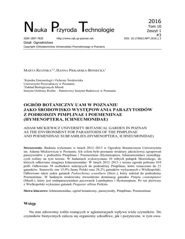 Nauka Przyroda Technologie ISSN 1897-7820 http://www.npt.up-poznan.net 2016 Tom 10 Zeszyt 1 #3 DOI: 10.17306/J.NPT.2016.1.3 Dział: Ogrodnictwo Copyright ©Wydawnictwo Uniwersytetu Przyrodniczego w Poznaniu MARTA RZAŃSKA1,2, HANNA PIEKARSKA-BONIECKA1 1 Katedra Entomologii i Ochrony Środowiska Uniwersytet Przyrodniczy w Poznaniu 2 Zakład Biologicznych Metod Instytut Ochrony Roślin – Państwowy Instytut Badawczy w Poznaniu OGRÓD BOTANICZNY UAM W POZNANIU JAKO ŚRODOWISKO WYSTĘPOWANIA PARAZYTOIDÓW Z PODRODZIN PIMPLINAE I POEMENIINAE (HYMENOPTERA, ICHNEUMONIDAE) ADAM MICKIEWICZ UNIVERSITY BOTANICAL GARDEN IN POZNAŃ AS THE ENVIRONMENT FOR PARASITOIDS OF THE PIMPLINAE AND POEMENIINAE SUBFAMILIES (HYMENOPTERA, ICHNEUMONIDAE) Streszczenie. Badania wykonano w latach 2012–2013 w Ogrodzie Botanicznym Uniwersytetu im. Adama Mickiewicza w Poznaniu. Ich celem było poznanie struktury jakościowej zgrupowań parazytoidów z podrodzin Pimplinae i Poemeniinae (Hymenoptera, Ichneumonidae) zasiedlających rośliny na tym terenie. W badaniach wykorzystano 10 żółtych pułapek Moerickego, do których odławiano imagines Ichneumonidae. W latach 2012–2013 z terenu ogrodu pobrano 410 prób. Odłowiono 58 osobników należących do podrodziny Pimplinae, które oznaczono do 21 gatunków. Stanowiły one 15,9% fauny Polski oraz 28,2% gatunków wykazanych z Wielkopolski. Odłowiono także jeden gatunek Podoschistus scutellaris (Desv.), który należał do podrodziny Poemeniinae. W badanym środowisku stwierdzono dominację gatunku Pimpla contemplator (Muell.), który jest endoparazytoidem poczwarek Lepidoptera i Hymenoptera. Po raz pierwszy z Wielkopolski wykazano gatunek Piogaster albina Perkins. Słowa kluczowe: Ichneumonidae, ogród botaniczny, parazytoidy, Pimplinae, Poemeniinae Wstęp Na stan zdrowotny roślin rosnących w aglomeracjach wpływa wiele czynników. Do czynników biotycznych zalicza się organizmy szkodliwe, jak i pożyteczne, w tym owa- 2 Rzańska, M., Piekarska-Boniecka, H. (2016). Ogród Botaniczny UAM w Poznaniu jako środowisko występowania parazytoidów z podrodzin Pimplinae i Poemeniinae (Hymenoptera, Ichneumonidae). Nauka Przyr. Technol., 10, 1, #3. DOI: 10.17306/J.NPT.2016.1.3 dy pasożytnicze. Należą do nich m.in. parazytoidy z rodziny Ichneumonidae (Hymenoptera, Apocrita), ponieważ regulują liczebność populacji wielu szkodników żerujących w tym środowisku. Światowa i krajowa literatura dotycząca zagadnień związanych z parazytoidami z rodziny Ichneumonidae jest bardzo uboga. Badania nad tą grupą owadów w terenach zieleni miejskiej prowadzili m.in. Minami i in. (1999) w Japonii oraz Georgiev (2000) w Bułgarii, a w Polsce Sawoniewicz (1982, 1986) w Warszawie oraz Piekarska-Boniecka (2004) i Piekarska-Boniecka i in. (2009a, 2009b) w Kórniku i Poznaniu. Podjęto badania, których celem było poznanie struktury jakościowej zgrupowań parazytoidów z wybranych podrodzin Ichneumonidae zasiedlających roślinność jednego z największych terenów zieleni miasta Poznania, jakim jest Ogród Botaniczny Uniwersytetu im. Adama Mickiewicza. Materiał i metody Badania nad występowaniem parazytoidów z rodziny Ichneumonidae wykonano w latach 2012–2013 na terenie Ogrodu Botanicznego Uniwersytetu im. Adama Mickiewicza w Poznaniu. Obiekt ten zajmuje powierzchnię 22 ha i jest usytuowany w zachodniej części miasta (52o25ʹ N, 16o53ʹ E). Ogród jest podzielony na osiem działów. Badania prowadzono w sześciu następujących działach: dendrologia, ekologia, geografia roślin, rośliny ozdobne, rośliny rzadkie i chronione oraz rośliny wodne i szuwarowe. W dziale dendrologii rosną drzewa i krzewy charakteryzujące się bardzo dobrymi walorami dekoracyjnymi, m.in. magnolie, forsycje, bzy lilaki, tawuły i jaśminowce. Dział ekologiczny eksponuje różne typy zbiorowisk roślinnych, takich jak łąki, lasy i wydmy. Dużą jego część zajmuje las dębowo-grabowy. Dział geografii roślin ukazuje zróżnicowanie szaty roślinnej Ziemi w układzie stref klimatyczno-roślinnych. Na kwaterach tego działu rosną m.in. unikalne w polskich kolekcjach: buk karbowany, głowocis japoński, lipa japońska i wiąz japoński. Barwne zbiory działu roślin ozdobnych są uzupełnieniem kolekcji botanicznych. Na szczególną uwagę zasługuje kolekcja piwonii, liliowców i irysów oraz ogród różany. W dziale roślin rzadkich i chronionych można podziwiać m.in. storczyki, mniszka pienińskiego, żmijowca czerwonego. Ostatni z działów gromadzi około 140 roślin wodnych i szuwarowych. Wśród nich znajdują się turzyce błotne, tulejniki kamczackie i rokrocznie sadzony ryż siewny. Badaniami objęto gąsienicznikowate należące do podrodzin Pimplinae i Poemeniine (Hymenoptera, Ichneumonidae). Wykorzystano metodę odłowu dorosłych osobników parazytoidów do żółtych pułapek Moerickego. W obu latach badań na terenie ogrodu umieszczono łącznie 10 takich pułapek. Lokalizowano je w odległości nie mniejszej niż 100 m od siebie, w miejscach dobrze nasłonecznionych i osłoniętych od wiatru. Odłowy prowadzono od 1 kwietnia do 31 października każdego roku badań, a próby pozyskiwano w odstępach dekadowych. W okresie prowadzenia badań w ogrodzie nie stosowano środków ochrony roślin. Warunki pogodowe panujące w latach 2012–2013 były do siebie bardzo zbliżone. Oba lata można ocenić podobnie – jako ciepłe, a zarazem wilgotne. 3 Rzańska, M., Piekarska-Boniecka, H. (2016). Ogród Botaniczny UAM w Poznaniu jako środowisko występowania parazytoidów z podrodzin Pimplinae i Poemeniinae (Hymenoptera, Ichneumonidae). Nauka Przyr. Technol., 10, 1, #3. DOI: 10.17306/J.NPT.2016.1.3 Wyniki W latach 2012–2013 z terenu Ogrodu Botanicznego pobrano łącznie 410 prób. Odłowiono 58 osobników należących do podrodziny Pimplinae, które oznaczono do 21 gatunków (tab. 1). Stanowiły one 15,9% fauny Polski (Bogdanowicz i in., 2007) oraz 28,2% gatunków wykazanyc