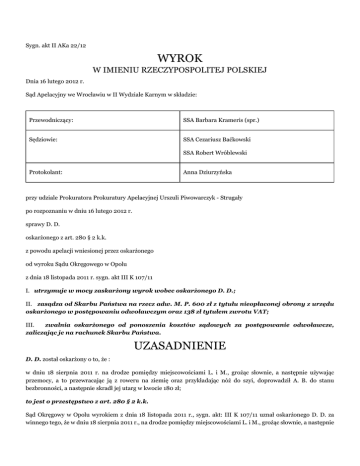 Sygn. akt II AKa 22/12 WYROK W IMIENIU RZECZYPOSPOLITEJ POLSKIEJ Dnia 16 lutego 2012 r. Sąd Apelacyjny we Wrocławiu w II Wydziale Karnym w składzie: Przewodniczący: SSA Barbara Krameris (spr.) Sędziowie: SSA Cezariusz Baćkowski SSA Robert Wróblewski Protokolant: Anna Dziurzyńska przy udziale Prokuratora Prokuratury Apelacyjnej Urszuli Piwowarczyk - Strugały po rozpoznaniu w dniu 16 lutego 2012 r. sprawy D. D. oskarżonego z art. 280 § 2 k.k. z powodu apelacji wniesionej przez oskarżonego od wyroku Sądu Okręgowego w Opolu z dnia 18 listopada 2011 r. sygn. akt III K 107/11 I. utrzymuje w mocy zaskarżony wyrok wobec oskarżonego D. D.; II. zasądza od Skarbu Państwa na rzecz adw. M. P. 600 zł z tytułu nieopłaconej obrony z urzędu oskarżonego w postępowaniu odwoławczym oraz 138 zł tytułem zwrotu VAT; III. zwalnia oskarżonego od ponoszenia kosztów sądowych za postępowanie odwoławcze, zaliczając je na rachunek Skarbu Państwa. UZASADNIENIE D. D. został oskarżony o to, że : w dniu 18 sierpnia 2011 r. na drodze pomiędzy miejscowościami L. i M., grożąc słownie, a następnie używając przemocy, a to przewracając ją z roweru na ziemię oraz przykładając nóż do szyi, doprowadził A. B. do stanu bezbronności, a następnie skradł jej utarg w kwocie 180 zł; to jest o przestępstwo z art. 280 § 2 k.k. Sąd Okręgowy w Opolu wyrokiem z dnia 18 listopada 2011 r., sygn. akt: III K 107/11 uznał oskarżonego D. D. za winnego tego, że w dniu 18 sierpnia 2011 r., na drodze pomiędzy miejscowościami L. i M., grożąc słownie, a następnie używając przemocy, a to przytrzymując za ręce, przewracając z roweru na ziemię, przytrzymując za ręce i przyciskając twarz do ziemi oraz przykładając nóż do szyi, czym spowodował u A. B. obrażenia ciała w postaci obrzęku policzka prawego i okolicy nasady nosa, obrzęku wargi górnej, rozerwania wędzidełka wargi górnej, stłuczenia okolic ramienia i łopatki lewej, zasinienia na pośladku lewym, stłuczenia kostki bocznej stopy lewej, co spowodowało naruszenie czynności narządów ciała i rozstrój zdrowia na okres trwający nie dłużej niż 7 dni, doprowadził A. B. do stanu bezbronności, a następnie zabrał w celu przywłaszczenia wydane przez pokrzywdzoną pod wpływem groźby i przemocy pieniądze w kwocie 180 tj. tj. przestępstwa z art. 280 § 2 k.k. w zw. z art. 157 § 2 k.k., w zw. z art. 11 §2 k.k. i za to na podstawie art. 280 § 2 k.k. przy zast. art. 11 § 3 k.k. wymierzył mu karę 4 lat pozbawienia wolności. Na podstawie art. 44 § 2 k.k. orzekł przepadek dowodu rzeczowego w postaci noża, opisanego w wykazie dowodów rzeczowy nr 01/6/11 pod pozycją 1. Na podstawie art. 63 § 1 k.k. zaliczył oskarżonemu na poczet orzeczonej kary pozbawienia wolności okres zatrzymania i tymczasowego aresztowania od dnia 19 sierpnia 2011 r. do dnia 18 listopada 2011 r. Na podstawie art. 29 ust. 1 ustawy z dnia 26 maja 1982 r. Prawo o adwokaturze (Dz.U. nr 16, poz. 124 z późn. zm.) zasądził od Skarbu Państwa na rzecz adw. M. P., Kancelaria Adwokacka w P. kwotę 738 zł, w tym należy podatek od towarów i usług tytułem wynagrodzenia za obronę z urzędu oskarżonego. Na podstawie art. 624 § 1 k.p.k. i art. 17 ustawy z dnia 23 czerwca 1973 r. o opłatach w sprawach karnych zwolnił oskarżonego od obowiązku zwrotu kosztów procesu, które poniesie Skarb Państwa i odstąpił od obciążania go opłatą sądową. Powyższy wyrok zaskarżył w całości obrońca oskarżonego D. D.. Na podstawie art. 438 pkt 1 i 2 k.p.k. zarzucił orzeczeniu: 1. obrazę przepisu prawa materialnego, a to art. 280 § 2 k.k. poprzez jego zastosowanie, podczas gdy z ustaleń faktycznych dokonanych przez Sąd I instancji wynika, że oskarżony popełnił przestępstwo wymuszenia rozbójniczego z art. 282 k.k. 2. obrazę przepisów postępowania, która miała wpływ na treść orzeczenia, a w szczególności naruszenie przepisu art. 4 k.p.k. oraz art. 7 k.p.k., poprzez dowolną ocenę dowodu rzeczowego w postaci noża wyrażającą się w przyjęciu, iż nóż ten stanowił niebezpieczne narzędzie oraz przepisu art. 424 § 1 pkt 1 k.p.k. poprzez brak wskazania w uzasadnieniu zaskarżonego wyroku, na jakiej podstawie uznano, iż nóż, którym posłużył się oskarżony stanowił niebezpieczne narzędzie. W oparciu o te zarzuty wniósł o: 1. zmianę zaskarżonego wyroku w pkt 1 i uznanie oskarżonego za winnego przestępstwa z art. 282 k.k. w zw. z art. 157 § 2 k.k. w zw. z art. 11 §2 k.k. i za to wymierzenie oskarżonemu kary pozbawienia wolności z warunkowym zawieszeniem jej wykonania, względnie; 2. o uchylenie tego wyroku i przekazanie sprawy Sądowi I instancji do ponownego rozpoznania. Sąd Apelacyjny zważył, co następuje. Zarzuty i wnioski zawarte w apelacji nie zasługują na uwzględnienie. Ustalenia faktyczne dokonane w niniejszej sprawie przez Sąd Okręgowy - a niekwestionowane w skardze odwoławczej – w pełni uzasadniają zastosowaną subsumpcję, tj. kwalifikację prawną z art. 280 § 2 k.k. Przebieg zdarzenia nie pozostawia wątpliwości, że oskarżony dopuścił się rozboju, a nie wymuszenia rozbójniczego. Rozbój jest przestępstwem skierowanym przeciwko osobie i mieniu. Jego istota polega na zabraniu cudzej rzeczy ruchomej w celu przywłaszczenia przy zastosowaniu szczególnego sposobu działania. Działanie, które jest skierowane na osobę – jako środek zawładnięcia rzeczą ruchomą – może polegać na użyciu przemocy wobec osoby, na groźbie jej natychmiastowego użycia lub na doprowadzeniu człowieka do stanu nieprzytomności lub bezbronności. Wymuszenie rozbójnicze ( art. 282 k.k.) jest przestępstwem skierowanym przeciwko mieniu, a jednocześnie przeciwko osobie. Polega na zmuszeniu innej osoby – za pomocą przemocy, groźby – do rozporządzenia mieniem własnym lub cudzym albo do zaprzestania działalności gospodarczej. Celem działania sprawcy jest osiągnięci