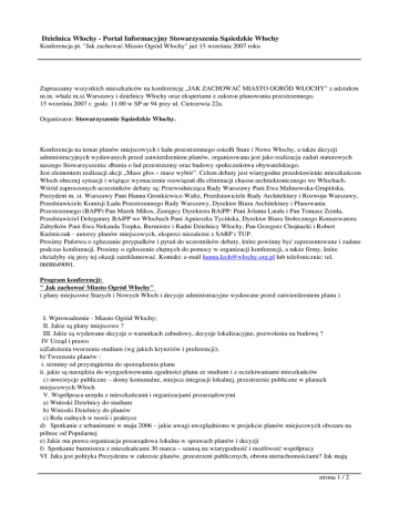 Dzielnica Włochy - Portal Informacyjny Stowarzyszenia Sąsiedzkie Włochy Konferencja pt. "Jak zachować Miasto Ogród Włochy" już 15 września 2007 roku Zapraszamy wszystkich mieszkańców na konferencję „JAK ZACHOWAĆ MIASTO OGRÓD WŁOCHY” z udziałem m.in. władz m.st.Warszawy i dzielnicy Włochy oraz ekspertami z zakresu planowania przestrzennego. 15 września 2007 r. godz. 11:00 w SP nr 94 przy ul. Cietrzewia 22a. Organizator: Stowarzyszenie Sąsiedzkie Włochy. Konferencja na temat planów miejscowych i ładu przestrzennego osiedli Stare i Nowe Włochy, a także decyzji administracyjnych wydawanych przed zatwierdzeniem planów, organizowana jest jako realizacja zadań statutowych naszego Stowarzyszenia: dbania o ład przestrzenny oraz budowy społeczeństwa obywatelskiego. Jest elementem realizacji akcji „Masz głos – masz wybór”. Celem debaty jest wiarygodne przedstawienie mieszkańcom Włoch obecnej sytuacji i wiążące wyznaczenie rozwiązań dla eliminacji chaosu architektonicznego we Włochach. Wśród zaproszonych uczestników debaty są: Przewodnicząca Rady Warszawy Pani Ewa Malinowska-Grupińska, Prezydent m. st. Warszawy Pani Hanna Gronkiewicz-Waltz, Przedstawiciele Rady Architektury i Rozwoju Warszawy, Przedstawiciele Komisji Ładu Przestrzennego Rady Warszawy, Dyrektor Biura Architektury i Planowania Przestrzennego (BAPP) Pan Marek Mikos, Zastępcy Dyrektora BAiPP: Pani Jolanta Latała i Pan Tomasz Zemła, Przedstawiciel Delegatury BAiPP we Włochach Pani Agnieszka Tycińska, Dyrektor Biura Stołecznego Konserwatora Zabytków Pani Ewa Nekanda Trepka, Burmistrz i Radni Dzielnicy Włochy, Pan Grzegorz Chojnacki i Robert Kuźmiczuk - autorzy planów miejscowych, eksperci niezależni z SARP i TUP. Prosimy Państwa o zgłaszanie przypadków i pytań do uczestników debaty, które powinny być zaprezentowane i zadane podczas konferencji. Prosimy o zgłoszenie chętnych do pomocy w organizacji konferencji, a także firmy, które chciałyby się przy tej okazji zareklamować. Kontakt: e-mail [email protected] lub telefonicznie: tel. 0608649091. Program konferencji: " Jak zachować Miasto Ogród Włochy" ( plany miejscowe Starych i Nowych Włoch i decyzje administracyjne wydawane przed zatwierdzeniem planu ) I. Wprowadzenie - Miasto Ogród Włochy; II. Jakie są plany miejscowe ? III. Jakie są wydawane decyzje o warunkach zabudowy, decyzje lokalizacyjne, pozwolenia na budowę ? IV Urząd i prawo a)Założenia tworzenia studium (wg jakich kryteriów i preferencji); b) Tworzenie planów : i. terminy od przystąpienia do sporządzenia planu ii. jakie są narzędzia do wyegzekwowania zgodności planu ze studium i z oczekiwaniami mieszkańców c) inwestycje publiczne – domy komunalne, miejsca integracji lokalnej, przestrzenie publiczne w planach miejscowych Włoch V. Współpraca urzędu z mieszkańcami i organizacjami pozarządowymi a) Wnioski Dzielnicy do studium b) Wnioski Dzielnicy do planów c) Rola radnych w teorii i praktyce d) Spotkanie z urbanistami w maju 2006 – jakie uwagi uwzględniono w projekcie planów miejscowych obszaru na północ od Popularnej e) Jakie ma prawa organizacja pozarządowa lokalna w sprawach planów i decyzji f) Spotkanie burmistrza z mieszkańcami 30 marca – szansą na wiarygodność i możliwość współpracy VI Jaka jest polityka Prezydenta w zakresie planów, przestrzeni publicznych, obrotu nieruchomościami? Jak mają strona 1 / 2 Dzielnica Włochy - Portal Informacyjny Stowarzyszenia Sąsiedzkie Włochy Konferencja pt. "Jak zachować Miasto Ogród Włochy" już 15 września 2007 roku postępować urzędnicy do czasu zatwierdzenia planu? VII Jaki tryb i harmonogram zatwierdzenia planów miejscowych Włoch ma Rada Warszawy? Jak uzyskać rezultat wieloletniej batalii mieszkańców o zachowanie Włoch jako osiedla domów jednorodzinnych w zieleni? Forma: moderowana debata zaproszonych uczestników, w obecności mieszkańców Włoch. (element etapu realizacji akcji „Masz głos – masz wybór”) Organizator: Stowarzyszenie Sąsiedzkie Włochy, kontakt: [email protected] , Jolanta Piecuch tel.kom:0603984507 *Każdy z bloków zaczyna się wprowadzeniem (prezentacją), a potem pytania moderatora do uczestników debaty (około 5 pytań). Odpowiedzi przewidziane są po każdym bloku. Orientacyjny czas konferencji 2,5 godziny (bez przerwy). Moderator debaty: Pan Michał Kozak – Dziennikarz. strona 2 / 2