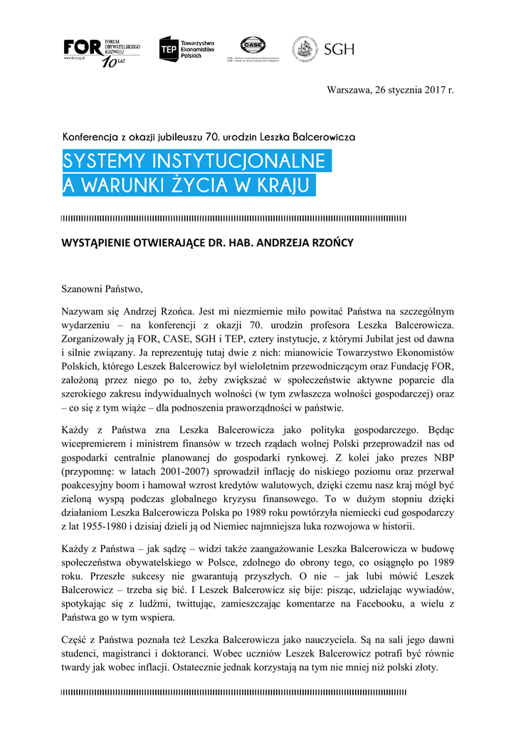 Warszawa, 26 stycznia 2017 r. WYSTĄPIENIE OTWIERAJĄCE DR. HAB. ANDRZEJA RZOŃCY Szanowni Państwo, Nazywam się Andrzej Rzońca. Jest mi niezmiernie miło powitać Państwa na szczególnym wydarzeniu – na konferencji z okazji 70. urodzin profesora Leszka Balcerowicza. Zorganizowały ją FOR, CASE, SGH i TEP, cztery instytucje, z którymi Jubilat jest od dawna i silnie związany. Ja reprezentuję tutaj dwie z nich: mianowicie Towarzystwo Ekonomistów Polskich, którego Leszek Balcerowicz był wieloletnim przewodniczącym oraz Fundację FOR, założoną przez niego po to, żeby zwiększać w społeczeństwie aktywne poparcie dla szerokiego zakresu indywidualnych wolności (w tym zwłaszcza wolności gospodarczej) oraz – co się z tym wiąże – dla podnoszenia praworządności w państwie. Każdy z Państwa zna Leszka Balcerowicza jako polityka gospodarczego. Będąc wicepremierem i ministrem finansów w trzech rządach wolnej Polski przeprowadził nas od gospodarki centralnie planowanej do gospodarki rynkowej. Z kolei jako prezes NBP (przypomnę: w latach 2001-2007) sprowadził inflację do niskiego poziomu oraz przerwał poakcesyjny boom i hamował wzrost kredytów walutowych, dzięki czemu nasz kraj mógł być zieloną wyspą podczas globalnego kryzysu finansowego. To w dużym stopniu dzięki działaniom Leszka Balcerowicza Polska po 1989 roku powtórzyła niemiecki cud gospodarczy z lat 1955-1980 i dzisiaj dzieli ją od Niemiec najmniejsza luka rozwojowa w historii. Każdy z Państwa – jak sądzę – widzi także zaangażowanie Leszka Balcerowicza w budowę społeczeństwa obywatelskiego w Polsce, zdolnego do obrony tego, co osiągnęło po 1989 roku. Przeszłe sukcesy nie gwarantują przyszłych. O nie – jak lubi mówić Leszek Balcerowicz – trzeba się bić. I Leszek Balcerowicz się bije: pisząc, udzielając wywiadów, spotykając się z ludźmi, twittując, zamieszczając komentarze na Facebooku, a wielu z Państwa go w tym wspiera. Część z Państwa poznała też Leszka Balcerowicza jako nauczyciela. Są na sali jego dawni studenci, magistranci i doktoranci. Wobec uczniów Leszek Balcerowicz potrafi być równie twardy jak wobec inflacji. Ostatecznie jednak korzystają na tym nie mniej niż polski złoty. Ale Leszek Balcerowicz wniósł też swój ważny wkład do ekonomii. Jego roli jako naukowca – mniej znanej – jest poświęcona dzisiejsza konferencja. Jej kształt odzwierciedla jego zainteresowania badawcze. Centralną pozycję ma w nich wzrost gospodarczy, od którego zależą warunki życia ludzi. Wzrost decyduje nie tylko o poprawie sytuacji materialnej społeczeństwa jako całości, ale i o społecznej mobilności, bo jego podstawowym mechanizmem jest kreatywna destrukcja. Jeżeli nie ma wzrostu lub jest on słaby, to stale ci sami ludzie są biedni i wciąż ci sami - bogaci. Jeśli zaś biedni nie widzą perspektyw na wyrwanie się z biedy, to tworzy się klimat sprzyjający populistom: albo skrajnej lewicy, która jako wroga wskazuje bogatych (i to widzimy na południu Europy), albo skrajnej prawicy, która za wszystko wini obcych (i z tym mamy do czynienia na Północy). Oczywiście możliwe są też szczególne przypadki populistów, którzy chcą, żeby ludzie nienawidzili i bogatych, i obcych. Można powiedzieć, że w takich krajach wzrost jest bardziej potrzebny niż gdzie indziej. Analizując wzrost, Leszek Balcerowicz – inaczej niż większość ekonomistów zajmujących się tym zagadnieniem – nie zatrzymuje się na jego płytkich źródłach: inwestycjach, zmianach zatrudnienia i innowacjach, ale idzie dalej i bada to, od czego owe źródła zależą. Koncentruje się na instytucjach. Zwraca przy tym uwagę – znowu wbrew temu, co zwykło się przyjmować w ekonomii – że gospodarka po załamaniach bardzo rzadko doświadcza przejściowo przyspieszonego wzrostu, który pozwoliłby jej nadrobić straty wywołane załamaniem. Leszek Balcerowicz wprowadził ważny podział instytucji na napędzające i stabilizujące. Temu, jak oddziałują one na wzrost, jest poświęcony pierwszy panel konferencji. Analizowanie instytucji ma siłą rzeczy interdyscyplinarny charakter i takie są badania prowadzone przez Leszka Balcerowicza. Ich istotnym przedmiotem jest prawo, które nadaje kształt formalnym instytucjom, a samo zależy od nieformalnych instytucji. Leszka Balcerowicza zajmuje w szczególności kwestia poziomu rządów prawa i ochrony wolności w gospodarce. Ich wpływ na warunki życia ludzi – także niematerialne – będzie dyskutowany podczas drugiego panelu. Instytucje – ani te złe, ani te dobre – nie są dane raz na zawsze. Da się je zmieniać. Polska była dotychczas przykładem wyjątkowo dobrej transformacji instytucji. Ale możliwe są – co od lat podkreśla Leszek Balcerowicz i czego dzisiaj sami doświadczamy – także złe transformacje. Choć są one bardzo liczne, nie poświęca się im wystarczająco dużo miejsca w ekonomii. Dobre i złe transformacje będą przedmiotem dyskusji podczas trzeciego panelu. W czwartym panelu uczniowie Leszka Balcerowicza spróbują powiązać jego rolę jako naukowca z jego pozostałymi rolami. Zanim przekażę głos panu prof. Markowi Rockiemu, rektorowi Szkoły Głównej Handlowej, współorganizującej dzisiejszą konferencję, chcę podkreślić, że nie byłoby jej bez wsparcia sponsorów – zarówno firm, jak i osób prywatnych. Każdemu, komu zawdzięczamy to, że możemy dzisiaj w taki sposób świętować jubileusz Leszka Balcerowicza, składam podziękowania. Bardzo Państwu dziękuję.