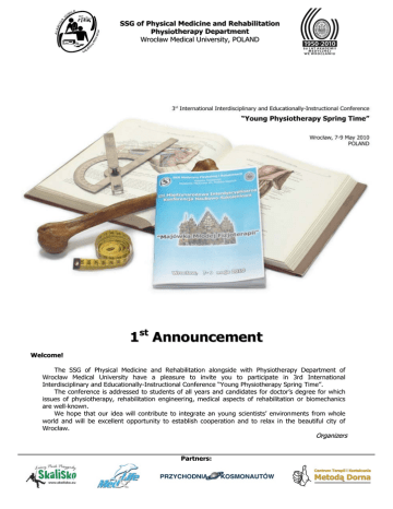 SSG of Physical Medicine and Rehabilitation Physiotherapy Department Wrocław Medical University, POLAND 1st Announcement Welcome! The SSG of Physical Medicine and Rehabilitation alongside with Physiotherapy Department of Wrocław Medical University have a pleasure to invite you to participate in 3rd International Interdisciplinary and Educationally-Instructional Conference “Young Physiotherapy Spring Time”. The conference is addressed to students of all years and candidates for doctor’s degree for which issues of physiotherapy, rehabilitation engineering, medical aspects of rehabilitation or biomechanics are well-known. We hope that our idea will contribute to integrate an young scientists’ environments from whole world and will be excellent opportunity to establish cooperation and to relax in the beautiful city of Wrocław. Organizers Partners: 3rd International Interdisciplinary and Educationally-Instructional Conference “Young Physiotherapy Spring Time” 7-9 May 2010, Wrocław, Poland Conference themes 1. "Sanus Per Aquam", czyli fizjoterapia nie tylko kliniczna. 2. Physiotherapy of growing age. 3. Special methods of physiotherapy. 4. Possibilities of physiotherapy in pain relief. 5. Biomechanics and rehabilitation engineering. 6. Contemporary balneotherapy and climatotherapy. 7. Problems of rehabilitation in cardiovascular and respiratory diseases. 8. Advances in modern physiotherapy. 9. Neurological physiotherapy - challenges and current needs. 10. Physiotherapy as a component of comprehensive rehabilitation treatment. 11. Possibilities of use of the physiotherapy in implant treatment of locomotor system. 12. "Sanus Per Aquam" - that is not only clinical physiotherapy. 13. Palliative rehabilitation 14. Varia. Scientific committee Chairman: prof. dr hab. Andrzej Pozowski prof. dr hab. Tadeusz Bober prof. dr hab. Ewa Demczuk-Włodarczyk prof. dr hab. Zbigniew Jethon prof. dr hab. Andrzej Kierzek prof. dr hab. Ludwika Sadowska prof. dr hab. Aleksander Sieroń prof. dr hab. Tadeusz Skolimowski prof. dr hab. Andrzej Steciwko dr hab. Alicja Rutkowska-Kucharska, prof. nadzw. dr hab. Jan Szczegielniak, prof. nadzw. dr n. med. Andrzej Bugajski dr Andrzej Czamara dr n. med. Żanna Fiodorenko-Dumas dr n. med. Jadwiga Kuciel-Lewandowska dr n. med. Małgorzata Paprocka-Borowicz mgr Krzysztof Aleksandrowicz mgr Irena Baściuk mgr Bożena Bogut mgr Roman Heider mgr Wojciech Laber Important dates Honorary patronage Rector of Wrocław Medical University prof. dr hab. Ryszard Andrzejak Dean of Health Science Faculty of Wrocław Medical University dr hab. Bernard Panaszek, prof. nadzw. Polish Association of Balneology and Physical Medicine Lower Silesian Division Chairman: dr n. med. Jadwiga Kuciel-Lewandowska Lower Silesian Medical Chamber Chairman: dr n. med. Igor Chęciński Organizing committee Chairman: Sławomir Jarząb Krzysztof Aleksandrowicz Karolina Ciurlik Maciej Dutka Michał Guła Michał Kaczyński Paulina Kołodziejczyk Marcin Kosowski Wiktor Kraczko Weronika Kusibab Wojciech Tomasz Laber Małgorzata Paprocka-Borowicz 5.04.2010 – deadline for sending abstracts and application for active participation 15.04.2010 – deadline for making payments and sending application for passive participation 9.05.2010 – deadline for sending the complete paper for the monograph 7-9.05.2010 – fixed date of Conference 3rd International Interdisciplinary and Educationally-Instructional Conference “Young Physiotherapy Spring Time” 7-9 May 2010, Wrocław, Poland Conference materials In case of active participation an abstract has to be send at the mailing address as an electronic bilingual document (97-2003 MsWord file with the extension *.doc, maximum 200 words for native and 200 words for English version, Times New Roman font, size 12pt) until 5 April 2010. The first author of a paper should be a student, candidate for doctor’s degree or a student that will graduate in 2010. Research, case reports and review articles will be accepted. It is necessary to give: title of article, names and surnames of authors, max 3 key words and phone, e-mail address of an author that is responsible for correspondence. Submitted abstracts after positive evaluation of Scientific Committee will be printed in the conference materials. Best papers will take part in competition in which attractive prizes awaits for the winners. Conference Fee The paymant includes participation in sessions, conference materials, certificate of participation and “coffe breaks”. Appropriate amount should be paid till 15 April 2010. active participation – PLN 90 passive participation – PLN 70 accompanying person – PLN 20* banquet – PLN 60 (only for conference participants, number of seats is limited) * The paymant includes participation in sessions and “coffee breaks”. Accompanying person will not recive conference materials and certificate of participation. Students from I, II and III study degree of Wroclaw Medical University are exempt from the fee. (The condition to be exempted from the fee is to provide the completed registration form until 15 April 2010 at the address of the Organizing Committee.) Please pay all charges to this account: Akademia Medyczna im. Piastów Śląskich ul. Pasteura 1, 50-367 Wrocław, POLAND Kredyt Bank S.A. IV O/Wrocław 35 1500 1793 1217 9000 9997 0000 with title: "Fizjoterapia, name and surname of participant" !!! While making payments please indicate the name and the surname of participant and note “Fizjoterapia”. Contact SKN Medycyny Fizykalnej i Rehabilitacji Katedra Fizjoterapii Akademia Medyczna im. Piastów Śląskich ul. Grunwaldzka 2 50-355 Wrocław, Poland phone: +48 (071) 784-01-86 fax.: +48 (071) 784-01-82 e-mail: [email protected] All information can be found at: www.majowka.am.wroc.pl Registration Form 3rd International Interdisciplinary and Educationally-Instructional Conference “Young Physiotherapy Spring Time” 7-9 May 2010, Wrocław, Poland Name and sur