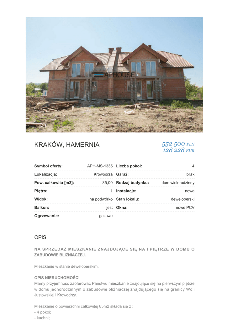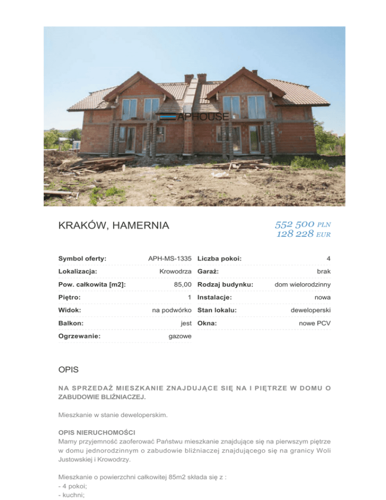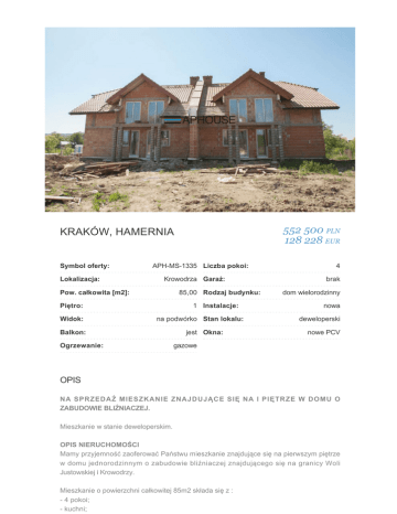 552 500 PLN 128 228 EUR KRAKÓW, HAMERNIA Symbol oferty: Lokalizacja: APH-MS-1335 Liczba pokoi: Krowodrza Garaż: Pow. całkowita [m2]: 85,00 Rodzaj budynku: Piętro: Widok: 1 Instalacje: na podwórko Stan lokalu: Balkon: Ogrzewanie: jest Okna: 4 brak dom wielorodzinny nowa deweloperski nowe PCV gazowe OPIS NA SPRZEDAŻ MIESZKANIE ZNAJDUJĄCE SIĘ NA I PIĘTRZE W DOMU O ZABUDOWIE BLIŹNIACZEJ. Mieszkanie w stanie deweloperskim. OPIS NIERUCHOMOŚCI Mamy przyjemność zaoferować Państwu mieszkanie znajdujące się na pierwszym piętrze w domu jednorodzinnym o zabudowie bliźniaczej znajdującego się na granicy Woli Justowskiej i Krowodrzy. Mieszkanie o powierzchni całkowitej 85m2 składa się z : - 4 pokoi; - kuchni; - łazienki; - przedpokoju; Ogrzewanie gazowe - dwufunkcyjny piec gazowy. OPIS NIERUCHOMOŚCI Domy wykończone w wysokim standardzie, ocieplone. Na zewnątrz miejsce parkingowe przynależne do mieszkania. Inwestycja ogrodzona. Inwestycja ukończona - IV kwartał 2015 roku. LOKALIZACJA Dobra lokalizacja. W pobliżu dużo terenów zielonych, cisza i spokój. Lokalizacja zapewnia atmosferę podmiejską, a jednocześnie dobre połączenie komunikacyjne z innymi dzielnicami Krakowa. CENA 6500zł/ m2 Zapraszamy do oglądania KONTAKT Jolanta Piątek +48 668 463 579 [email protected]