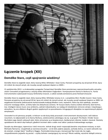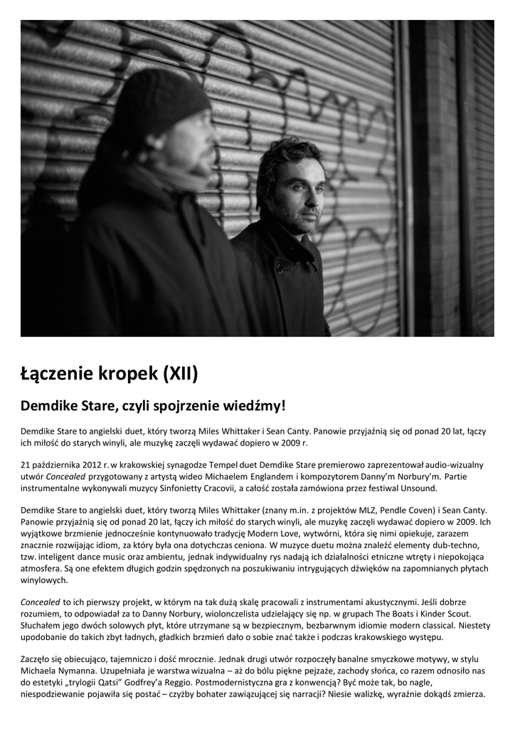Łączenie kropek (XII) Demdike Stare, czyli spojrzenie wiedźmy! Demdike Stare to angielski duet, który tworzą Miles Whittaker i Sean Canty. Panowie przyjaźnią się od ponad 20 lat, łączy ich miłość do starych winyli, ale muzykę zaczęli wydawać dopiero w 2009 r. 21 października 2012 r. w krakowskiej synagodze Tempel duet Demdike Stare premierowo zaprezentował audio-wizualny utwór Concealed przygotowany z artystą wideo Michaelem Englandem i kompozytorem Danny’m Norbury’m. Partie instrumentalne wykonywali muzycy Sinfonietty Cracovii, a całość została zamówiona przez festiwal Unsound. Demdike Stare to angielski duet, który tworzą Miles Whittaker (znany m.in. z projektów MLZ, Pendle Coven) i Sean Canty. Panowie przyjaźnią się od ponad 20 lat, łączy ich miłość do starych winyli, ale muzykę zaczęli wydawać dopiero w 2009. Ich wyjątkowe brzmienie jednocześnie kontynuowało tradycję Modern Love, wytwórni, która się nimi opiekuje, zarazem znacznie rozwijając idiom, za który była ona dotychczas ceniona. W muzyce duetu można znaleźć elementy dub-techno, tzw. inteligent dance music oraz ambientu, jednak indywidualny rys nadają ich działalności etniczne wtręty i niepokojąca atmosfera. Są one efektem długich godzin spędzonych na poszukiwaniu intrygujących dźwięków na zapomnianych płytach winylowych. Concealed to ich pierwszy projekt, w którym na tak dużą skalę pracowali z instrumentami akustycznymi. Jeśli dobrze rozumiem, to odpowiadał za to Danny Norbury, wiolonczelista udzielający się np. w grupach The Boats i Kinder Scout. Słuchałem jego dwóch solowych płyt, które utrzymane są w bezpiecznym, bezbarwnym idiomie modern classical. Niestety upodobanie do takich zbyt ładnych, gładkich brzmień dało o sobie znać także i podczas krakowskiego występu. Zaczęło się obiecująco, tajemniczo i dość mrocznie. Jednak drugi utwór rozpoczęły banalne smyczkowe motywy, w stylu Michaela Nymanna. Uzupełniała je warstwa wizualna – aż do bólu piękne pejzaże, zachody słońca, co razem odnosiło nas do estetyki „trylogii Qatsi” Godfrey’a Reggio. Postmodernistyczna gra z konwencją? Być może tak, bo nagle, niespodziewanie pojawiła się postać – czyżby bohater zawiązującej się narracji? Niesie walizkę, wyraźnie dokądś zmierza. Trudno mówić o fabule, ale spotyka się z kimś, wymienia gesty, przystępuje do gry, która może mieć też drugie dno (i znaczenie) poza tym, które dostrzegamy na ekranie. Kojarzyło się to trochę z niektórymi filmami Jacquesa Rivette’a albo wczesnymi dokonaniami Davida Cronenberga. Warto dodać, że sekwencja otwierająca mogła być odczytana jako nawiązanie do czołówek Bondów, więc może jest to jakiś trop. Moje zaciekawienie nie zostało zaspokojone, gdyż kolejnej kompozycji towarzyszyły zupełnie inne obrazy. Zamykający program utwór miał wizualizacje łączące dwa wykorzystane wcześniej motywy, dlatego zastanawiam się, na ile ten eklektyzm i zróżnicowanie były zaplanowane, a na ile były wynikiem np. braku czasu czy pomysłu na całość. Co do muzyki, to raczej dodatek instrumentów nie wyszedł jej na dobre. Najlepszym dowodem kompozycja znana wcześniej z płyty Demdike Stare, która podczas występu została doprawiona smyczkami Sinfonietty, co było niepotrzebnym postawieniem kropki nad i, dookreśleniem, bez którego ta muzyka o wiele mocniej oddziaływała. Generalnie partie instrumentalne wydawały mi się czymś w rodzaju klatki, która miała za zadanie okiełznać tę muzykę, opakować w przyjaźniejszy dla słuchacza sposób. Ciekawe, czy Canty i Whittaker będą kontynuowali współpracę z instrumentalistami, ostatnio tworzony materiał, jaki grali w Boiler Room pokazuje, że interesują ich też bardziej klubowo rytmiczne rejony i pomysłów w tej materii też im nie brakuje. Piotr Tkacz