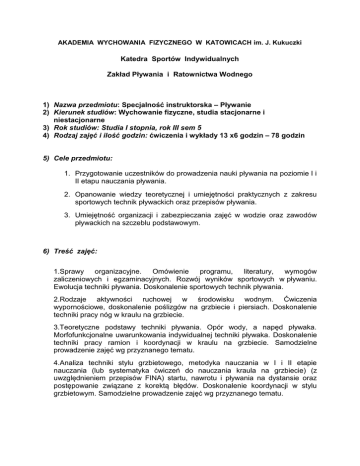AKADEMIA WYCHOWANIA FIZYCZNEGO W KATOWICACH im. J. Kukuczki Katedra Sportów Indywidualnych Zakład Pływania i Ratownictwa Wodnego 1) Nazwa przedmiotu: Specjalność instruktorska – Pływanie 2) Kierunek studiów: Wychowanie fizyczne, studia stacjonarne i niestacjonarne 3) Rok studiów: Studia I stopnia, rok III sem 5 4) Rodzaj zajęć i ilość godzin: ćwiczenia i wykłady 13 x6 godzin – 78 godzin 5) Cele przedmiotu: 1. Przygotowanie uczestników do prowadzenia nauki pływania na poziomie I i II etapu nauczania pływania. 2. Opanowanie wiedzy teoretycznej i umiejętności praktycznych z zakresu sportowych technik pływackich oraz przepisów pływania. 3. Umiejętność organizacji i zabezpieczania zajęć w wodzie oraz zawodów pływackich na szczeblu podstawowym. 6) Treść zajęć: 1.Sprawy organizacyjne. Omówienie programu, literatury, wymogów zaliczeniowych i egzaminacyjnych. Rozwój wyników sportowych w pływaniu. Ewolucja techniki pływania. Doskonalenie sportowych technik pływania. 2.Rodzaje aktywności ruchowej w środowisku wodnym. Ćwiczenia wypornościowe, doskonalenie poślizgów na grzbiecie i piersiach. Doskonalenie techniki pracy nóg w kraulu na grzbiecie. 3.Teoretyczne podstawy techniki pływania. Opór wody, a napęd pływaka. Morfofunkcjonalne uwarunkowania indywidualnej techniki pływaka. Doskonalenie techniki pracy ramion i koordynacji w kraulu na grzbiecie. Samodzielne prowadzenie zajęć wg przyznanego tematu. 4.Analiza techniki stylu grzbietowego, metodyka nauczania w I i II etapie nauczania (lub systematyka ćwiczeń do nauczania kraula na grzbiecie) (z uwzględnieniem przepisów FINA) startu, nawrotu i pływania na dystansie oraz postępowanie związane z korektą błędów. Doskonalenie koordynacji w stylu grzbietowym. Samodzielne prowadzenie zajęć wg przyznanego tematu. 5.Analiza techniki stylu dowolnego, metodyka nauczania w I i II etapie nauczania (lub systematyka ćwiczeń do nauczania kraula na piersiach) (z uwzględnieniem przepisów FINA) startu, nawrotu i pływania na dystansie oraz postępowanie związane z korektą błędów. Doskonalenie techniki elementów kraula na piersiach. Samodzielne prowadzenie zajęć wg przyznanego tematu. 6.Analiza techniki stylu klasycznego, metodyka nauczania w II etapie nauczania (lub systematyka ćwiczeń do nauczania stylu klasycznego) (z uwzględnieniem przepisów FINA) startu, nawrotu i pływania na dystansie oraz postępowanie związane z korektą błędów. Doskonalenie techniki elementów żabki na piersiach. Samodzielne prowadzenie zajęć wg przyznanego tematu. 7.Analiza techniki stylu motylkowego, metodyka nauczania w II etapie nauczania (lub systematyka ćwiczeń do nauczania stylu motylkowego ) (z uwzględnieniem przepisów FINA) startu, nawrotu i pływania na dystansie oraz postępowanie związane z korektą błędów. Doskonalenie elementów techniki delfina. Samodzielne prowadzenie zajęć wg przyznanego tematu. 8.Analiza techniki stylu zmiennego, nauczanie i doskonalenie nawrotów w stylu zmiennym, doskonalenie skoku startowego, przepisy w stylu zmiennym oraz postępowanie związane z korektą błędów. Ćwiczenia metodyczne do nauczania sportowych technik. Samodzielne prowadzenie zajęć wg przyznanego tematu. 9.Ćwiczenia metodyczne do nauczania sportowych technik. Doskonalenie nawrotów koziołkowych w kraulu na grzbiecie i na piersiach. Samodzielne prowadzenie zajęć wg przyznanego tematu. 10.Przepisy pływania sportowego i ich interpretacja. Doskonalenie nawrotów w stylu zmiennym. Samodzielne prowadzenie zajęć wg przyznanego tematu. 11.Przepisy pływania sportowego i ich interpretacja. Doskonalenie nawrotów w stylu zmiennym. Samodzielne prowadzenie zajęć wg przyznanego tematu. 12.Sprawdzian praktycznego. teoretyczny. Indywidualne przygotowanie do zaliczenia 13.Zaliczenie semestru. Sprawdzian praktyczny. 7) Warunki zaliczenia:      Aktywny udział w zajęciach Sprawdzian teoretyczny obejmujący zagadnienia związane ze znajomością sportowej techniki pływania oraz przepisów pływania Przygotowanie pracy pisemnej – systematyka ćwiczeń. Zaliczenie sprawdzianu praktycznego na dystansie 100 m. st. zmiennym (ocena techniki pływania, skoku startowego i nawrotów oraz uzyskanie minimum czasowego). Uczestniczenie w organizacji zawodów sportowych (1 w semestrze) Normy wynikowe Ocena 5,0 4,4 4,0 3,5 3,0 100 m stylem zmiennym Kobiety Mężczyźni 1:20,0 1:15,0 1:30,0 1:25,0 1:40,0 1:35,0 1:50,0 1:45,0 2:00,0 1:55,0 8) Piśmiennictwo: Literatura podstawowa: 1. Bartkowiak E. 2008. Sportowa technika pływania, Warszawa. 2. Dybińska E. 2009. Uczenie się i nauczanie pływania. AWF, Kraków. 3. Karpiński R. 2011. Pływanie. Podstawy techniki. Nauczanie. Katowice. 4. Karpiński R. 2008. Pływanie. Sport. Zdrowie. Rekreacja. AWF Katowice. 5. Ostrowski A. 2003. Zabawy i rekreacja w wodzie. WSiP Warszawa. 6. Przepisy Pływania. 2013 - 2017. PZP, Warszawa. www.polswim.pl 7. Rakowski M. 2010. Nowoczesny trening pływacki. Londyn 8. Stachura A., Płatek Ł. 2012. Pływanie w szkole podstawowej. AWF Katowice. Literatura dodatkowa: 1. Czabański B.,Fiłon M.,Zatoń K. 2003. Elementy teorii pływania. Wrocław. 2. Matynia J., Rostkowska E.1986. Zabawy i gry ruchowe w nauczaniu pływania. AWF Poznań. 3. Waade B.(red.). 2005. Pływanie sportowe i ratunkowe. Teoria i metodyka. AWFiS, GdańskW. Autor opracowania : dr Łucja Płatek