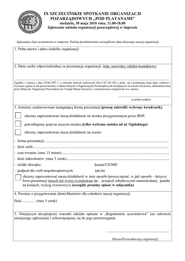 IX SZCZECIŃSKIE SPOTKANIE ORGANIZACJI POZARZĄDOWYCH „POD PLATANAMI” niedziela, 30 maja 2010 roku, 11.00-18.00 Zgłoszenie udziału organizacji pozarządowej w imprezie XI Zgłaszamy chęć uczestnictwa w imprezie. Poniżej przedstawiamy szczegółowe dane dotyczące naszej organizacji. 1. Pełna nazwa i adres siedziby organizacji: 2. Dane osoby odpowiedzialnej za prezentację organizacji: imię, nazwisko, telefon kontaktowy: ....................................................................................................................................................................... Zgodnie z ustawą z dnia 29.08.1997 r. o ochronie danych osobowych (Dz.U.02.101.926 z późn. zm.) przekazuję moje dane osobowe i wyrażam zgodę na ich przetwarzanie w Bazie Danych o Organizacjach Pozarządowych działających na terenie Szczecina, administrowanej przez Biuro ds. Organizacji Pozarządowych Urzędu Miasta Szczecin, z zastrzeżeniem uregulowań ww. ustawy. ............................................................ (czytelny podpis) 3. Jesteśmy zainteresowani następującą formą prezentacji (proszę zakreślić wybrany kwadracik): chcemy zaprezentować naszą działalność na stoisku przygotowanym przez BOP, potrzebujemy prąd na naszym stoisku (tylko wybrane stoiska od ul. Ogińskiego) chcemy zaprezentować naszą działalność na scenie: - forma prezentacji:..................................................................................................................................... - ilość osób:................................................................................................................................................. - czas trwania: (max 15 minut):................................................................................................................... - ilość mikrofonów: (max 5 sztuk):.............................................................................................................. - źródło dźwięku: kaseta/CD/MD - podjazd dla osób niepełnosprawnych: tak/nie chcemy zaprezentować naszą działalność w inny sposób (proszę opisać, w jaki sposób – dotyczy form prezentacji innych niż wyżej wymienione np.: przejazd zabytkowymi samochodami, parada na koniach, wyścig rowerowy) ( szczegóły prosimy opisać w załączniku) 4. Prosimy o przygotowanie identyfikatorów dla członków naszej organizacji: Ilość............... (max 5 sztuk) 5. Niniejszym akceptujemy warunki udziału opisane w „Regulaminie uczestnictwa” (na odwrocie niniejszego zgłoszenia) i zobowiązujemy się do jego przestrzegania. ..................................................................... (Prezes/Przewodniczący organizacji)