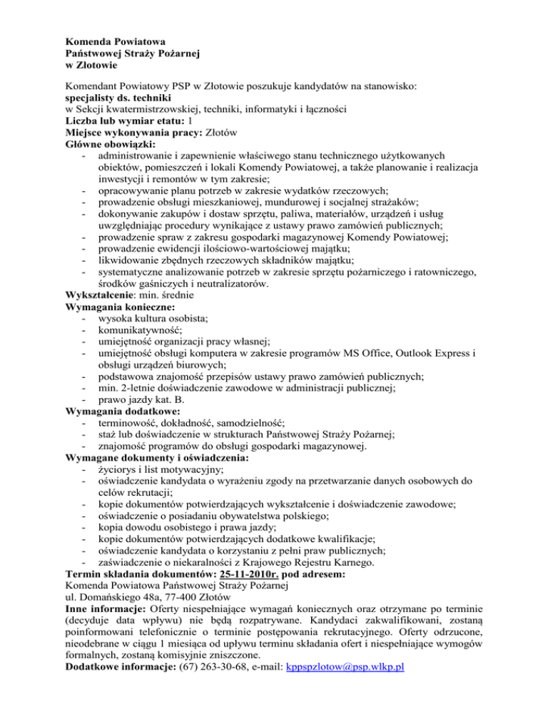 Komenda Powiatowa Państwowej Straży Pożarnej w Złotowie Komendant Powiatowy PSP w Złotowie poszukuje kandydatów na stanowisko: specjalisty ds. techniki w Sekcji kwatermistrzowskiej, techniki, informatyki i łączności Liczba lub wymiar etatu: 1 Miejsce wykonywania pracy: Złotów Główne obowiązki: - administrowanie i zapewnienie właściwego stanu technicznego użytkowanych obiektów, pomieszczeń i lokali Komendy Powiatowej, a także planowanie i realizacja inwestycji i remontów w tym zakresie; - opracowywanie planu potrzeb w zakresie wydatków rzeczowych; - prowadzenie obsługi mieszkaniowej, mundurowej i socjalnej strażaków; - dokonywanie zakupów i dostaw sprzętu, paliwa, materiałów, urządzeń i usług uwzględniając procedury wynikające z ustawy prawo zamówień publicznych; - prowadzenie spraw z zakresu gospodarki magazynowej Komendy Powiatowej; - prowadzenie ewidencji ilościowo-wartościowej majątku; - likwidowanie zbędnych rzeczowych składników majątku; - systematyczne analizowanie potrzeb w zakresie sprzętu pożarniczego i ratowniczego, środków gaśniczych i neutralizatorów. Wykształcenie: min. średnie Wymagania konieczne: - wysoka kultura osobista; - komunikatywność; - umiejętność organizacji pracy własnej; - umiejętność obsługi komputera w zakresie programów MS Office, Outlook Express i obsługi urządzeń biurowych; - podstawowa znajomość przepisów ustawy prawo zamówień publicznych; - min. 2-letnie doświadczenie zawodowe w administracji publicznej; - prawo jazdy kat. B. Wymagania dodatkowe: - terminowość, dokładność, samodzielność; - staż lub doświadczenie w strukturach Państwowej Straży Pożarnej; - znajomość programów do obsługi gospodarki magazynowej. Wymagane dokumenty i oświadczenia: - życiorys i list motywacyjny; - oświadczenie kandydata o wyrażeniu zgody na przetwarzanie danych osobowych do celów rekrutacji; - kopie dokumentów potwierdzających wykształcenie i doświadczenie zawodowe; - oświadczenie o posiadaniu obywatelstwa polskiego; - kopia dowodu osobistego i prawa jazdy; - kopie dokumentów potwierdzających dodatkowe kwalifikacje; - oświadczenie kandydata o korzystaniu z pełni praw publicznych; - zaświadczenie o niekaralności z Krajowego Rejestru Karnego. Termin składania dokumentów: 25-11-2010r. pod adresem: Komenda Powiatowa Państwowej Straży Pożarnej ul. Domańskiego 48a, 77-400 Złotów Inne informacje: Oferty niespełniające wymagań koniecznych oraz otrzymane po terminie (decyduje data wpływu) nie będą rozpatrywane. Kandydaci zakwalifikowani, zostaną poinformowani telefonicznie o terminie postępowania rekrutacyjnego. Oferty odrzucone, nieodebrane w ciągu 1 miesiąca od upływu terminu składania ofert i niespełniające wymogów formalnych, zostaną komisyjnie zniszczone. Dodatkowe informacje: (67) 263-30-68, e-mail: [email protected]