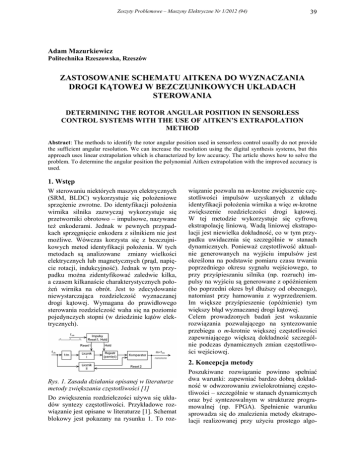 Zeszyty Problemowe – Maszyny Elektryczne Nr 1/2012 (94) 39 Adam Mazurkiewicz Politechnika Rzeszowska, Rzeszów ZASTOSOWANIE SCHEMATU AITKENA DO WYZNACZANIA DROGI KĄTOWEJ W BEZCZUJNIKOWYCH UKŁADACH STEROWANIA DETERMINING THE ROTOR ANGULAR POSITION IN SENSORLESS CONTROL SYSTEMS WITH THE USE OF AITKEN’S EXTRAPOLATION METHOD Abstract: The methods to identify the rotor angular position used in sensorless control usually do not provide the sufficient angular resolution. We can increase the resolution using the digital synthesis systems, but this approach uses linear extrapolation which is characterized by low accuracy. The article shows how to solve the problem. To determine the angular position the polynomial Aitken extrapolation with the improved accuracy is used. 1. Wstęp W sterowaniu niektórych maszyn elektrycznych (SRM, BLDC) wykorzystuje się połoŜeniowe sprzęŜenie zwrotne. Do identyfikacji połoŜenia wirnika silnika zazwyczaj wykorzystuje się przetworniki obrotowo – impulsowe, nazywane teŜ enkoderami. Jednak w pewnych przypadkach sprzęgnięcie enkodera z silnikiem nie jest moŜliwe. Wówczas korzysta się z bezczujnikowych metod identyfikacji połoŜenia. W tych metodach są analizowane zmiany wielkości elektrycznych lub magnetycznych (prąd, napięcie rotacji, indukcyjność). Jednak w tym przypadku moŜna zidentyfikować zaledwie kilka, a czasem kilkanaście charakterystycznych połoŜeń wirnika na obrót. Jest to zdecydowanie niewystarczająca rozdzielczość wyznaczanej drogi kątowej. Wymagana do prawidłowego sterowania rozdzielczość waha się na poziomie pojedynczych stopni (w dziedzinie kątów elektrycznych). wiązanie pozwala na m-krotne zwiększenie częstotliwości impulsów uzyskanych z układu identyfikacji połoŜenia wirnika a więc m-krotne zwiększenie rozdzielczości drogi kątowej. W tej metodzie wykorzystuje się cyfrową ekstrapolację liniową. Wadą liniowej ekstrapolacji jest niewielka dokładność, co w tym przypadku uwidacznia się szczególnie w stanach dynamicznych. PoniewaŜ częstotliwość aktualnie generowanych na wyjściu impulsów jest określona na podstawie pomiaru czasu trwania poprzedniego okresu sygnału wejściowego, to przy przyśpieszaniu silnika (np. rozruch) impulsy na wyjściu są generowane z opóźnieniem (bo poprzedni okres był dłuŜszy od obecnego), natomiast przy hamowaniu z wyprzedzeniem. Im większe przyśpieszenie (opóźnienie) tym większy błąd wyznaczanej drogi kątowej. Celem prowadzonych badań jest wskazanie rozwiązania pozwalającego na syntezowanie przebiegu o m-krotnie większej częstotliwości zapewniającego większą dokładność szczególnie podczas dynamicznych zmian częstotliwości wejściowej. 2. Koncepcja metody Rys. 1. Zasada działania opisanej w literaturze metody zwiększania częstotliwości [1] Do zwiększenia rozdzielczości uŜywa się układów syntezy częstotliwości. Przykładowe rozwiązanie jest opisane w literaturze [1]. Schemat blokowy jest pokazany na rysunku 1. To roz- Poszukiwane rozwiązanie powinno spełniać dwa warunki: zapewniać bardzo dobrą dokładność w odwzorowaniu zwielokrotnianej częstotliwości – szczególnie w stanach dynamicznych oraz być syntezowalnym w strukturze programowalnej (np. FPGA). Spełnienie warunku sprowadza się do znalezienia metody ekstrapolacji realizowanej przy uŜyciu prostego algo- 40 Zeszyty Problemowe – Maszyny Elektryczne Nr 1/2012 (94) rytmu. Spośród znanych metod numerycznych wyróŜnia się tak zwany schemat Aitkena. Wprawdzie został stworzony do interpolacji, ale jest na tyle uniwersalny, Ŝe moŜe być równieŜ uŜywany do ekstrapolacji funkcji (w tym funkcji dyskretnych). Cechuje go tak zwana łatwość do automatyzacji, bo jego wykonanie sprowadza się do wielokrotnego powtórzenia prostych obliczeń, w których wykorzystuje się podstawowe działania matematyczne. Schemat blokowy proponowanego rozwiązania jest pokazany na rysunku 2. Przebieg generowany przez układ identyfikacji połoŜenia wirnika (nie uwzględniony na rysunku) o częstotliwości fwe słuŜy do wytworzenia dwóch impulsów: „Hold” i Reset 1”. Sygnał taktujący fclk jest dzielony m-krotnie i zliczany przez „Licznik I”. W chwili pojawienia się impulsu „Hold” zawartość licznika 1 jest kopiowana do rejestru 1. Jednocześnie poprzednia zawartość rejestru 1 jest kopiowana do rejestru 2 i tak dalej. W efekcie w rejestrach przechowywane są wartości licznika 1 (próbki) zliczone w poprzednich cyklach fwe. Im większa liczba rejestrów, tym większa dokładność przybliŜenia. Sygnał „Reset 1” kasuje „Licznik 1” i cykl zliczania się powtarza. Rys. 2. Schemat blokowy proponowanego rozwiązania zwielokrotniania częstotliwości Zawartość rejestrów jest wykorzystywana do wyznaczenia nowej wartości dla przyszłego okresu fwe przy uŜyciu schematu Aitkena. Metoda wykonywania obliczeń jest pokazana w tabeli 1. Tabela powstała przy załoŜeniu, Ŝe jest sześć rejestrów ponumerowanych od R1 do R6. W kolumnie pierwszej są wpisane numery kolejnych próbek (iteracji) według zasady: 1 – próbka najstarsza, 6 – próbka najmłodsza (aktualna). W drugiej kolumnie są wpisane wyniki odejmowania wartości z pierwszej kolumny i liczby 7, która jest numerem kolejnej próbki – dla niej będzie obliczane nowe przybliŜenie. W kolejnej kolumnie są umieszczone wartości z rejestrów R1 do R6. W dalszych kolumnach są umieszczane wyniki serii obliczeń realizowanych z uŜyciem powtarzającego się algorytmu. NiŜej są pokazane przykładowe obliczenia kilku wartości zamieszczonych w tabeli 1. A(2,4) = R6 ⋅ (− 5) − (− 6) ⋅ R5 2 −1 (1) gdzie: A(2,4) – wartość w drugim wierszu i czwartej kolumnie (Tab. 1), R5, R6 – wartości rejestrów w kolumnie f(xn), (-5), (-6) – liczby z drugiej kolumny xn-7, 2-1 – róŜnica liczb z dwóch, pierwszych wierszy, kolumny xn. R6 ⋅ (− 1) − (− 6) ⋅ R1 6 −1 (2) A