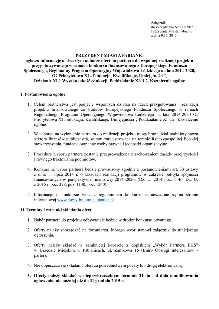 Załącznik do Zarządzenia Nr 371/2015P Prezydenta Miasta Pabianic z dnia 9.12. 2015 r. PREZYDENT MIASTA PABIANIC ogłasza informację o otwartym naborze ofert na partnera do wspólnej realizacji projektu przygotowywanego w ramach konkursu finansowanego z Europejskiego Funduszu Społecznego, Regionalny Program Operacyjny Województwa Łódzkiego na lata 2014-2020, Oś Priorytetowa XI „Edukacja, Kwalifikacje, Umiejętności”, Działanie XI.1 Wysoka jakość edukacji, Poddziałanie XI. 1.2 Kształcenie ogólne I. Postanowienia ogólne 1. Celem partnerstwa jest podjęcie wspólnych działań na rzecz przygotowania i realizacji projektu finansowanego ze środków Europejskiego Funduszu Społecznego w ramach Regionalnego Programu Operacyjnego Województwa Łódzkiego na lata 2014-2020 Oś Priorytetowa XI „Edukacja, Kwalifikacje, Umiejętności”, Poddziałanie XI 1.2 Kształcenie ogólne 2. W naborze na wyłonienie partnera do realizacji projektu mogą brać udział podmioty spoza sektora finansów publicznych, w tym zarejestrowane na terenie Rzeczypospolitej Polskiej stowarzyszenia, fundacje oraz inne osoby prawne i jednostki organizacyjne. 3. Procedura wyboru partnera zostanie przeprowadzona z zachowaniem zasady przejrzystości i równego traktowania podmiotów. 4. Konkurs na wybór partnera będzie prowadzony zgodnie z postanowieniami art. 33 ustawy z dnia 11 lipca 2014 r. o zasadach realizacji programów w zakresie polityki spójności finansowanych w perspektywie finansowej 2014–2020. (Dz. U. 2014 poz. 1146, Dz. U. z 2015 r. poz. 378, poz. 1130, poz. 1240). 5. Informacje o konkursie wraz z regulaminem konkursu zamieszczone są na stronie internetowej www.nowy-bip.um.pabianice.pl II. Terminy i warunki składania ofert 1. Nabór partnera do projektu odbywać się będzie w drodze konkursu otwartego. 2. Oferty należy sporządzać na formularzu, którego wzór stanowi załącznik do niniejszego ogłoszenia. 3. Oferty należy składać w zamkniętej kopercie z dopiskiem „Wybór Partnera EKS” w Urzędzie Miejskim w Pabianicach, ul. Zamkowa 16 (Biuro Obsługi Interesantów parter). 4. Nie dopuszcza się składania ofert za pośrednictwem poczty lub drogą elektroniczną. 5. Oferty należy składać w nieprzekraczalnym terminie 21 dni od dnia opublikowania ogłoszenia, nie później niż do 31 grudnia 2015 r. 6. Oferty złożone po terminie określonym w pkt. II ust. 5 nie będą rozpatrywane. 7. Do oferty należy dołączyć: 1) statut, w przypadku instytucji i/lub organizacji, działających na podstawie statutu; 2) aktualny wypis z Krajowego Rejestru Sądowego lub innego rejestru (ewidencji) 3) oświadczenie o nieposiadaniu zobowiązań publiczno – prawnych wobec budżetu państwa, jednostek samorządu terytorialnego oraz innych źródeł o charakterze publicznym. 8. Oferty złożone w sposób niekompletny ze względów formalnych w uzasadnionych przypadkach podlegać mogą uzupełnieniu przez potencjalnego partnera. 9. Zgłoszenia oraz wszystkie załączniki do zgłoszenia powinny być podpisane przez osobę upoważnioną do reprezentowania kandydata na partnera zgodnie z zapisem w dokumencie rejestrowym lub zgodnie z załączonym pełnomocnictwem. 10. Kopie dokumentów dołączone do oferty musza być opatrzone pieczęcią podmiotu, aktualną datą, własnoręcznym podpisem osoby/osób uprawnionej do reprezentowania podmiotu oraz poświadczone za zgodność z oryginałem. III. Zakres tematyczny partnerstwa: 1. Do zakresu działań partnera w projekcie będzie należało: 1) doradztwo i współpraca w przygotowaniu odpowiedniej diagnozy w zakresie zajęć opartych na metodzie eksperymentu w zakresie przedmiotów przyrodniczych i matematycznych; 2) przygotowanie i organizacja zajęć nastawionych na kształtowanie kompetencji kluczowych uczniów, rozbudzanie kreatywności i innowacyjności, opartych na metodzie eksperymentu w zakresie przedmiotów przyrodniczych i matematycznych; 3) przygotowanie i organizacja zajęć nastawionych na kształtowanie kompetencji kluczowych uczniów, rozbudzanie kreatywności i innowacyjności, z wykorzystaniem narzędzi TIK; 4) organizacja kółek zainteresowań, warsztatów, laboratoriów, nawiązywanie współpracy z otoczeniem zewnętrznym; 5) doskonalenie kompetencji zawodowych nauczycieli w zakresie stosowania nowych metod nauczania w kształtowaniu kompetencji kluczowych uczniów (w szczególności nauczania opartego na metodzie eksperymentu oraz wykorzystania narzędzi TIK w prowadzeniu zajęć), w tym przede wszystkim warsztaty i szkolenia doskonalące dla nauczycieli w ww. zakresie; 6) doradztwo w zakresie zakupu sprzętu i pomocy dydaktycznych niezbędnych do przeprowadzenia w projekcie ww. zajęć i szkoleń. IV. Kryteria oceny ofert i wyboru partnera: 1. Kryteria formalne: 1) złożenie zgłoszenia w terminie i miejscu wskazanym w ogłoszeniu. 2. 1) 2) 3) Kryteria merytoryczne: zgodność działania potencjalnego partnera z celami partnerstwa (1 pkt) oferowany wkład potencjalnego partnera w realizację celu partnerstwa (0-2 pkt) doświadczenie w realizacji projektów w partnerstwie z jednostką samorządu terytorialnego min. 4 projekty w latach 2007-2015 (4 pkt) 4) doświadczenie w realizacji projektów edukacyjnych w województwie łódzkim w latach 2007-2015 finansowanych z EFS jako beneficjent/partner środków UE - min. 2 projekty (2 pkt) 5) gotowość współpracy z beneficjentem w trakcie przygotowania projektu (wniosku o dofinansowanie) (0-2 pkt) 6) proponowany zakres merytorycznych zadań i działań partnera w projekcie oraz przewidywane rezultaty ich realizacji (0-6 pkt.) 7) doświadczenie we wdrażaniu/testowaniu innowacyjnych programów zajęć dla uczniów szkoły podstawowej i gimnazjum z nauk przyrodniczych i technologii informacyjnokomunikacyjnych (0-2 pkt.) 8) posiadany potencjał finansowy oraz kadrowo – organizacyjny niezbędny do realizacji projektu oraz propozycja wkładu Partnera w realizację projektu i utr