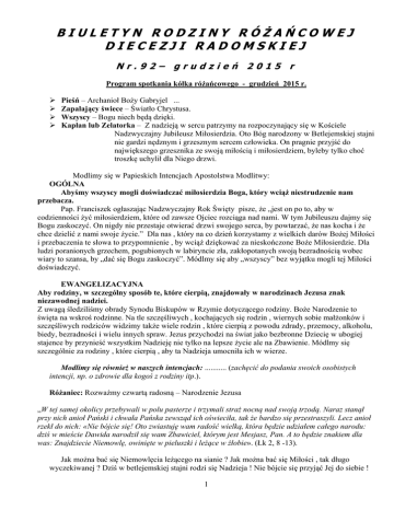 BIULETYN RODZINY RÓŻAŃCOWEJ DIECEZJI RADOMSKIEJ Nr.92– grudzień 2015 r Program spotkania kółka różańcowego - grudzień 2015 r. Pieśń – Archanioł Boży Gabryjel ... Zapalający świece – Światło Chrystusa. Wszyscy – Bogu niech będą dzięki. Kapłan lub Zelatorka – Z nadzieją w sercu patrzymy na rozpoczynający się w Kościele Nadzwyczajny Jubileusz Miłosierdzia. Oto Bóg narodzony w Betlejemskiej stajni nie gardzi nędznym i grzesznym sercem człowieka. On pragnie przyjść do największego grzesznika ze swoją miłością i miłosierdziem, byleby tylko choć troszkę uchylił dla Niego drzwi. Modlimy się w Papieskich Intencjach Apostolstwa Modlitwy: OGÓLNA Abyśmy wszyscy mogli doświadczać miłosierdzia Boga, który wciąż niestrudzenie nam przebacza. Pap. Franciszek ogłaszając Nadzwyczajny Rok Święty pisze, że „jest on po to, aby w codzienności żyć miłosierdziem, które od zawsze Ojciec rozciąga nad nami. W tym Jubileuszu dajmy się Bogu zaskoczyć. On nigdy nie przestaje otwierać drzwi swojego serca, by powtarzać, że nas kocha i że chce dzielić z nami swoje życie.” Dla nas , który na co dzień korzystamy z wielkich darów Bożej Miłości i przebaczenia te słowa to przypomnienie , by wciąż dziękować za nieskończone Boże Miłosierdzie. Dla ludzi poranionych grzechem, pogubionych w labiryncie zła, zakłopotanych swoją bezradnością wobec wiary to szansa, by „dać się Bogu zaskoczyć”. Módlmy się aby „wszyscy” bez wyjątku mogli tej Miłości doświadczyć. EWANGELIZACYJNA Aby rodziny, w szczególny sposób te, które cierpią, znajdowały w narodzinach Jezusa znak niezawodnej nadziei. Z uwagą śledziliśmy obrady Synodu Biskupów w Rzymie dotyczącego rodziny. Boże Narodzenie to święta na wskroś rodzinne. Na tle szczęśliwych , kochających się rodzin , wiernych sobie małżonków i szczęśliwych rodziców widzimy także wiele rodzin , które cierpią z powodu zdrady, przemocy, alkoholu, biedy, bezradności i wielu innych spraw. Jezus przychodzi na świat jako bezbronne Dziecię w ubogiej stajence by przynieść wszystkim Nadzieję nie tylko na lepsze życie ale na Zbawienie. Módlmy się szczególnie za rodziny , które cierpią , aby ta Nadzieja umocniła ich w wierze. Modlimy się również w naszych intencjach: ........... (zachęcić do podania swoich osobistych intencji, np. o zdrowie dla kogoś z rodziny itp.). Różaniec: Rozważmy czwartą radosną – Narodzenie Jezusa „W tej samej okolicy przebywali w polu pasterze i trzymali straż nocną nad swoją trzodą. Naraz stanął przy nich anioł Pański i chwała Pańska zewsząd ich oświeciła, tak że bardzo się przestraszyli. Lecz anioł rzekł do nich: «Nie bójcie się! Oto zwiastuję wam radość wielką, która będzie udziałem całego narodu: dziś w mieście Dawida narodził się wam Zbawiciel, którym jest Mesjasz, Pan. A to będzie znakiem dla was: Znajdziecie Niemowlę, owinięte w pieluszki i leżące w żłobie». (Łk 2, 8 -13). Jak można bać się Niemowlęcia leżącego na sianie ? Jak można bać się Miłości , tak długo wyczekiwanej ? Dziś w betlejemskiej stajni rodzi się Nadzieja ! Nie bójcie się przyjąć Jej do siebie ! 1 Ona wyciąga z rozpaczy i przygnębienia. Ona jest mocą do działania. Ona jest drogowskazem do celu jakim jest nasze Zbawienie. – Ojcze nasz, Zdrowaś Maryjo (10 razy), Chwała Ojcu, O mój Jezu… – Królowo Różańca Świętego, módl się za nami. – Za zmarłych członków kółka różańcowego……………….. (wymienić): Wieczny odpoczynek... Konferencja (prowadzi ją kapłan lub zelatorka ) Mt 14, 22-33 To nie był łatwy dzień dla Apostołów. Ludzi wokół Jezusa było tak dużo, że najchętniej wszystkich odesłaliby do domów, ale On cierpliwie uzdrawiał chorych i przede wszystkim dokonał cudownego rozmnożenia chleba. Pomimo zmęczenia uczniowie byli zadowoleni, ponieważ po raz kolejny doświadczyli mocy Bożej, byli już prawie przekonani, że Jezus jest obiecanym Mesjaszem. Wieczorem, kiedy odprawili tłumy, czekali na chwilę odpoczynku, Mistrz nakazał im odpłynąć na drugi brzeg. I wtedy się zaczęło… Pozornie łatwy odcinek jeziora, który pokonywali już wielokrotnie, stał się koszmarem. Silny wiatr wiał w przeciwnym kierunku. Zamiast płynąć naprzód, musieli walczyć, żeby łódź nie zatonęła. Po kilku godzinach zmagań z żywiołem byli zrezygnowani. Wyrzucali sobie nawzajem, że oni - tacy doświadczeni rybacy – zawiodą Jezusa, który czeka na nich na drugim brzegu. Może nawet któryś zawołał, że sam Mistrz ich opuścił. Nikt z nich nie pamiętał tych wszystkich cudów, które wydarzyły się poprzedniego dnia. Czyżby faktycznie Jezus zostawił uczniów na pastwę losu? Ewangelista wyjaśnia, że w tym czasie Jezus wyszedł na górę, aby się modlić. Jego modlitewna obecność przekracza nasze fizyczne ograniczenia. Modląc się za uczniów, jest bliżej nich, niż im się wydaje. W ten sposób chce im przekazać ważną prawdę, aby nie przywiązywali się do „duchowego efekciarstwa”, do pięknych słów, nawet do cudów, które wykonał, ale żeby skupili się przede wszystkim na Nim. Widzimy jak ich przygotowuje na czas swojej męki, śmierci i zmartwychwstania. Wydaje mi się, że każdy z nas może znaleźć w swoim życiu podobne doświadczenia. Może byliśmy na zamkniętych rekolekcjach, wysłuchaliśmy pięknej poruszającej serce konferencji, doświadczyliśmy miłosierdzia Bożego w sakramencie pokuty albo szczególnej Jego obecności na modlitwie czy uwielbieniu, a może nawet jakiegoś cudu, który odmienił nasze życie. Chcieliśmy wtedy, aby tamta chwila trwała wiecznie. Jednak po jakimś czasie przyszły pierwsze strapienia – wiadomość o chorobie, o śmierci kogoś bliskiego, może jakieś dawne grzechy wróciły i znowu nas upokarzały, przyszły trudności w modlitwie, wcześniej mogliśmy odmówić c