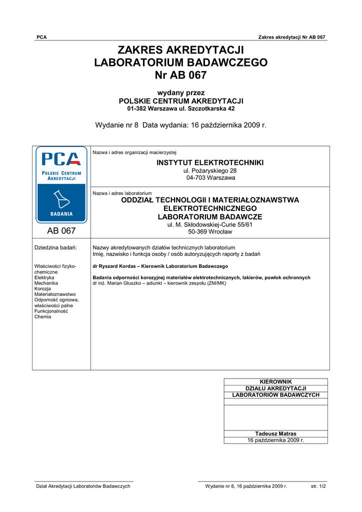 PCA Zakres akredytacji Nr AB 067 ZAKRES AKREDYTACJI LABORATORIUM BADAWCZEGO Nr AB 067 wydany przez POLSKIE CENTRUM AKREDYTACJI 01-382 Warszawa ul. Szczotkarska 42 Wydanie nr 8 Data wydania: 16 października 2009 r. Nazwa i adres organizacji macierzystej INSTYTUT ELEKTROTECHNIKI ul. Pożaryskiego 28 04-703 Warszawa Nazwa i adres laboratorium ODDZIAŁ TECHNOLOGII I MATERIAŁOZNAWSTWA ELEKTROTECHNICZNEGO LABORATORIUM BADAWCZE ul. M. Skłodowskiej-Curie 55/61 50-369 Wrocław Dziedzina badań: Nazwy akredytowanych działów technicznych laboratorium Imię, nazwisko i funkcja osoby / osób autoryzujących raporty z badań Właściwości fizykochemiczne Elektryka Mechanika Korozja Materiałoznawstwo Odporność ogniowa, właściwości palne Funkcjonalność Chemia dr Ryszard Kordas – Kierownik Laboratorium Badawczego Badania odporności korozyjnej materiałów elektrotechnicznych, lakierów, powłok ochronnych dr inż. Marian Głuszko – adiunkt – kierownik zespołu (ZM/MK) KIEROWNIK DZIAŁU AKREDYTACJI LABORATORIÓW BADAWCZYCH Tadeusz Matras 16 października 2009 r. Dział Akredytacji Laboratoriów Badawczych Wydanie nr 8, 16 października 2009 r. str. 1/2 PCA Zakres akredytacji Nr AB 067 Laboratorium Badawcze - badania odporności korozyjnej materiałów elektrotechnicznych, lakierów, powłok ochronnych dr inż. Marian Głuszko dr Ryszard Kordas Badane obiekty / Grupa obiektów Badane cechy i metody badawcze Normy i/lub udokumentowane procedury badawcze Powłoki lakierowe ochronne, nałożone Grubości powłoki – metody nieniszczące na PN-ISO 2808:2000, p. 11 na płytki testowe, metalowych podłożach magnetycznych oraz na elementy konstrukcyjne Przyczepność do podłoża metodą siatki nacięć PN-EN-ISO 2409:1999 Przyczepność do podłoża metodą odrywową PN-EN 24624:1994, PN-EN ISO 24624:2001 Powłoki lakierowe ochronne Odporność na uderzenie PN-EN ISO 6272:1999 nałożone na płytki testowe Zarysowania PN-65/C-81527 Ścieralność powłok za pomocą swobodnie PN-76/C-81516, Metoda A spadającego materiału ściernego Elastyczność. Pomiar przyrządem z PN-EN ISO 1519:2002 wymiennymi sworzniami o różnych średnicach Tłoczność. Próba tłoczności powłok PN-EN ISO 1520:2000 przyrządem Erichsena. Pomiary wykonywane na znormalizowanych próbkach testowych Twardość. Oznaczenie twardości powłok PN-EN ISO 1522:2001 wahadłem: metodą Köeniga lub Persoza. Pomiary wykonywane na znormalizowanych próbkach testowych Odporność korozyjna na działanie mgły solnej PN-EN ISO 9227:2007 Powłoki metaliczne i niemetaliczne nieorganiczne naniesione na płytki testowe Powłoki lakierowe naniesione na płytki testowe Wyroby elektrotechniczne: aparaty, zespoły, podzespoły itp. (obiekty o maksymalnych wymiarach: 1000×500×500 mm i maksymalnym ciężarze 50 kg) Powłoki lakierowe ochronne nałożone na płytki testowe Korozja pod wpływem działania mgły solnej PN-76/H-04603 Odporność korozyjna na działanie atmosfery z wilgotnym SO2 Odporność korozyjna na działanie atmosfery z wilgotnym SO2 Odporność korozyjna na działanie atmosfery nasyconej parą wodną Badania środowiskowe Próba Kb - mgła solna cykliczna Komora AEROSOL. Pomiary na obiektach o wymiarach maksymalnych 700×500×500 mm i maksymalnym ciężarze 20 kg. Komora HEREAUS-VOTSCH, HSK-1000 Odporność powłok lakierowych na sztuczne działanie atmosferyczne metodą ekspozycji na promieniowanie fluoroscencyjne UV i wodę PN-EN ISO 6988:2000 PN-EN ISO 3231:2000 PN-EN ISO 6270:2000 PN-EN 60068-2-52:2001 PN-EN ISO 9227:2007 Procedura Badawcza PB-24LB/IEl/OTiME, wyd. 3 z 01.09.2005 KIEROWNIK DZIAŁU AKREDYTACJI LABORATORIÓW BADAWCZYCH Tadeusz Matras 16 października 2009 r. Dział Akredytacji Laboratoriów Badawczych Wydanie nr 8, 16 października 2009 r. str. 2/2